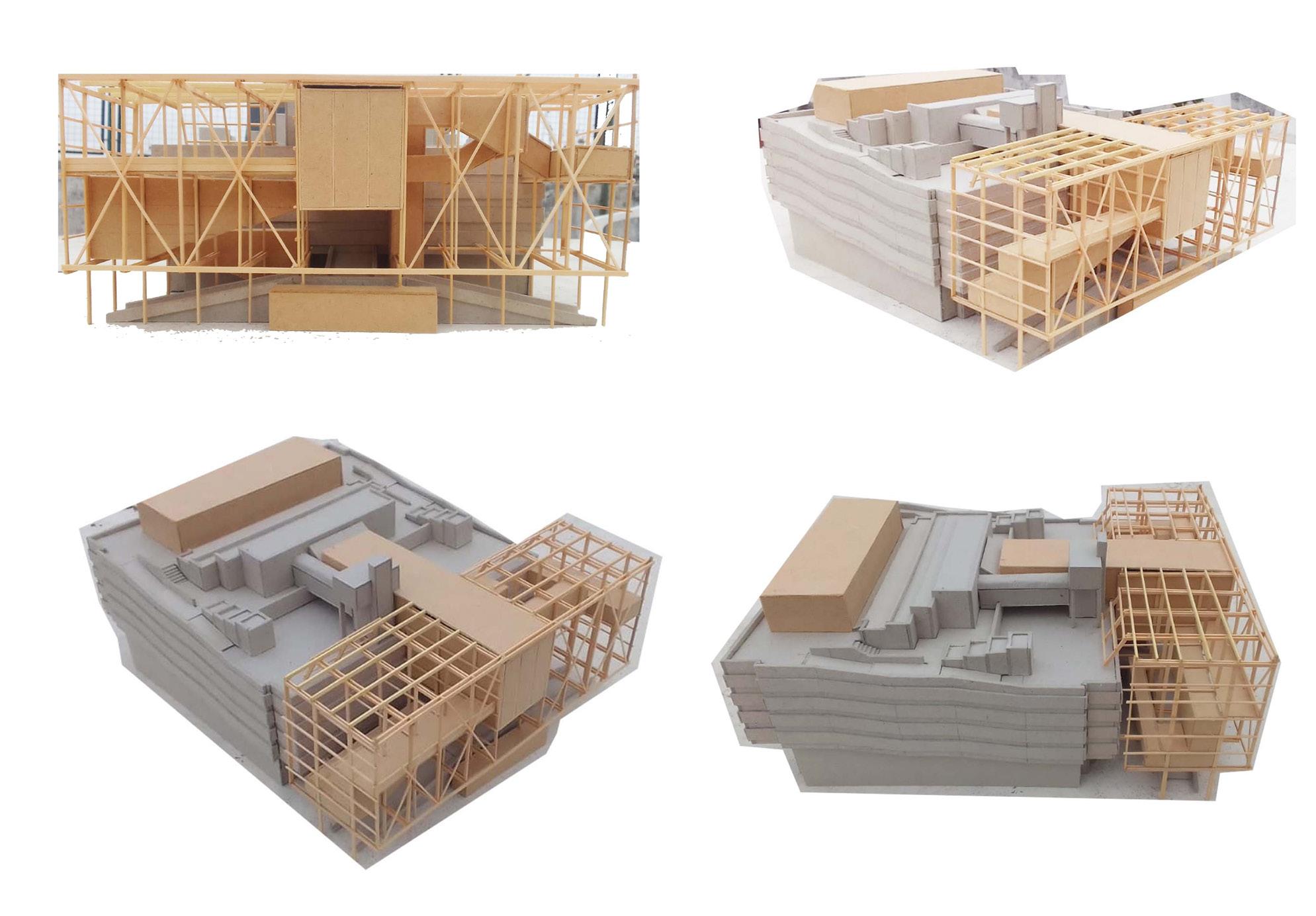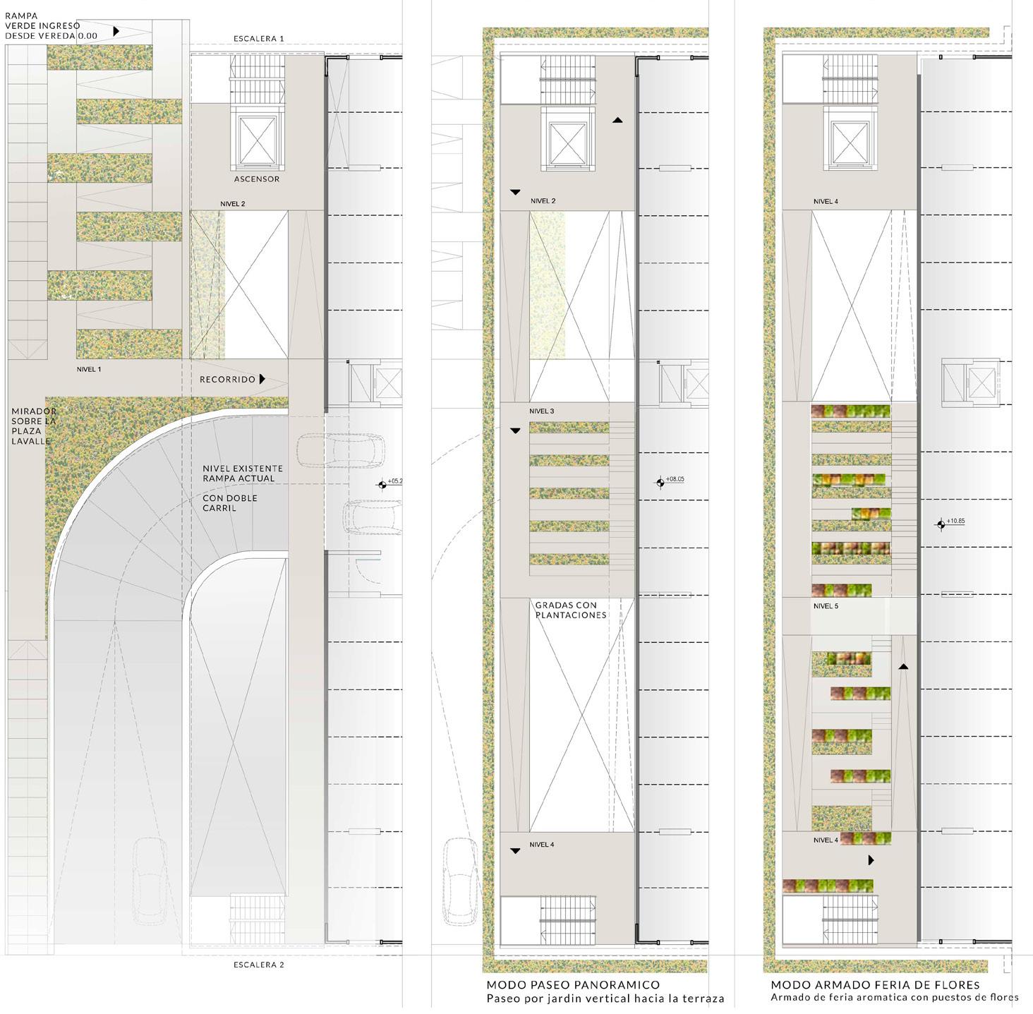 Espacio Cultural. A su vez, se articulan espacios para exposiciones, flexibles, espacios ajardinados e invernaderos, que enriquecen el paseo arquitectónico, hacen a la visión serial, incorporando diferentes y complejas perspectivas a medida que se recorre, junto con la visual de la Plaza y la ciudad, rematando en Espacios Miradores. A su vez, la grilla permite diferentes usos urbanos en relación a la Plaza, como poder colgar y presentar instalaciones, que se produzcan en el espacio cultural o pantallas para ver películas o partidos, logrando un nuevo espacio de convocatoria en el tejido. Centro Cultural. La grilla permite ordenar también el nuevo espacio cultural de la terraza. Se recuperan los edificios existentes pertenecientes al Concejo Deliberante, valorando la espacialidad, interviniendo los cerramientos de los espacios para ganar fluidez y adaptabilidad. Se reemplaza el volumen de chapa por un nuevo volumen que albergará el SUM, que puede utilizarse tanto como parte del Centro Cultural como de forma independiente para distintos eventos, y se añaden nuevos volúmenes articulados a los existentes, para proponer espacios de producción artística-talleres, integrados a los espacios exteriores de la terraza, que también permiten realizar actividades al aire libre. Sistemas de rampas facilitan salvar la diferencia de niveles que presenta la terraza, garantizando la accesibilidad y articulando los distintos volúmenes, permitiendo la continuidad espacial y
