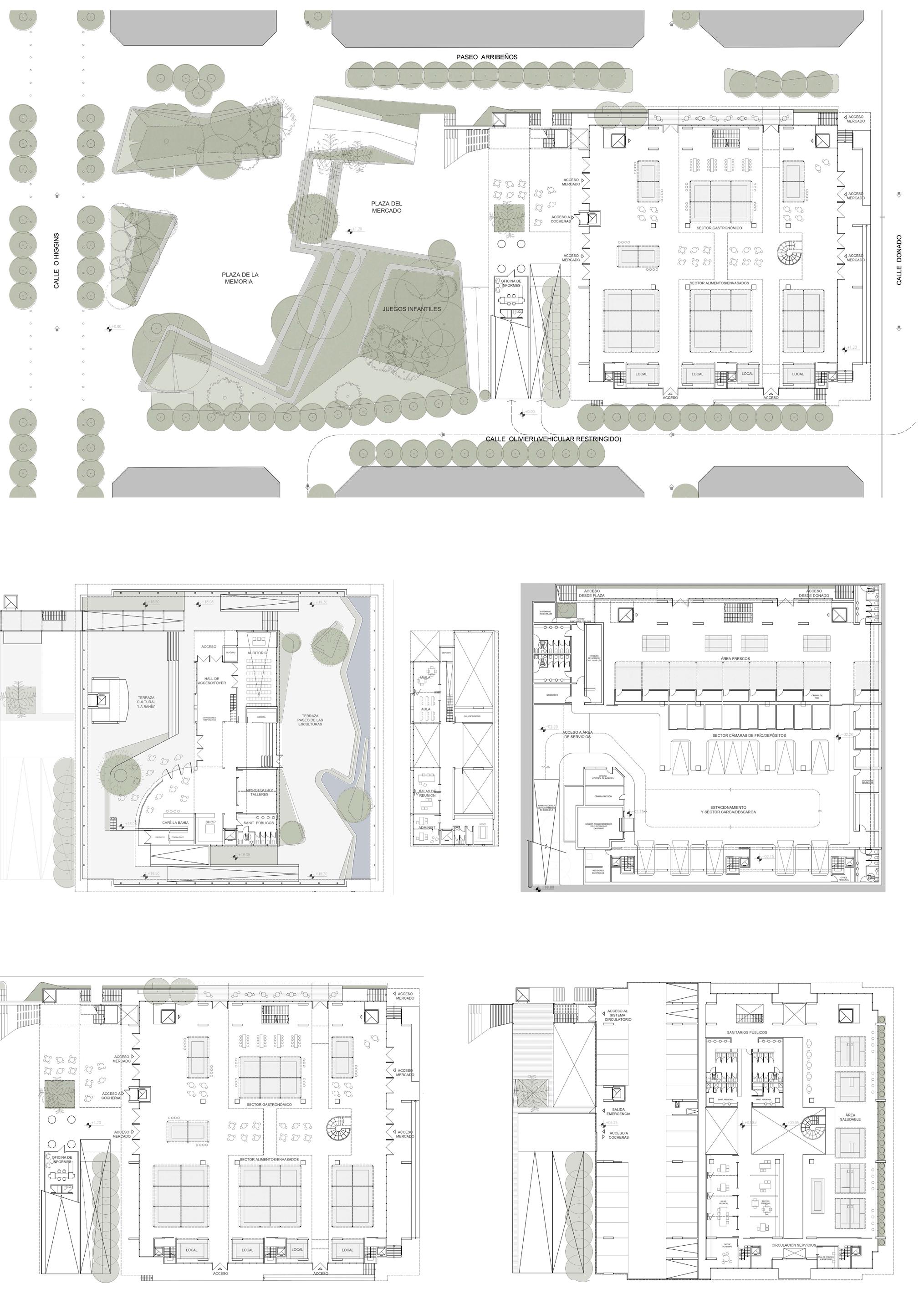 tual nivel +1.20 del Mercado, conduciendo de forma natural y casi imperceptible al peatón y desde allí dar cabida a una gran variedad de acontecimientos urbanos. La continuidad de la superficie es una estrategia formal que hemos elegido aplicar a todos los niveles del diseño. Es el mismo material que configura de acuerdo a su ubicación estratégica o su forma, los espacios de juegos para niños, los sectores de sombra, los espacios de gastronomía, el espacio de la memoria y el anfiteatro. Los paseos peatonales adyacentes al Mercado son tratados de acuerdo al mismo concepto.