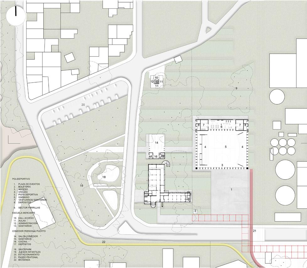 En este sector se concentran las actividades administrativas propias del puerto y el comedor y la actividad social de un polideportivo con preexistencias identitarias de la zona. Se desarrolló un sistema de cerramientos asociados al recinto que permitirán utilizar el espacio público o privado, de acuerdo a las necesidades.