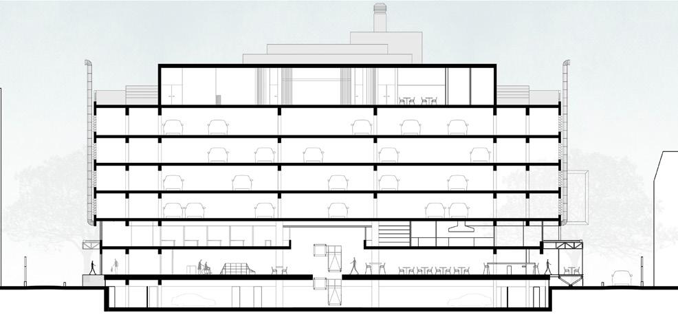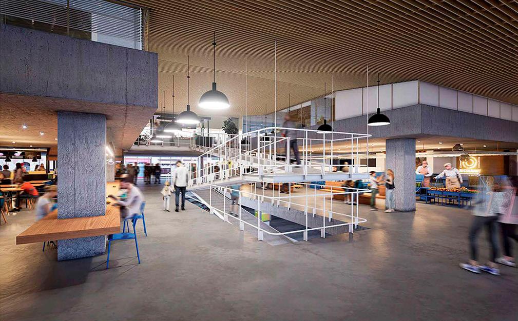largas visuales, que rematan en los edificios del entorno. Mercado. Se repiensa el Mercado como un espacio de planta liberada, fluida, donde instalar nuevos puestos que se articulen con espacios gastronómicos de forma directa. Los puestos serán sistemas modulares que sean fácilmente modificables y se repiensa la circulación de forma más libre, manteniendo la disposición de los núcleos actuales, que garantizan la conexión con el subsuelo -que mantendrá su vocación de servicio al espacio principal-: espacios de depósito y salas de máquinas. Los cerramientos, que originalmente se encuentran sobre el perímetro, se llevan hacia atrás, permitiendo la aparición de espacios de terraza, que podrán ser utilizados con fines gastronómicos o como puestos de venta, que proponen otra relación con el espacio-calle, mejorando la vinculación con la planta baja. Se recupera también el entrepiso, instalando espacios de coworking y oficinas en las secciones de mayor altura, articulados por una nueva escalera con la planta principal. Plaza. Se lleva toda la plaza a nivel 0, con ondulaciones en los espacios de vegetación, que permite la accesibilidad y libre recorrido de todo el ámbito. Se proponen espacios de juego, de descanso y un playón en relación directa con la fachada Grilla, donde se puedan desarrollar asambleas, actividades sociales y culturales. Se adiciona vegetación a la existente y se proyecta una estructura tipo pérgola en el perímetro, que hace a la continuidad