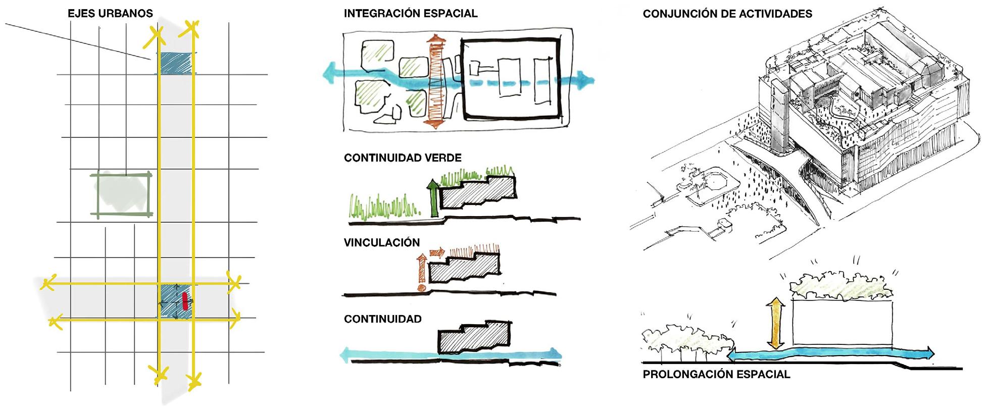 Se busca generar una gran plaza que pueda contener y condesar un paisaje cultural, social y natural, creando identidad y sentido de pertenencia en la población, concepto fundamental pensando en la integración entre la ciudad, la arquitectura y los habitantes, en una relación directa a la temática del edificio en cuestión. Se propicia espacio público de calidad con equipamiento de intercambio en relación a los aspectos anteriormente mencionados y se caracterizan de la siguiente manera, siguiendo el concepto de patios e islas como lugares de apropiación: