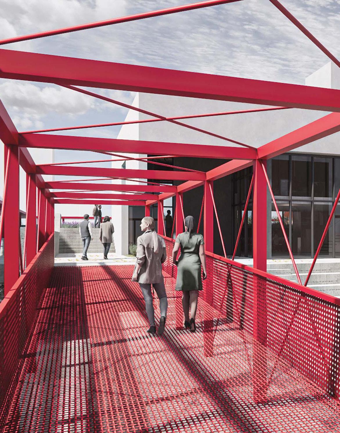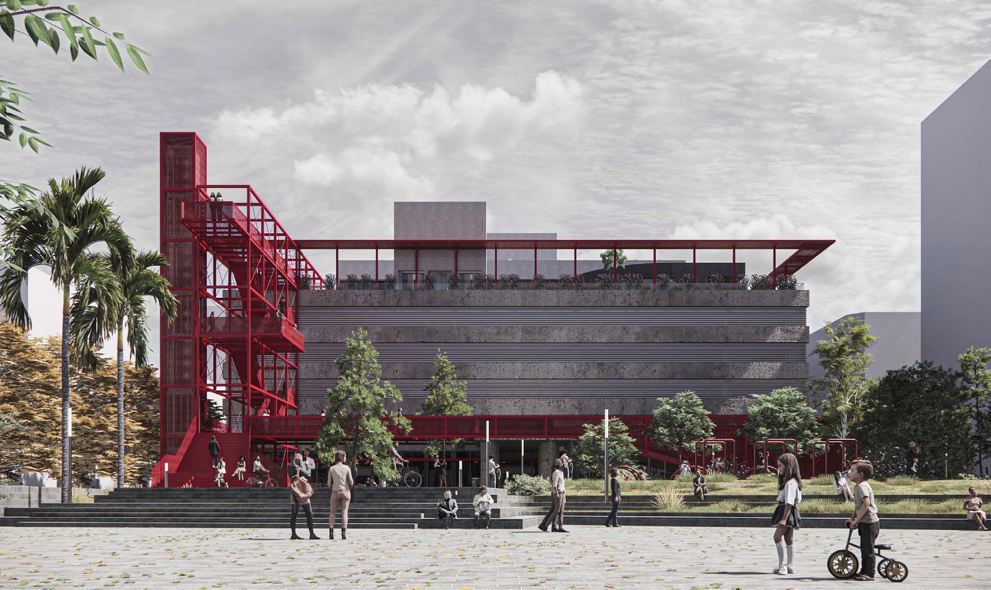 La decisión expresada en las bases de generar un sistema de movimientos por fuera del edificio que comunicara la Plaza con el futuro Centro Cultural en el último nivel, no está exento de la estrategia utilizada para el desarrollo de nuestro trabajo. Para ello, diseñamos una estructura metálica que no solamente contenga las escaleras y el ascensor, sino que sea un espacio recorrible y de usos alternativos y complementarios a la Plaza, el Mercado y el Centro Cultural. Un sistema de movimiento en vertical que alterna “plazas en altura”, donde se ubican esculturas de artistas locales y regionales. Cada plaza es un espacio de espera y descanso del recorrido, que permite al visitante tener una vista diferente de la ciudad y del “área centro”, situación inexistente hasta el momento en algún otro espacio público de la ciudad.