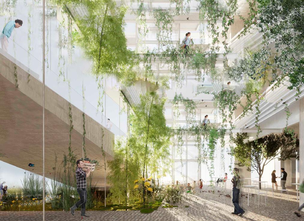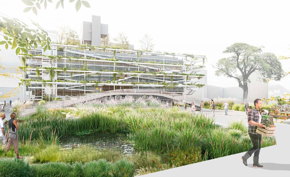 Se proponen distintas estrategias de diseño sostenible, entendiendo la sostenibilidad a partir de la vinculación entre la naturaleza, la economía del lugar, la salud y la dimensión social, siendo la institución un aporte a la mejora de la calidad del habitar urbano y con un rol importante en el tejido de la ciudad. Vegetación. Se incorpora vegetación autóctona en la Plaza, en los invernaderos y en la terraza verde, con el objetivo de humidificar el ambiente, contribuir a la disminución de la isla de calor y mejorar la calidad del aire, con el consiguiente beneficio para los habitantes, disminuyendo la posibilidad de enfermedades respiratorias, así como también a potenciar la aparición de agentes polinizadores. La terraza verde colabora con la retención del agua de lluvia y disminuye la velocidad de las escorrentías, previniendo inundaciones, especialmente en un contexto actual, donde asistimos a un aumento anual del régimen de precipitaciones. La vegetación de hoja caduca colabora a refrescar espacios interiores y fachadas, funcionando como tamiz y parasol en verano y dejando pasar los rayos en invierno, para poder aprovechar las ganancias de calor durante las horas de sol. A su vez, se alternan especies, incorporando árboles frutales y desarrollando huertas, con el objetivo de buscar una “autosuficiencia alimentaria”. Esta idea se potencia con el invernadero, donde se cultivan especies que requieren de determinadas regulaciones climáticas, intentando acercarnos a una economía circular, ya que los cultivos urbanos mejoran la vida en la comunidad. Los espacios verdes mejoran también la salud, el estado de ánimo -a través de espacio terapéutico de re-