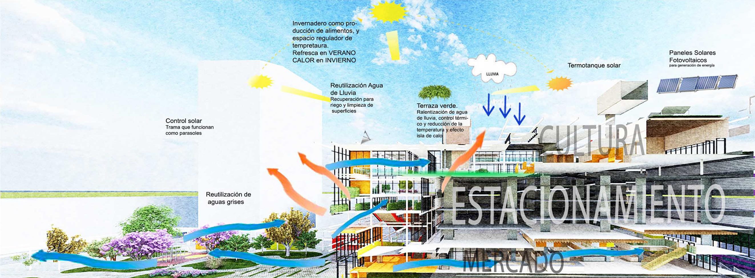 Propuesta bioclimática edilicia. Sustentabilidad. Como hemos mencionado anteriormente en relación a las cuestiones urbanas y paisajísticas -como la generación de una gran isla de biodiversidad-, en esta ocasión enunciaremos diferentes estrategias en relación a lo edilicio: Aislación térmica de la envolvente edilicia. En relación al Centro Cultural y su acondicionamiento, se restringen pérdidas térmicas por conducción. Se incorpora aislación térmica en la envolvente edilicia: muros, cubiertas, pisos y aberturas. Con estas medidas, se contempla el criterio de “conservación de la energía”, minimizando el sobrecalentamiento estival y el acondicionamiento invernal. Radiación solar. Para verano se propone en el Centro Cultural, espacio más expuesto a las fuertes radiaciones, el control