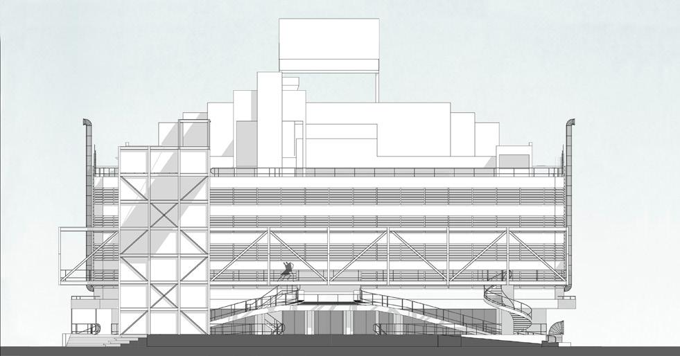 Espacio Funcional. La planta libre, a partir del reconocimiento de la estructura independiente, otorga diferentes posibilidades de armado de los espacios, garantizando la flexibilidad y posibilidad de modificar de forma fácil, lo que en un mercado es esencial. Por otro lado, el funcionamiento del subsuelo, como espacio que “sirve” al espacio del Mercado, es un dato que se tiene en cuenta para la intervención. Rampas. Las rampas, si bien son un elemento que genera una barrera urbana en la relación entre el espacio-mercado y la Plaza, son una característica particular del edificio. Por lo tanto, se incorporan al proyecto, garantizando su normal funcionamiento. A partir de entender estos elementos de la preexistencia, se proyecta la intervención, centrando las acciones en la Plaza, el espacio sobre las rampas, el Mercado con su entrepiso y la terraza. Se proyecta una gran Grilla Espacial, interviniendo con un lenguaje contemporáneo, que se diferencie de lo existente, dando cuenta del momento de la intervención. La Grilla será el elemento articulador, proponiendo una nueva fachada hacia la Plaza, redefiniendo la escala del espacio y otorgando una imagen institucional. Se propone una estructura metálica que se ordena de forma modular y permite generar los elementos circulatorios, escaleras y ascensores, para acceder al nuevo