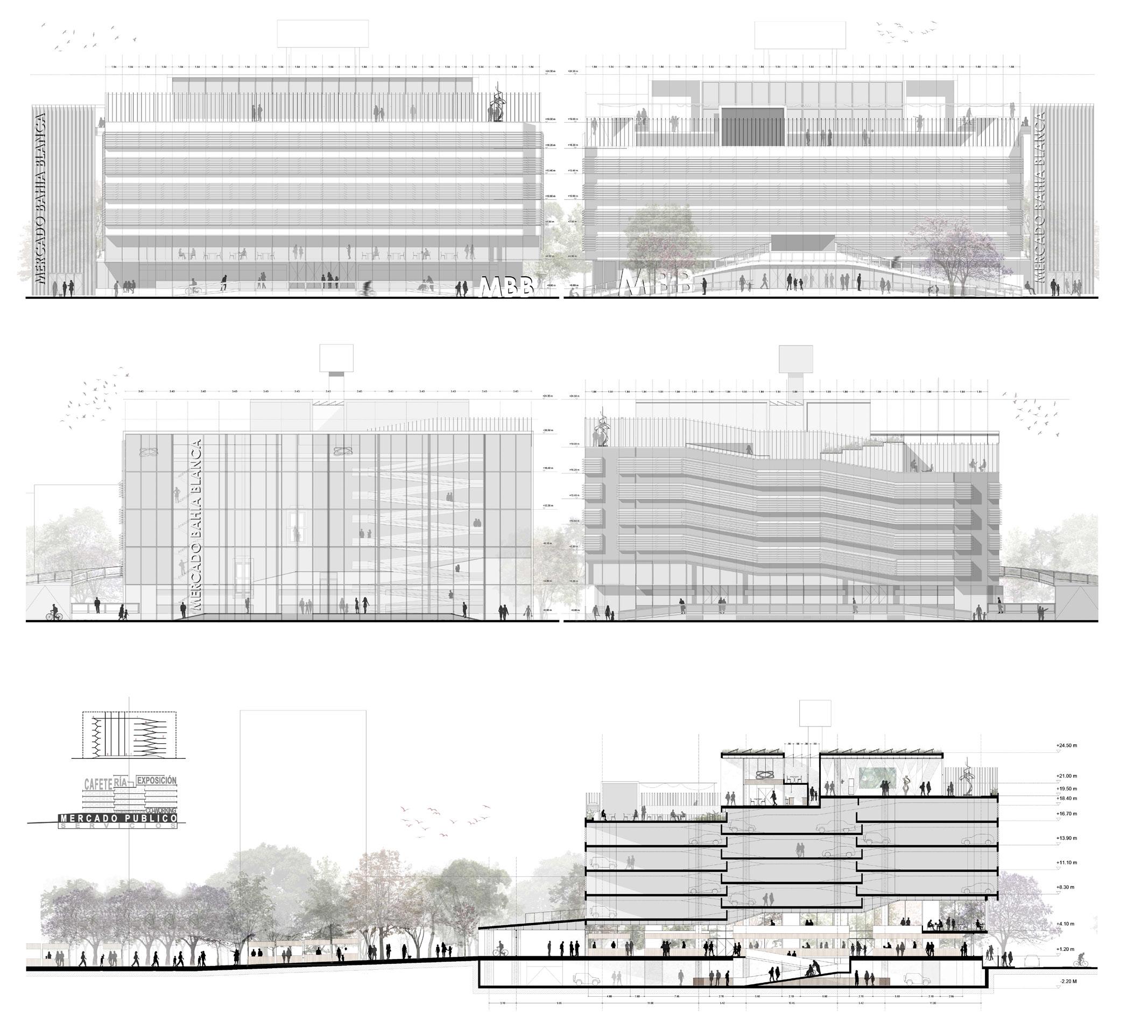 La recuperación del Mercado Municipal de Bahía Blanca implica repensar la institución del mercado y su rol en la recualificación del lugar urbano, reforzado por la incorporación de nuevos usos culturales. Se piensa el proyecto a partir del concepto del Jardín en cuatro instancias que guiarán la intervención: Plaza-Jardín, repensando la Plaza del Sol, Jardín Vertical -que conformará la nueva fachada del Mercado-, Mercado-Jardín y Jardín Cultural. Generar jardines en la ciudad busca mejorar la calidad de vida de los habitantes, permitiendo la aparición de vegetación y espacios de descanso, especialmente en áreas céntricas, donde la densidad es mayor.