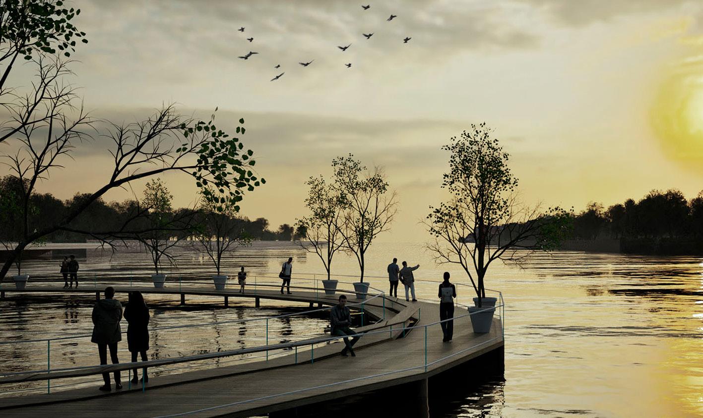 Estructura de conectividad. Orientada a restablecer el orden de los flujos (de logística industrial, transporte público, vehículos particulares, vehículos no motorizados y senderos aeróbicos peatonales), se incorpora para vincular el sitio como una pieza que ofrezca diferentes experiencias de aproximación y recorrido. Son los senderos que recorren la reserva y los jardines los que llevarán la carga de convocar a deportistas, turistas y trabajadores según los momentos y eventos que la nueva vida del puerto proponga. El río y los canales. Nuevos espacios recuperados para el ocio y la práctica deportiva.
