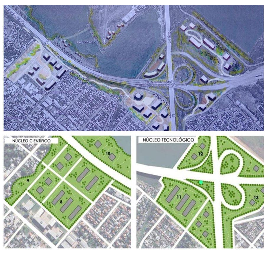 de la cinta que conforma no solo la Autopista (como traza de conectividad) sino también por el diseño de un Paseo Parque Ambiental que, a manera de soporte paisajístico, crea estaciones, nodos, plazas secas, terrazas verdes, imbricando distintos edificios funcionales al programa regional, cuyo valor agregado es la Reconfiguración de áreas residenciales en proceso de degradación/estancamiento (barrios en torno al Mercado Regional y áreas de borde) y la Re-naturalización de áreas ambientalmente deterioradas (lagunas emergentes de su estadio de cavas).