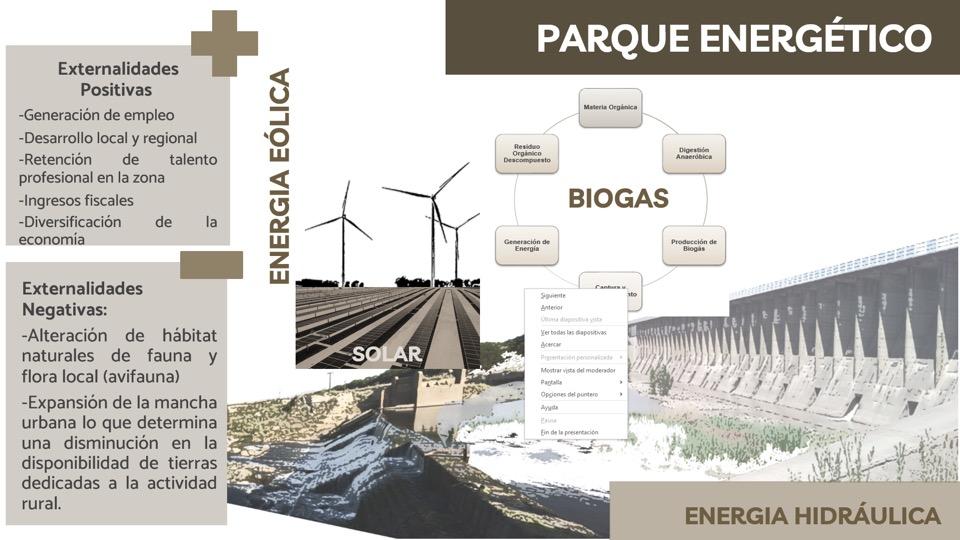 El desarrollo del proyecto se llevará a cabo en varias etapas a lo largo de un período de 6 años, culminando con la instalación de 450 MW de capacidad total. La planta, que ocupará inicialmente 10,000 hectáreas en su fase I, contempla fases expansivas que incluyen la construcción de una línea de transmisión de 27 kilómetros con una tensión de 220 kV para conectar la subestación del proyecto con el SADI. El propósito principal de este proyecto innovador es generar energía eléctrica a partir de fuentes sostenibles, contribuyendo así al cuidado del medio ambiente y al desarrollo sustentable de la provincia. Se proyecta la creación de un corredor verde que no solo permite cambios de programa diversificados, sino que también enriquece la integración natural y patrimonial de la zona, transformándola en una unidad de paisaje integral e integrando el binomio campo-ciudad mediante la unidad de parque agrario. Además, respalda la política nacional de desarrollo de energías renovables no convencionales, propiciando la soberanía energética, la urbanización controlada y sirviendo como motor para políticas de desarrollo económico y productivo.
