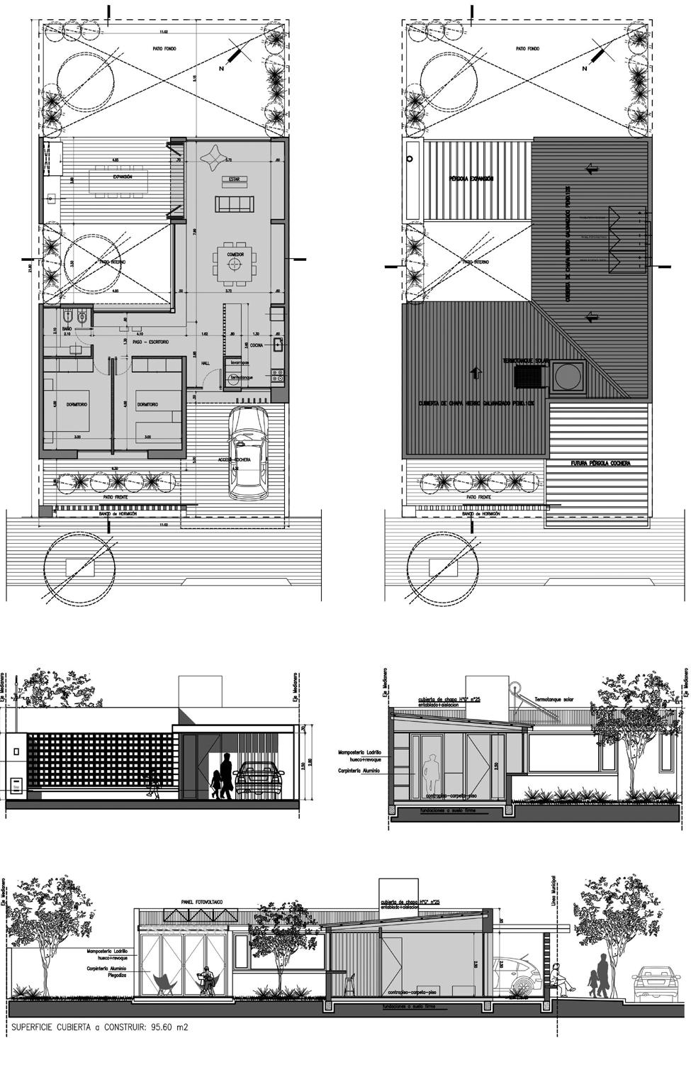 relaciones entre la calle, el interior y el fondo del lote. La propuesta, más allá, de su adscripción tipológica, de su rigor geométrico-dimensional y de su simplicidad constructiva, es un espacio que facilita diferentes apropiaciones y que apela a una forma ancestral de vivir, que no es otra cosa que un patio a la espera de ser habitado, tal vez a la espera de alguien que mire a través de él, el recorte de un cielo pampeano desde la seguridad de su morada.”