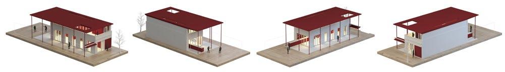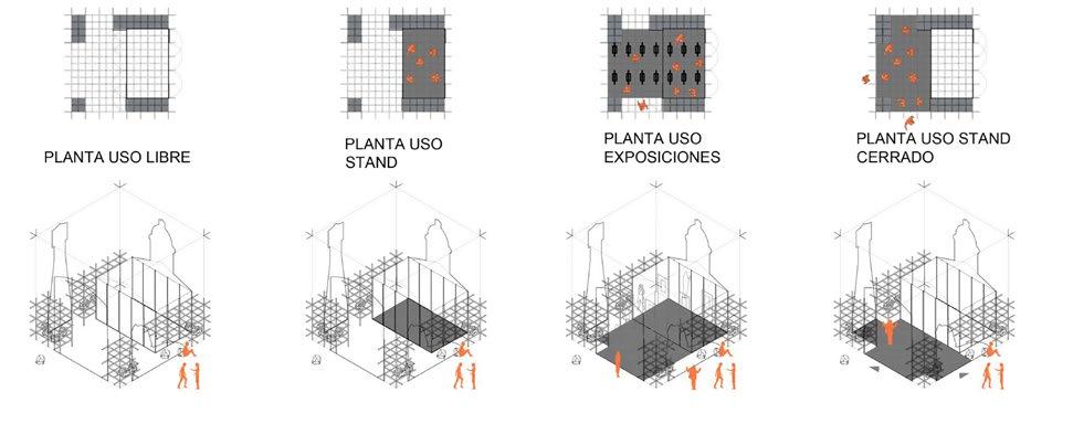 de las imágenes, permiten delimitar un lugar posible de ser cerrado para actividades de información o consultas. La cubierta de este lugar es de lona acrílica similar al usado en las carpas de playa. La idea es que este sitio permanezca abierto, formando parte de la acción expositora.