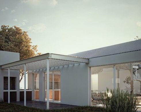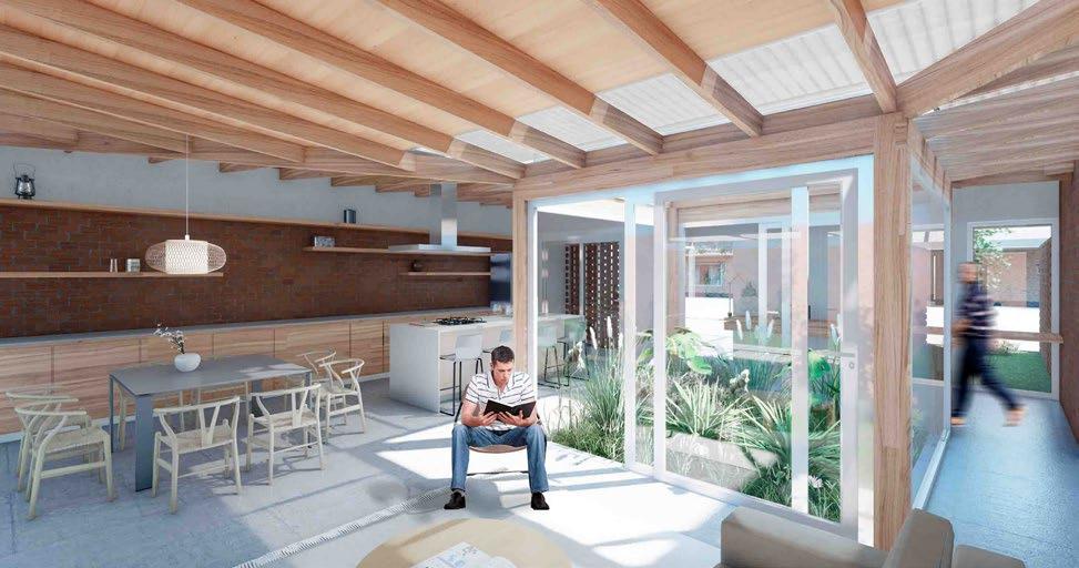 micamente por las vigas, que estructuran y definen el sistema constructivo en las áreas principales de la vivienda. Esto permite una gran flexibilidad espacial. La estructura está formada por vigas y columnas de hormigón armado, combinadas con una cubierta liviana de chapa (80%) que facilita la construcción y contribuye a la eficiencia energética del hogar. Sostenibilidad. Este prototipo se concibe como una estructura sostenible de rápido despliegue, basada en una tecnología tradicional que mantiene un equilibrio entre los aspectos ambientales y económicos. Se complementa con sistemas pasivos de climatización, lo que optimiza el confort interior y la eficiencia energética, minimizando el impacto ambiental y el consumo de recursos.