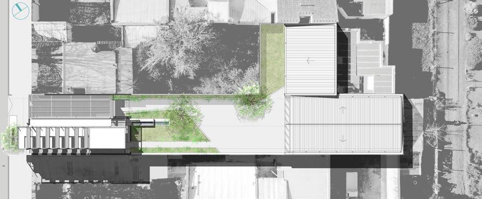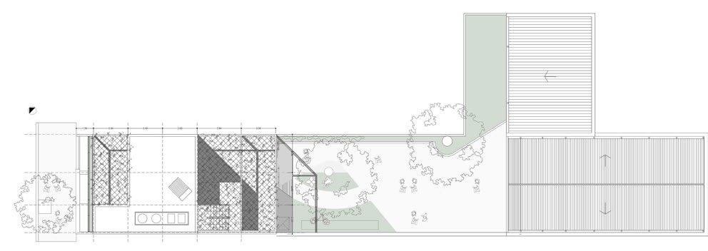 Estrategias de distribución. La disposición de los espacios se organiza en tres bandas programáticas a lo largo del lote, siguiendo su eje longitudinal: