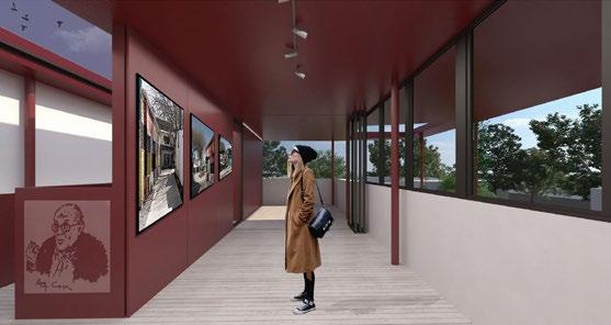 “cuelgan” de la trama de vigas. Esta trama no llega al piso, para enfatizar su condición etérea y momentánea, buscando que el interior del artefacto se convierta en un espacio de intercambio sensorial, entre el ámbito generado por él y la historia que cuentan las 15 obras, la retícula originaria envueltos en un lienzo semivelado.
