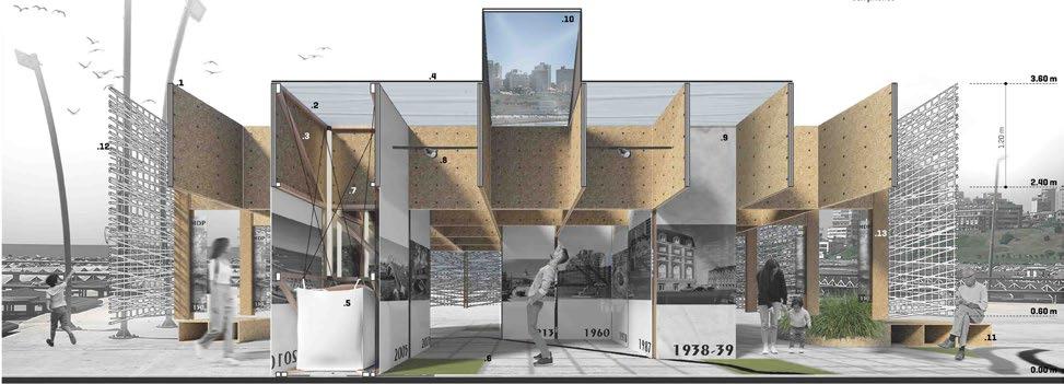 dirección costera propia de la intervención en Varese. Este dibujo toma expresión tridimensional en una trama (de módulo de 1,20x1,20 metros), de vigas de placas de OSB estructural de tres secciones de 18 mm., desfasadas para producir las uniones entre tramos de viga. Esta trama está sostenida por ocho módulos cuadrados que hacen las veces de columnas y bases, conteniendo en su tramo inferior “muertos” de arena, que hacen de contrapeso a la estructura de vigas y sin alterar la superficie del sitio de intervención. Esta estructura es de secciones de 3”x 3”, de pino multilaminado secado y estabilizado para columnas, y en secciones de 2”x 4”, para las diagonales. En el tramo inferior se conforma una “caja” en OSB que se llenará de arena, a modo de ancla de la estructura, arriostrada por cables de acero de alma textil con uniones de eslingas guardacabos, tensores y grilletes. Completa el sistema un módulo banco-cajón de arena-macetero, que hace las veces de asiento-fundación-vegetación, ofreciéndose como un elemento de vinculación exterior e interior. Estos módulos son utilizados como soporte para contar una historia que hilvane las etapas de desarrollo de la ciudad y el patrimonio edilicio a través de 15 obras de los 15 decenios de historia de la ciudad. Estas columnas dejan libre el perímetro, que se cierra con una trama textil de cabos trenzados, propios de las artes de pesca, reutilizado de las sobras de esta actividad. Lo textil hace del objeto arquitectónico un “canasto”, en alusión a los “medios mundos” hechos en cestería, o a la típica silla playera marplatense, también utilizando el mismo medio expresivo. El límite alude así al perfil productivo de la ciudad, complejizando la visión común de ciudad turística. Estos cabos están unidos por pitones y tensores a “costillas” de OSB que