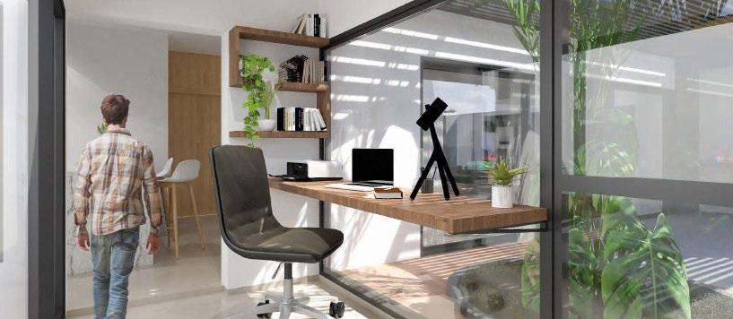 • Espacio exterior utilitario, que funciona como extensión natural del interior, permitiendo actividades al aire libre. La planta es compacta y eficiente, minimizando recorridos y aprovechando al máximo la superficie disponible. La relación entre los espacios interiores y exteriores refuerza la idea de continuidad y apertura. Este sistema modular permite proyectar una vivienda no como un objeto cerrado, sino como un organismo abierto y adaptable. La flexibilidad del diseño modular hace posible que, ante cambios en las necesidades familiares, la vivienda pueda crecer sin comprometer su coherencia arquitectónica.