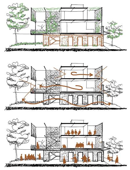 la acumulación de calor en verano. Esta estrategia, complementada con el uso de patios interiores y exteriores, asegura una ventilación e iluminación naturales, maximizando el confort con un bajo impacto ambiental.