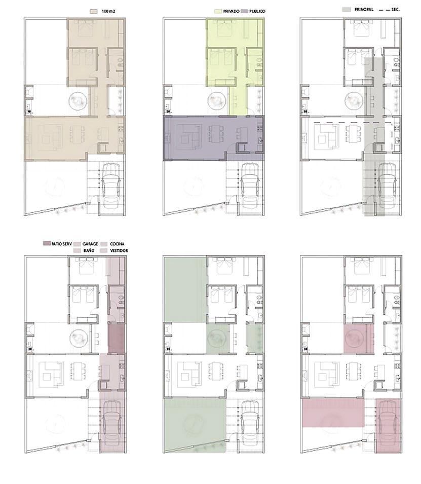 Versatilidad. La vivienda está pensada como un módulo habitacional flexible que puede adaptarse a diferentes tamaños de terreno y necesidades programáticas. Las bandas programáticas pueden ampliarse o modificarse según las exigencias del