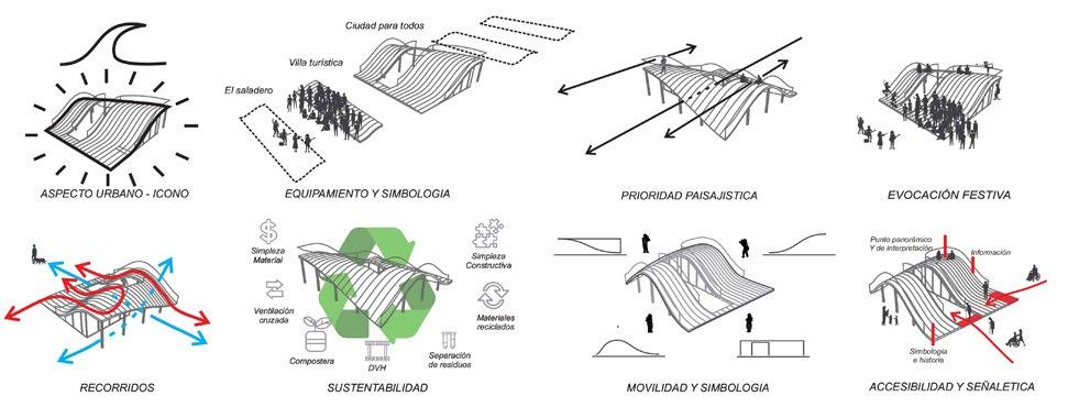 un objeto-arquitectura que sirve como ícono y punto de referencia posible de identificar al caminar o movilizarse en auto, bicicleta, o desde la vereda, la playa o la avenida Patricio Peralta Ramos. Es a través de la forma que se prioriza y potencia el paisaje y permite visuales ininterrumpidas a nivel peatón. Crea así nuevas perspectivas por medio del mirador que posibilita su cubierta terraza. Esta accesibilidad al paisaje es especialmente tangible a través de un diseño universal que resuelve los problemas desde una visión holística. Así pues, hay suaves ondulaciones y rebajes en las superficies que eliminan escalones, barandas multi altura, aperturas amplias, señalética con iconografía significante, entre otros diseños, que permiten usar el espacio a personas con capacidades diferentes y reducidas. Estas estrategias y el objeto en su totalidad siguen principios de diseño universal tales como: igualdad de uso, flexibilidad, simpleza e intituividad, información fácil de recibir, tolerancia a errores, escaso esfuerzo físico, dimensiones apropiadas.