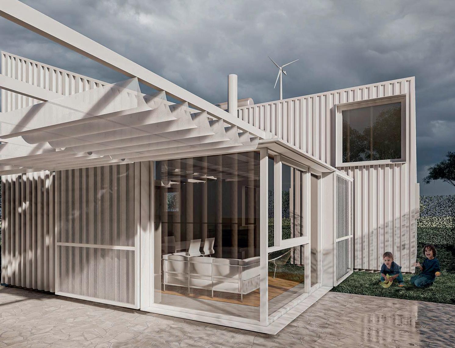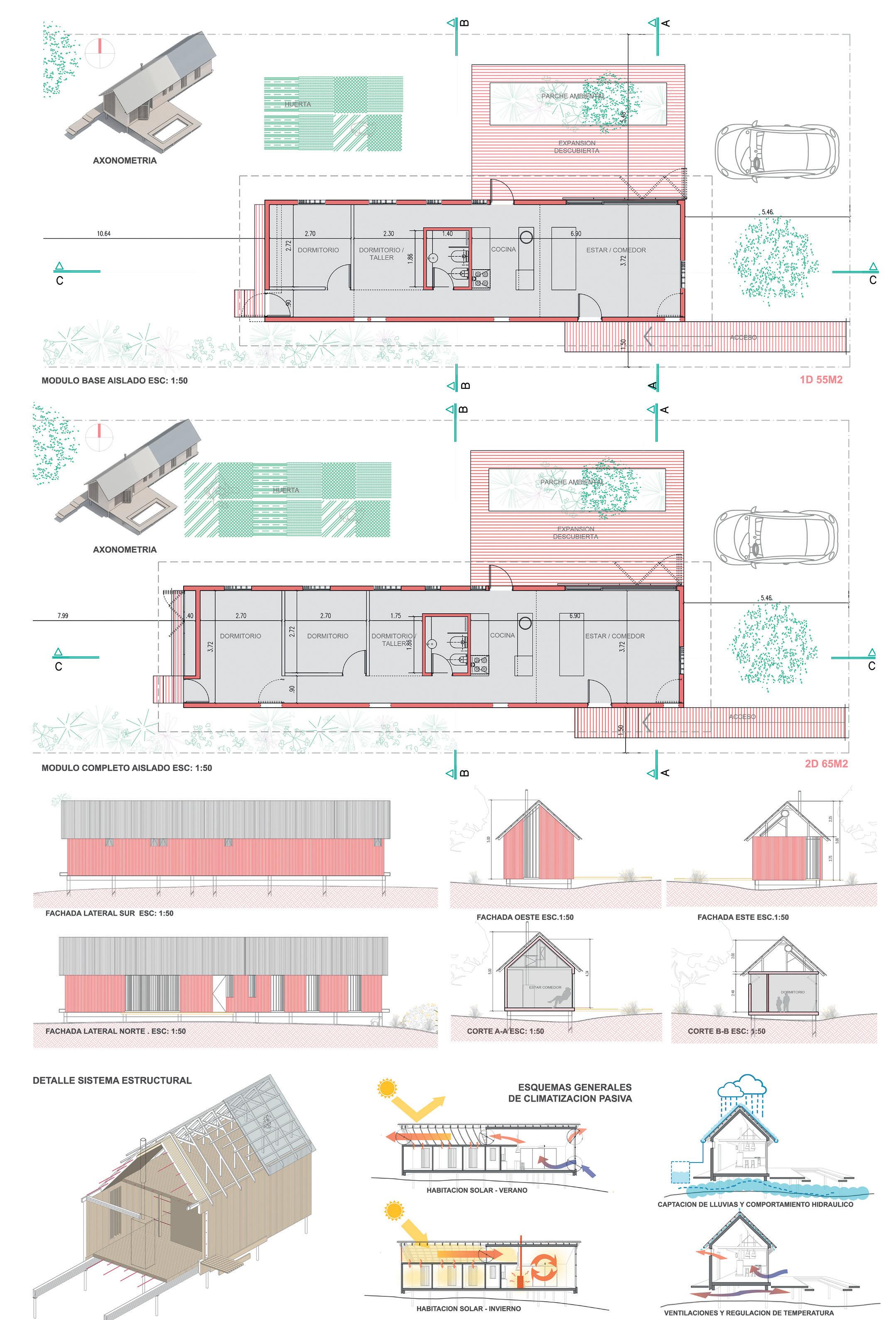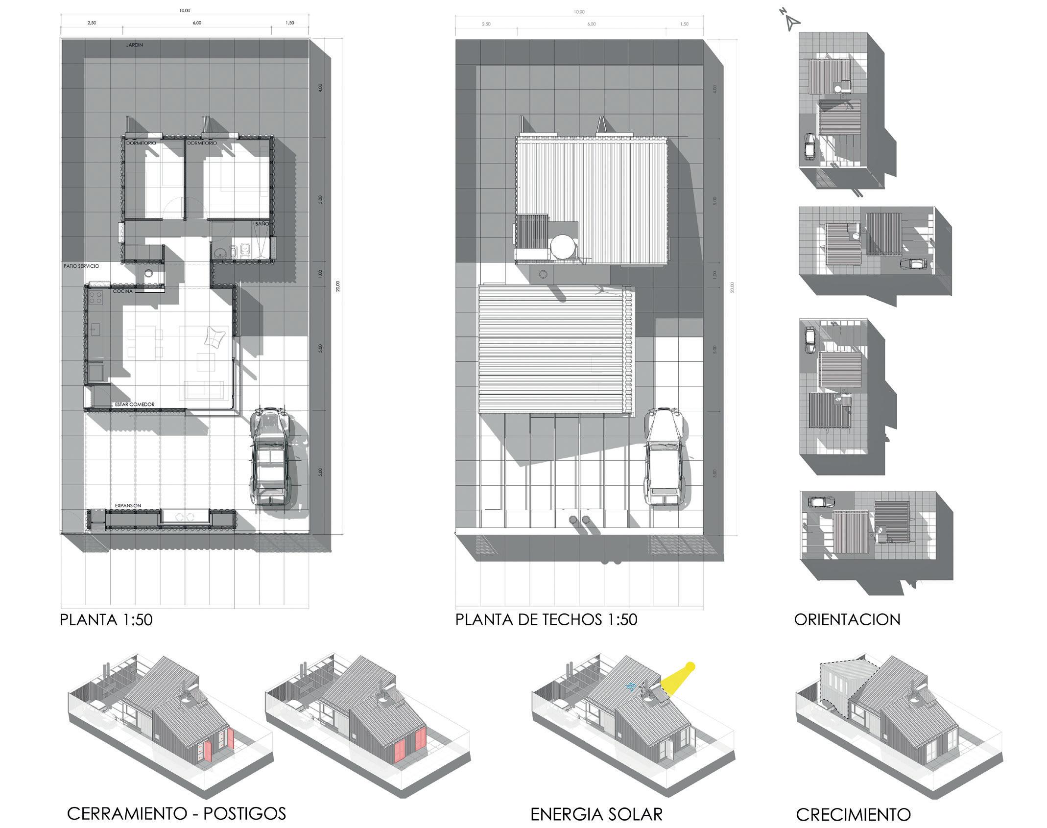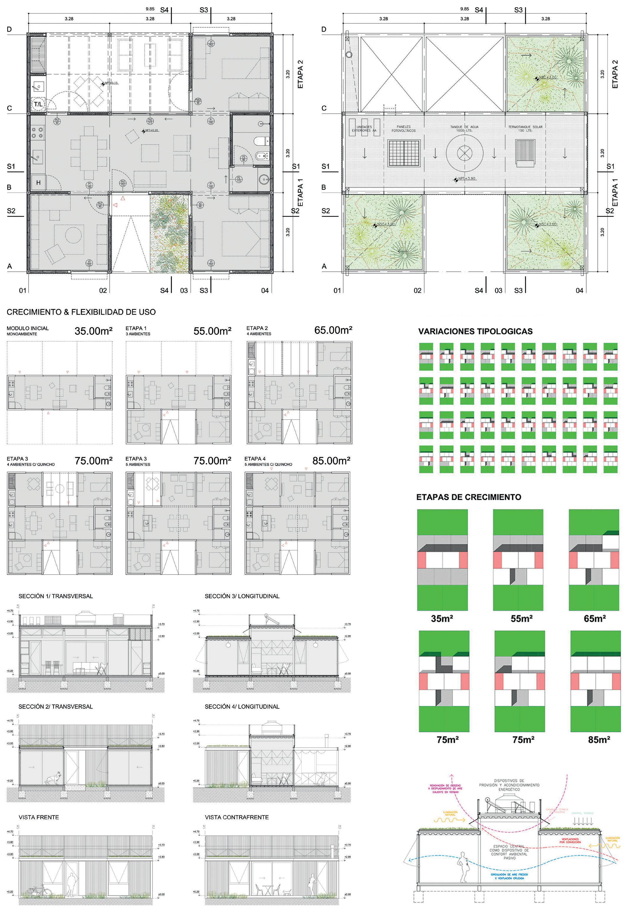 mado completamente en taller, o en piezas independientes que se ensamblan en el sitio. Los elementos fijos son de escala pequeña: el cuerpo sanitario, los módulos de equipamiento (integran áreas de servicio y mobiliario configurable). El resto se compone de paneles ciegos, carpinterías y estructuras de transición. El hábitat inicial ofrece una solución primaria (60 m2), que permite el inicio del ciclo, y a partir de esa primera operación, el sistema aporta multiplicidad de variantes acoplando módulos que se adosan hacia el frente tanto como hacia arriba, hasta conformar una unidad de máxima, que ronda los 155 metros cuadrados cubiertos