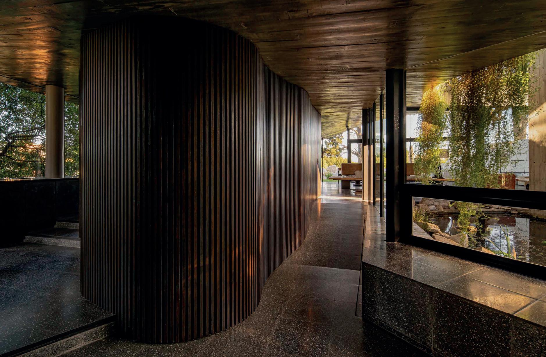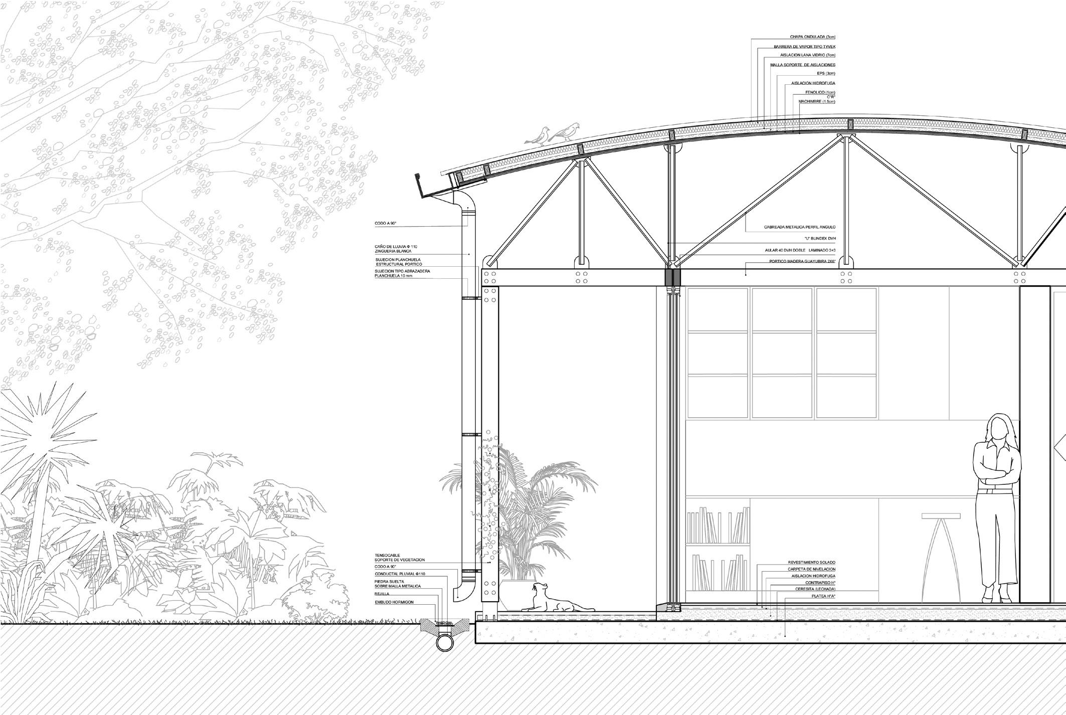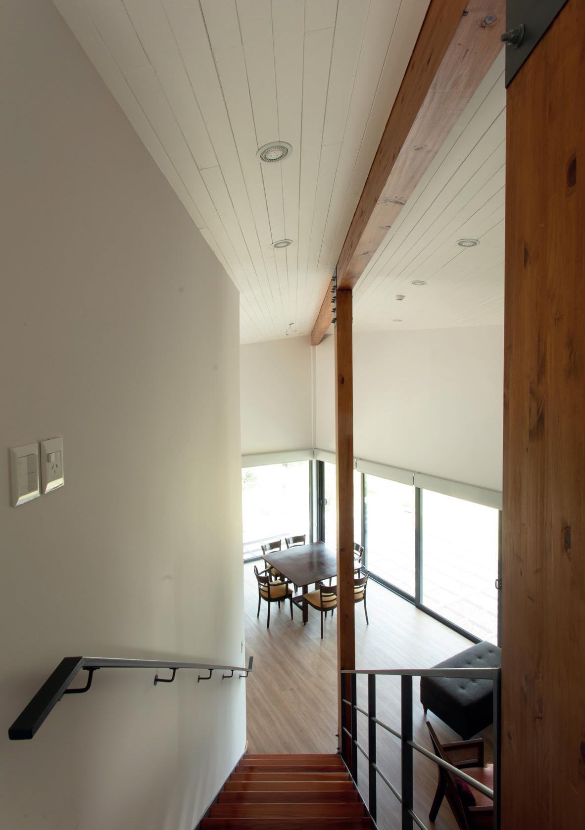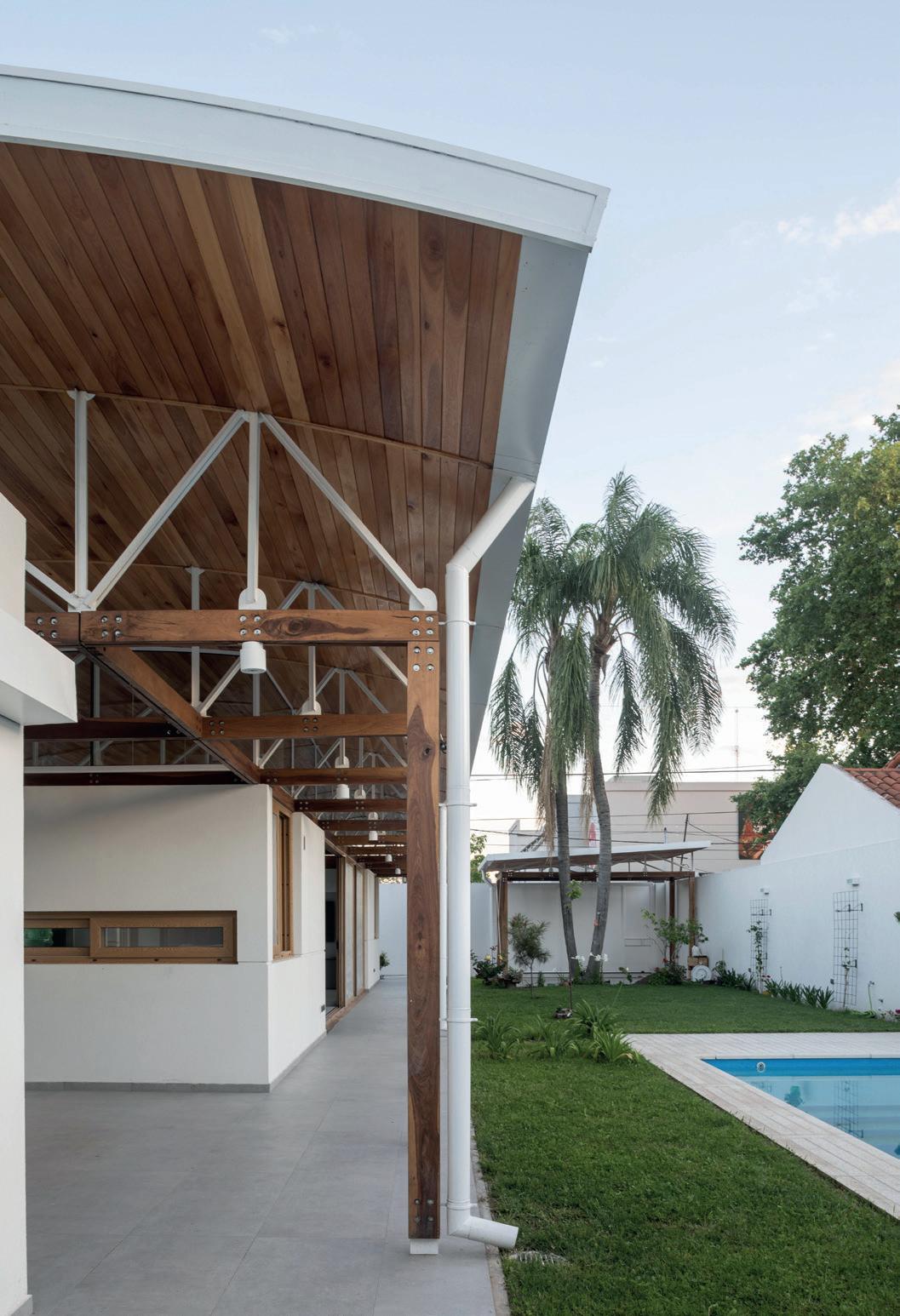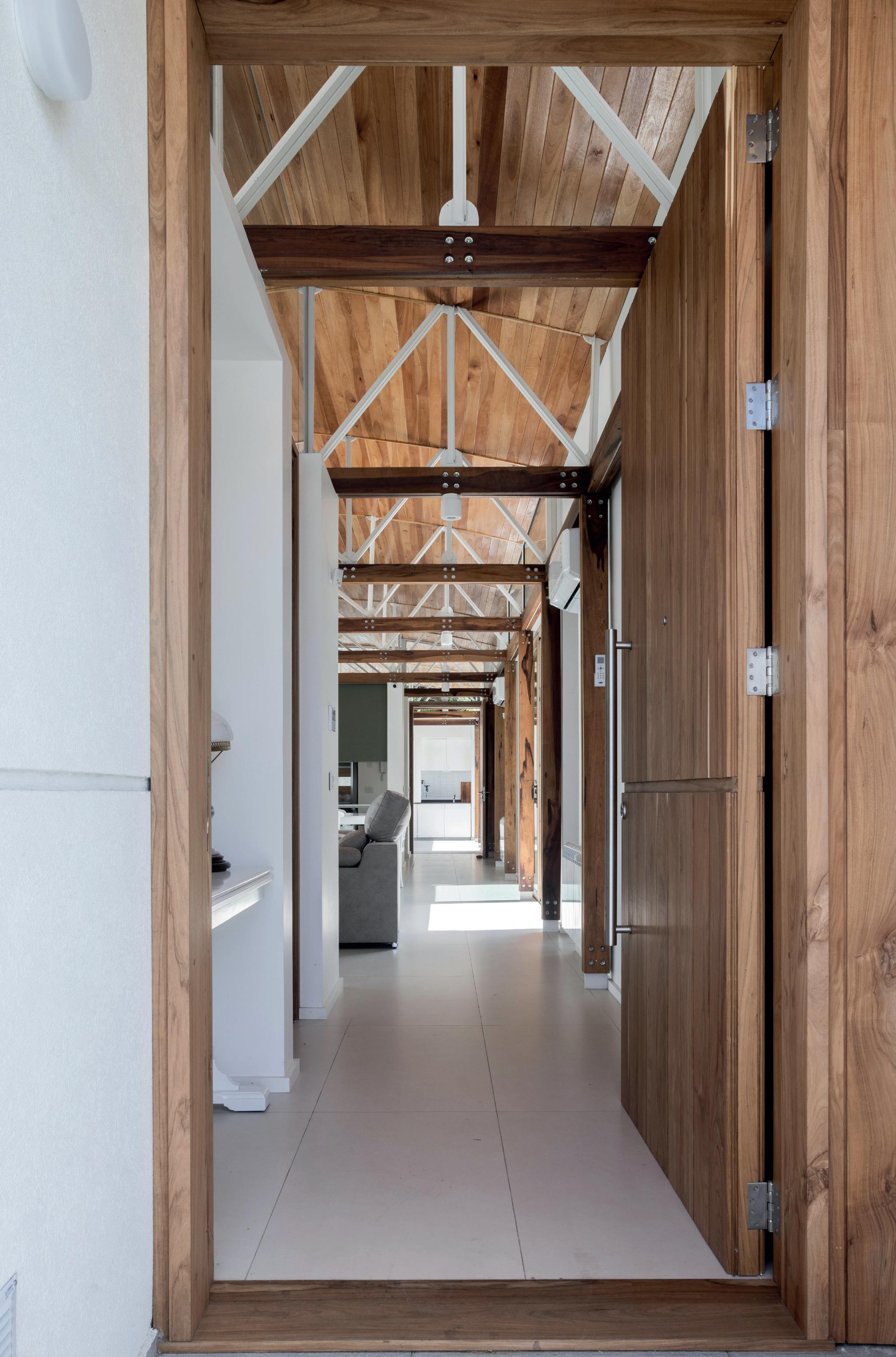 Todos los materiales conservan sus acabados y texturas naturales. La cubierta de estructura de madera -constituida por vigas y correas de eucalipto- y chapa acanalada a dos aguas, garantiza el rápido escurrimiento. Asimismo, la madera es el material de los aventanamientos, que cuentan con paños fijos o móviles, y con doble vidriado hermético.