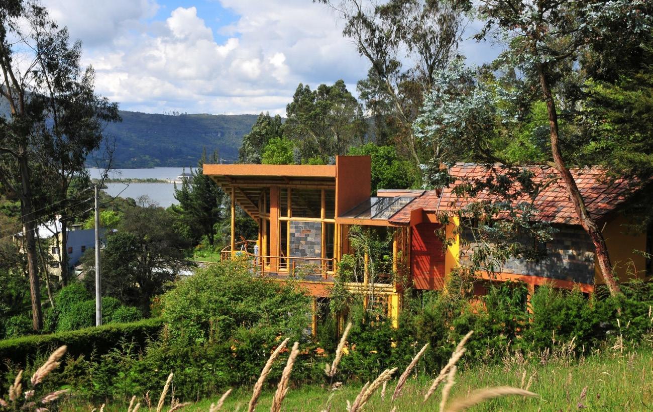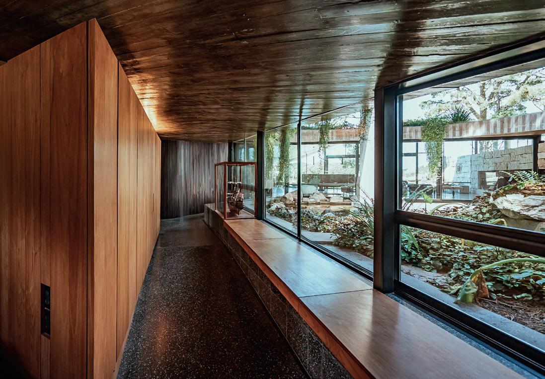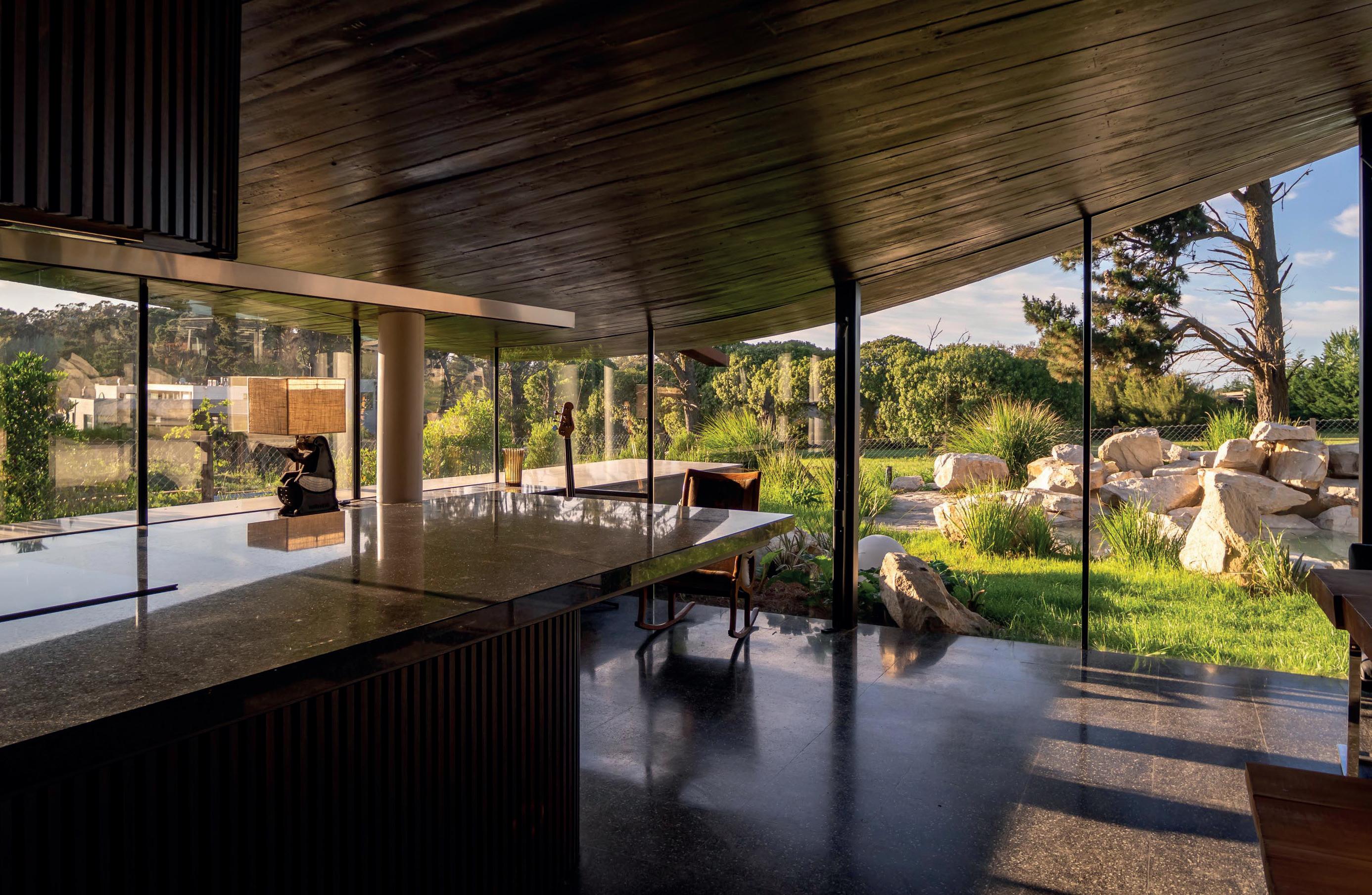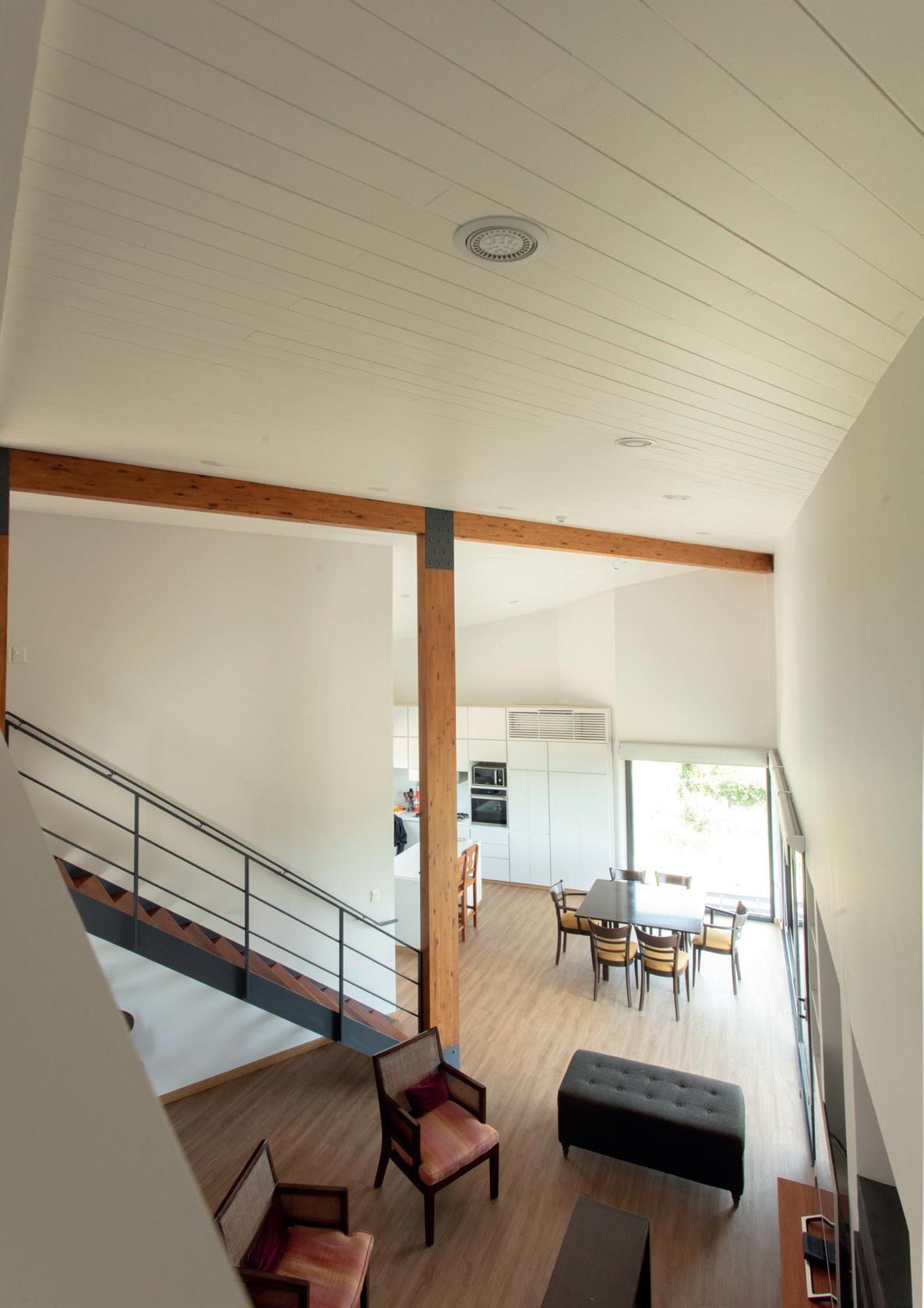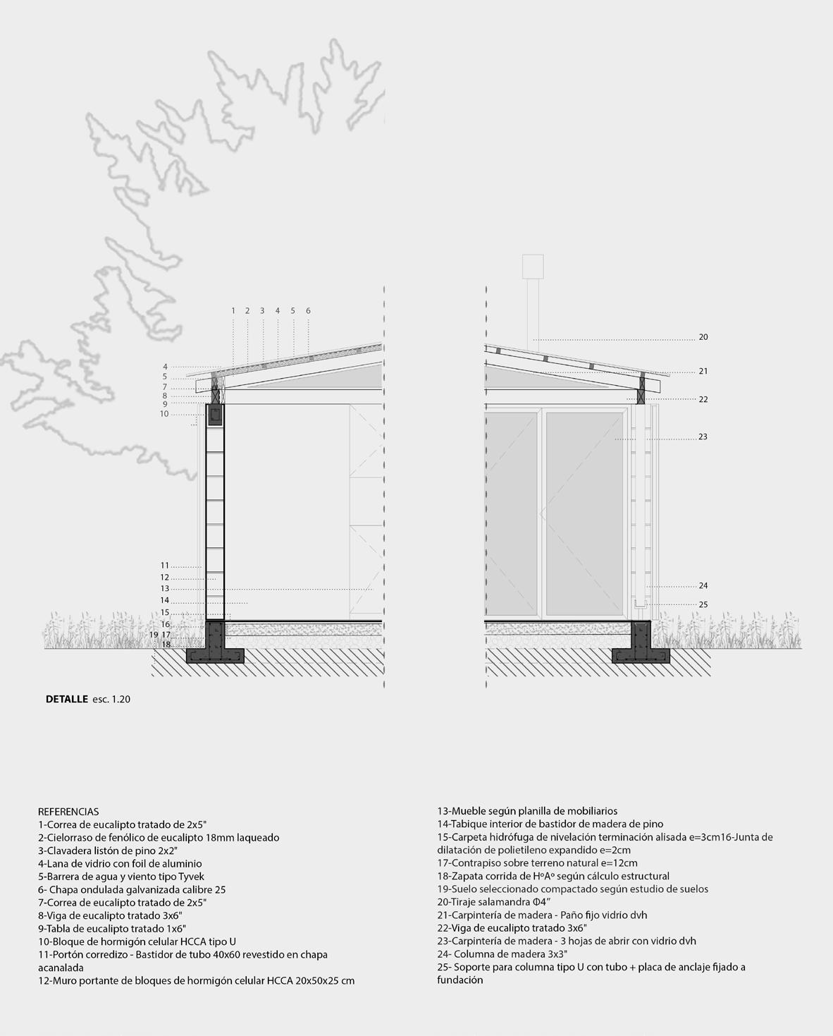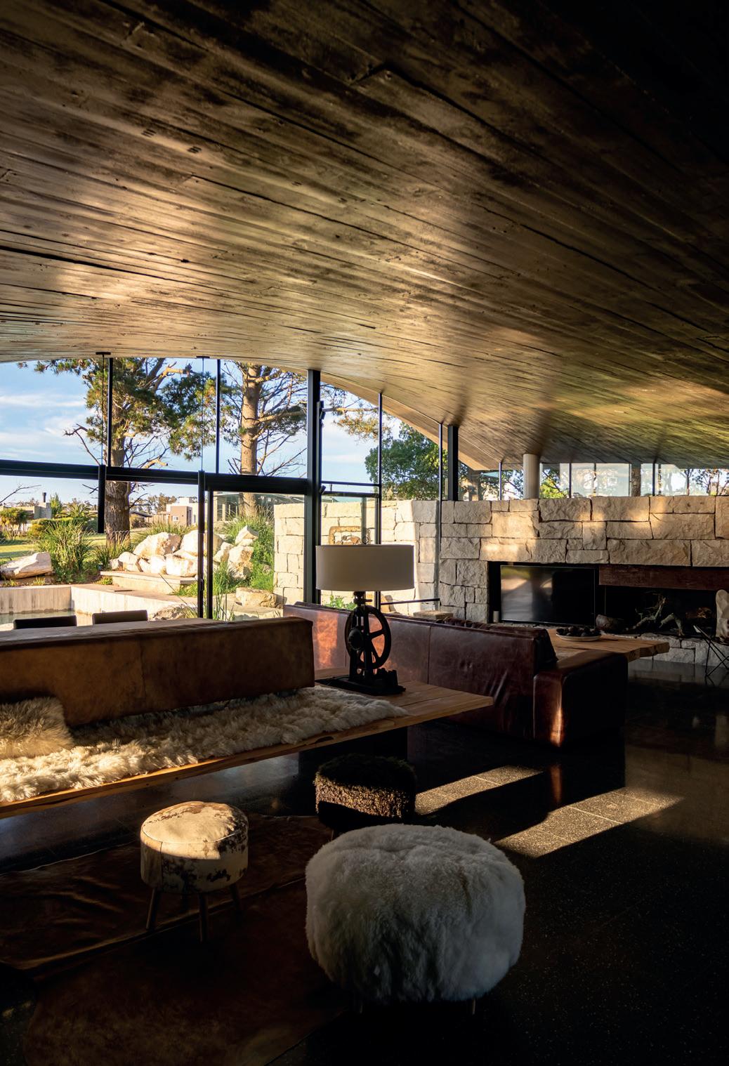 Todos los materiales conservan sus acabados y texturas naturales. La cubierta de estructura de madera -constituida por vigas y correas de eucalipto- y chapa acanalada a dos aguas, garantiza el rápido escurrimiento. Asimismo, la madera es el material de los aventanamientos, que cuentan con paños fijos o móviles, y con doble vidriado hermético.