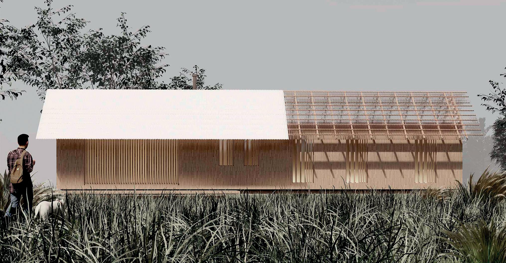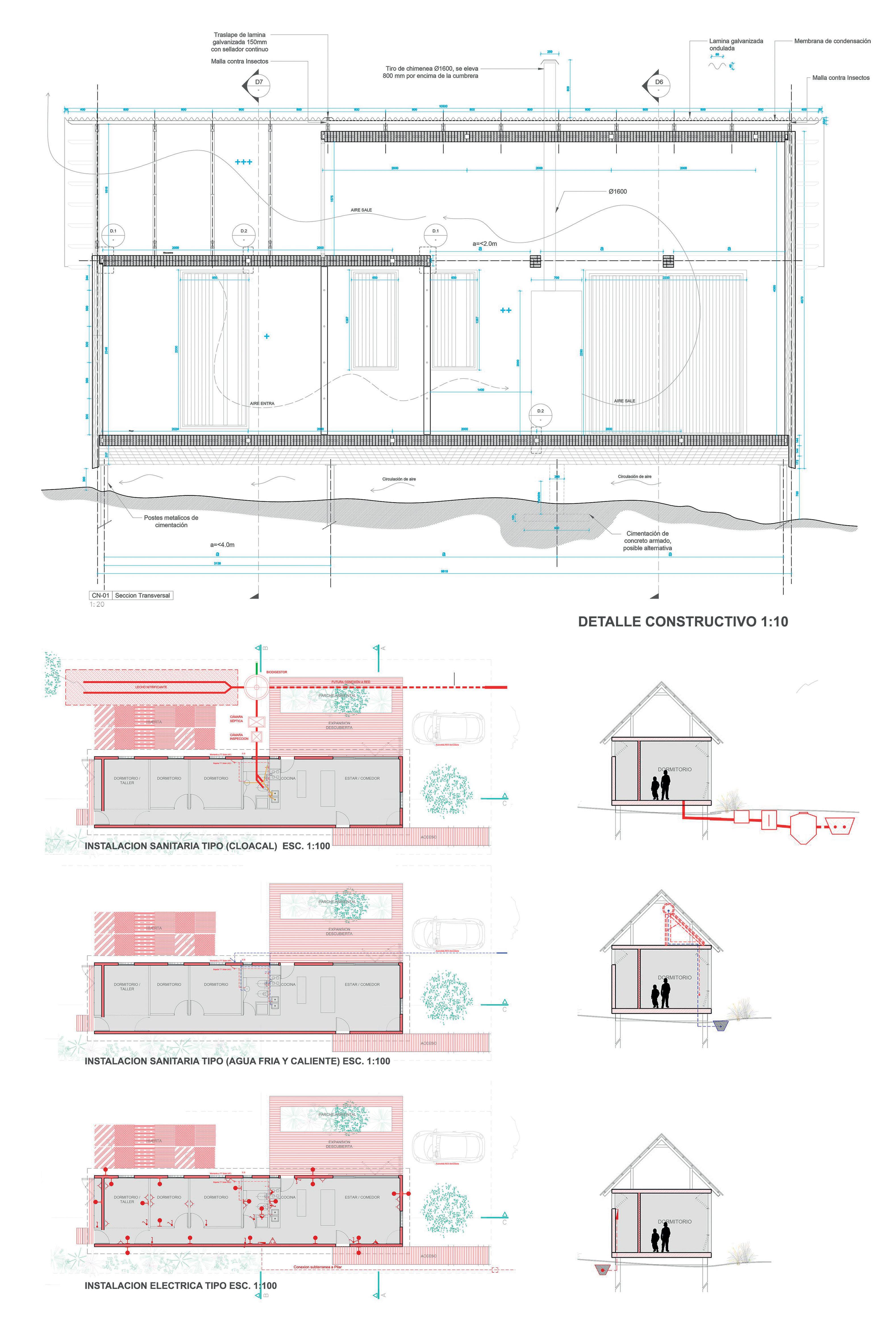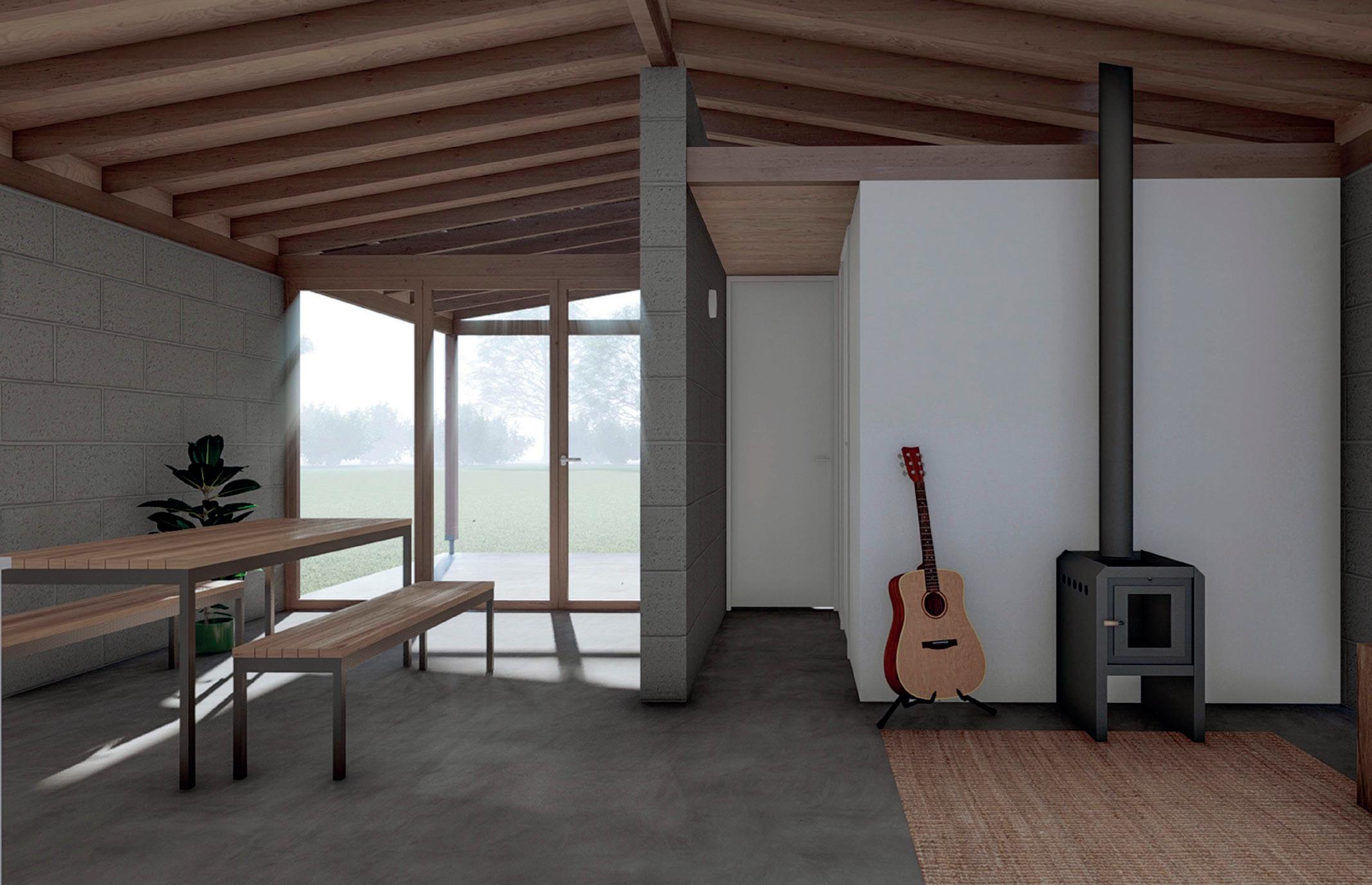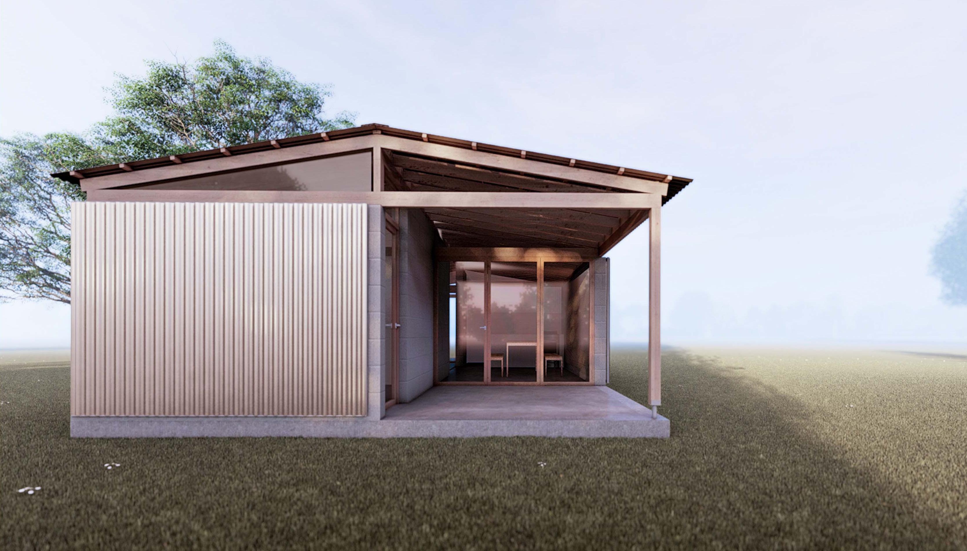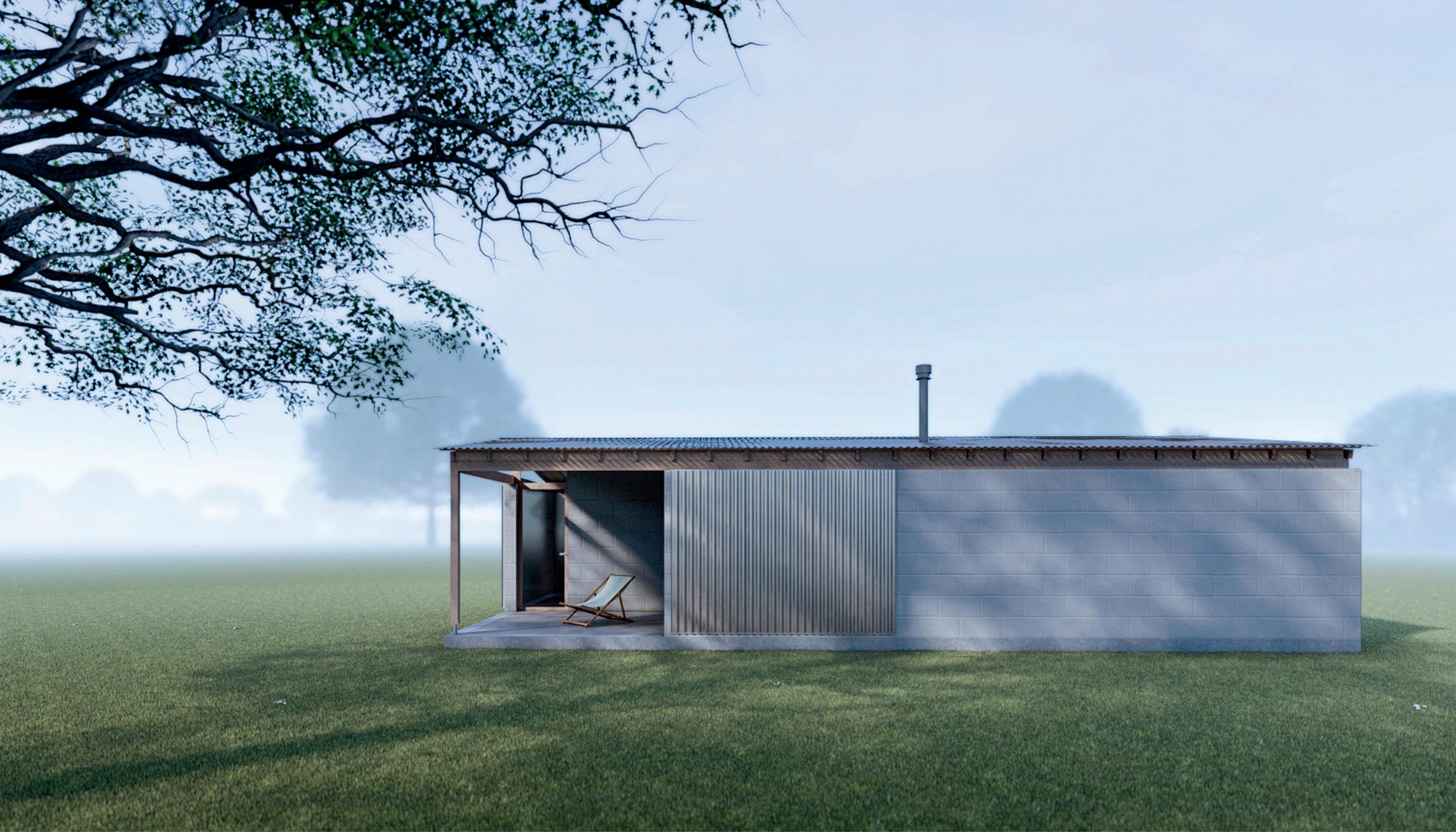 La materialización busca la eficiencia funcional, económica y ambiental utilizando solo los materiales imprescindibles para la construcción del espacio habitable con los recursos disponibles en cualquier pueblo y tecnología simple de albañilería tradicional: bloques de hormigón celular, tirantes de madera, chapa de zinc,