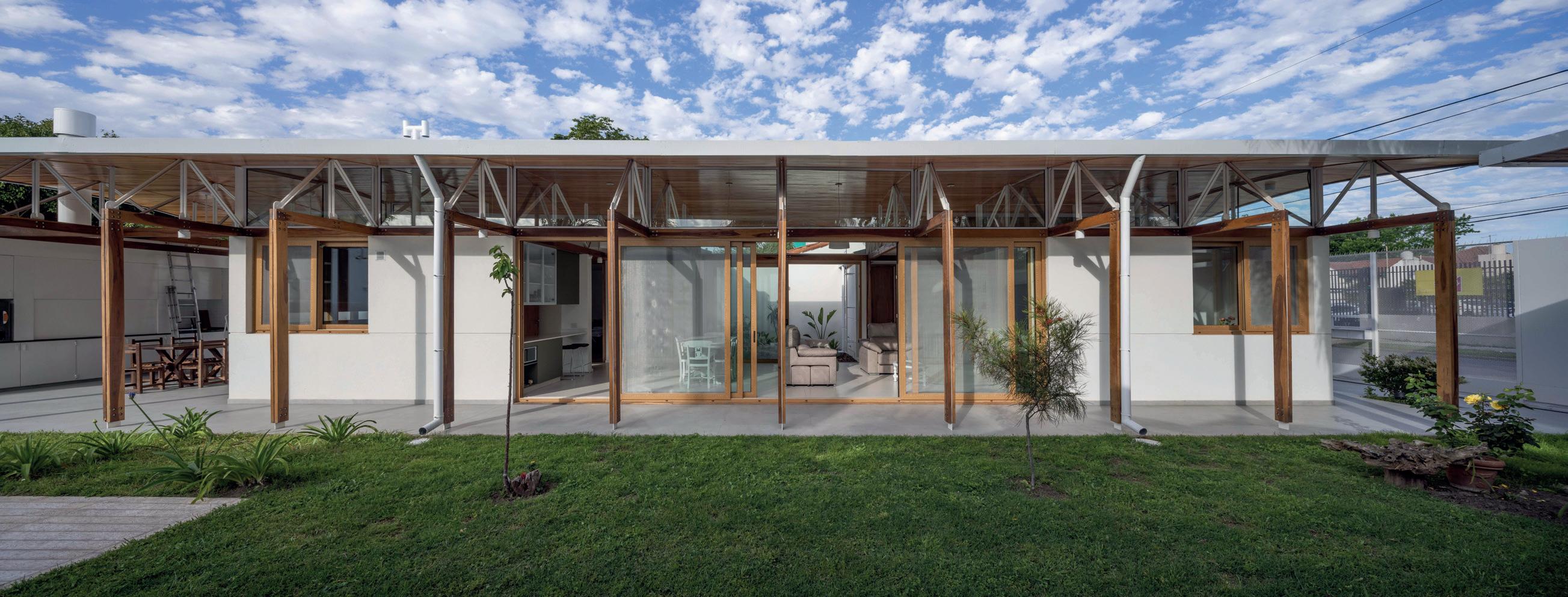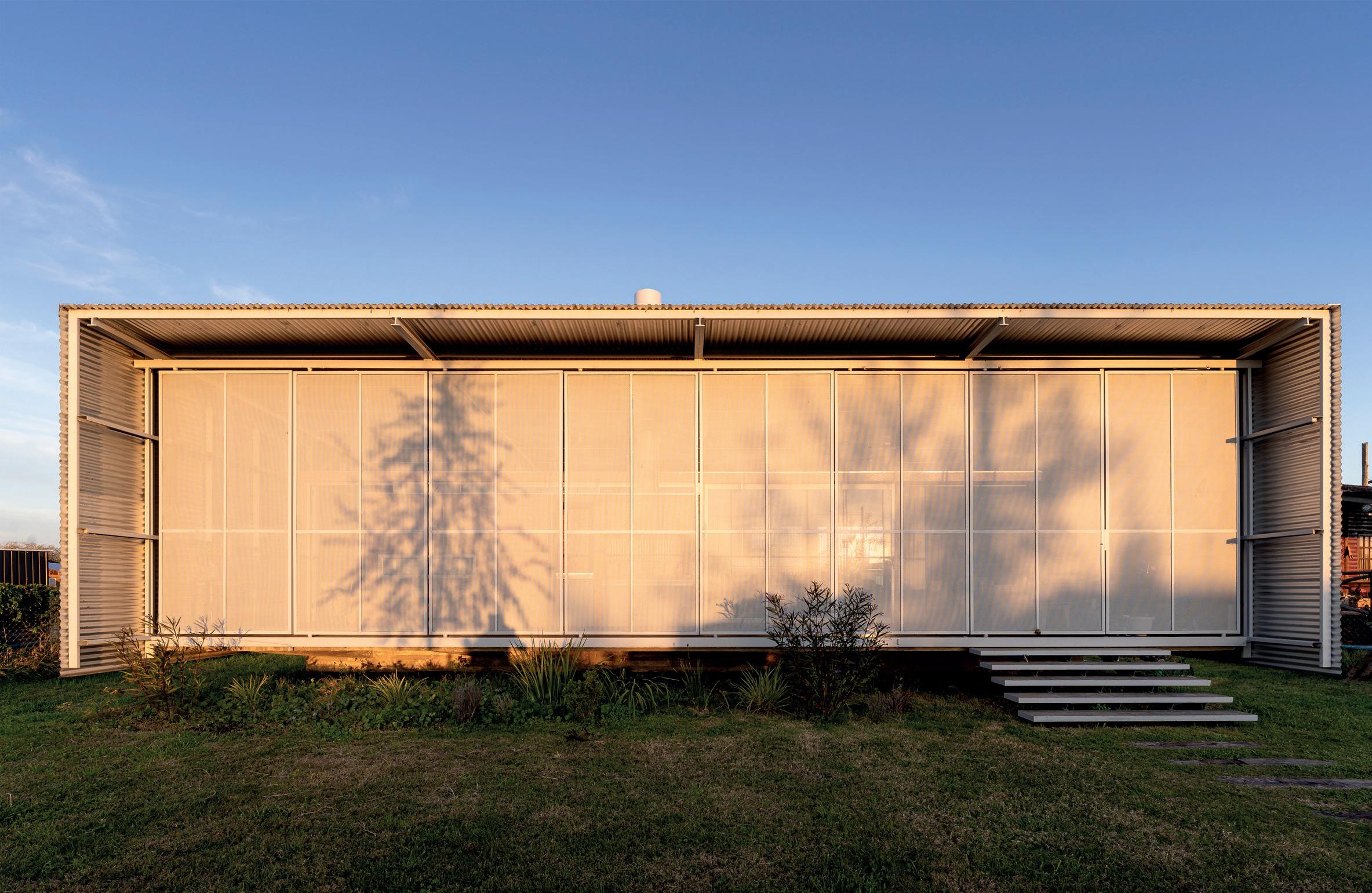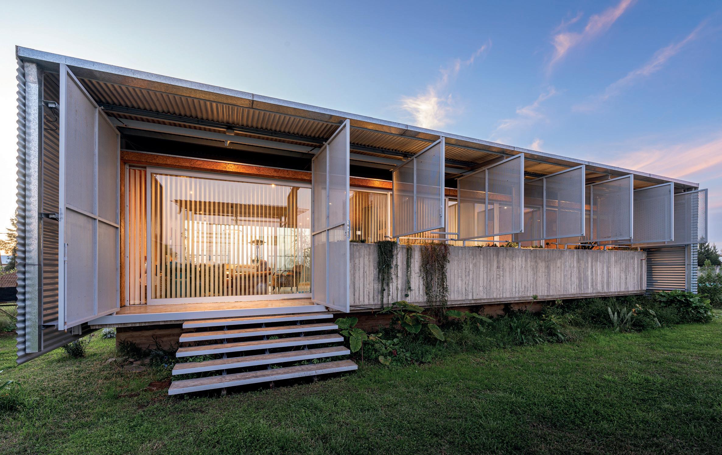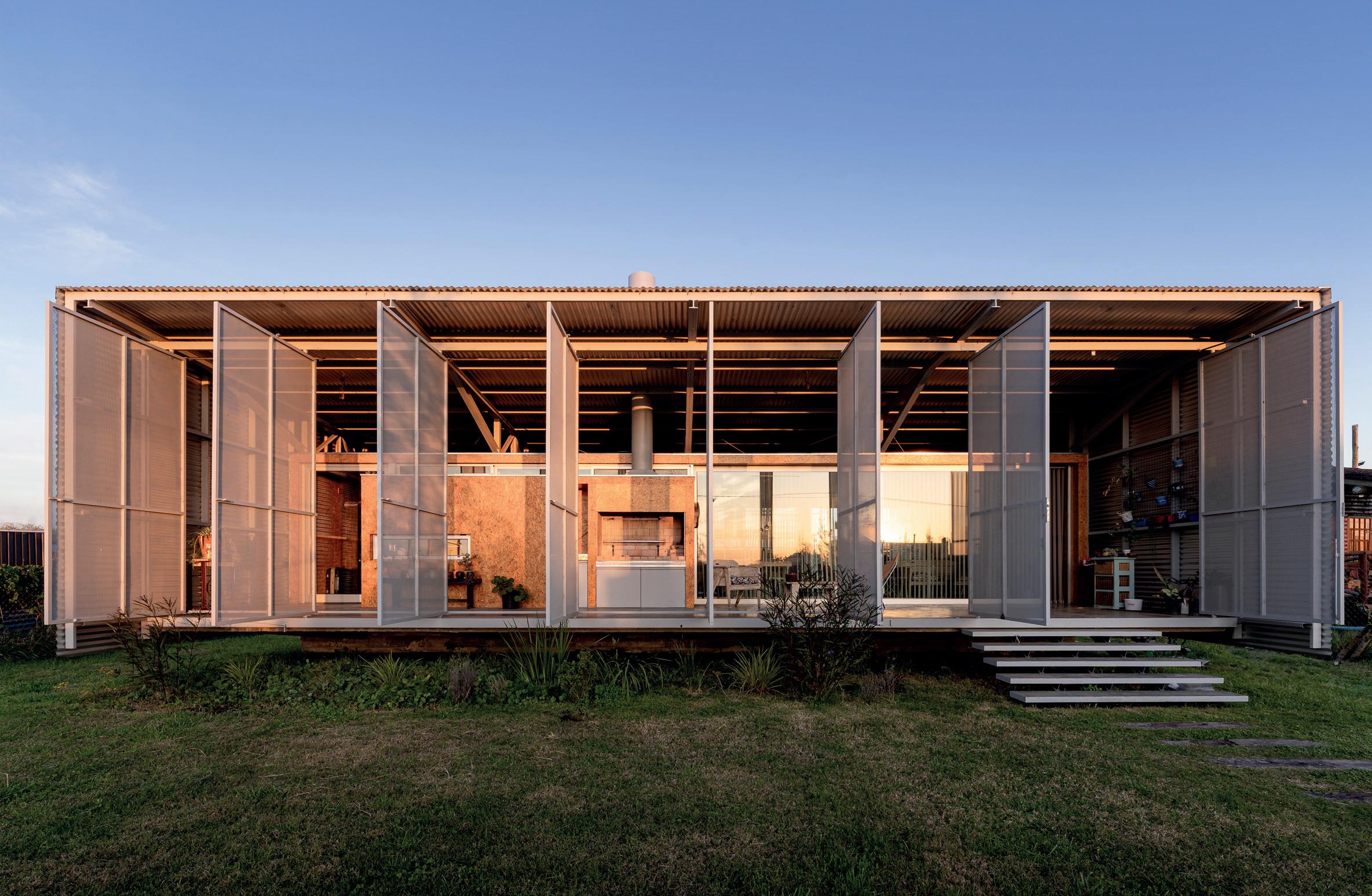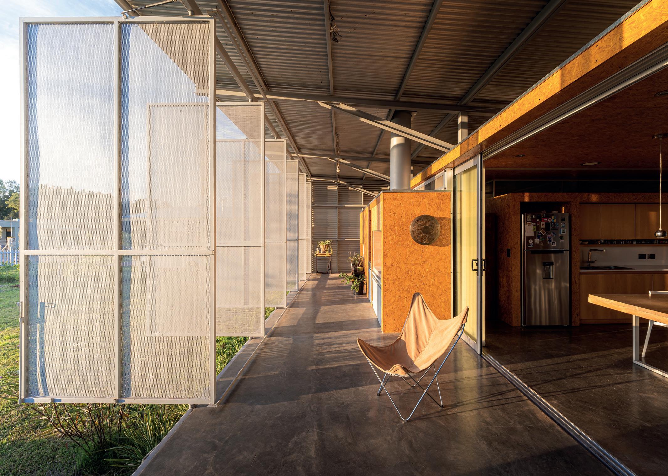 Los cerramientos corredizos de chapa acanalada controlan la radiación solar y las lluvias, y permiten cerrar la casa de manera completa en periodos de ausencia.