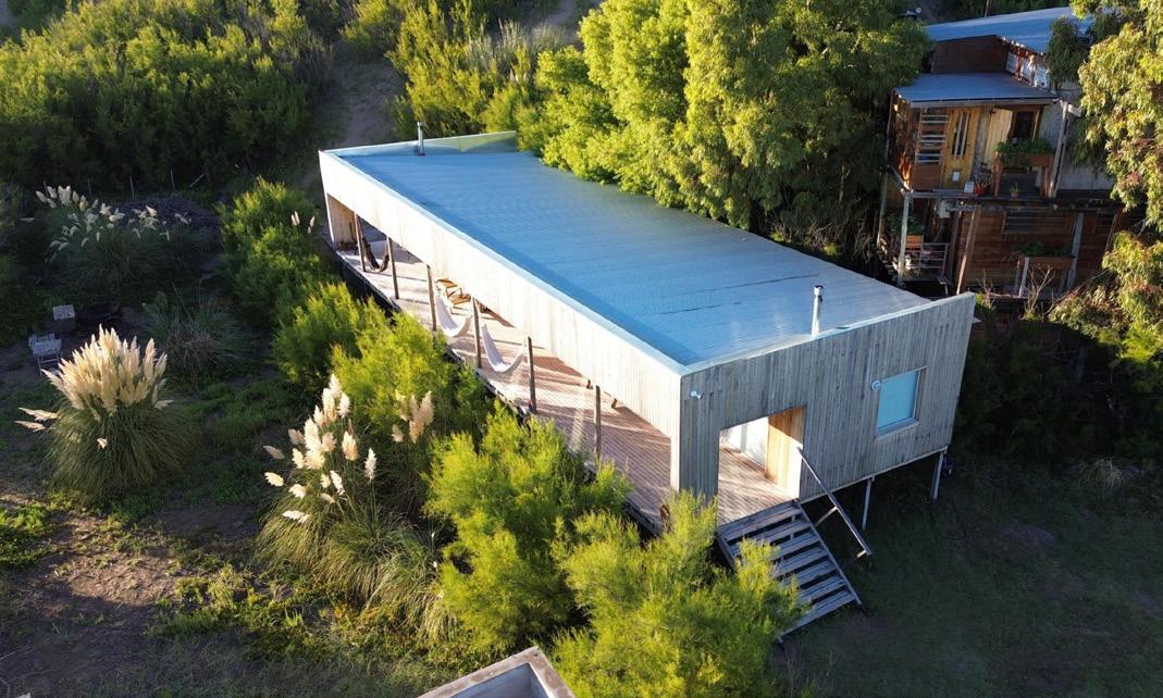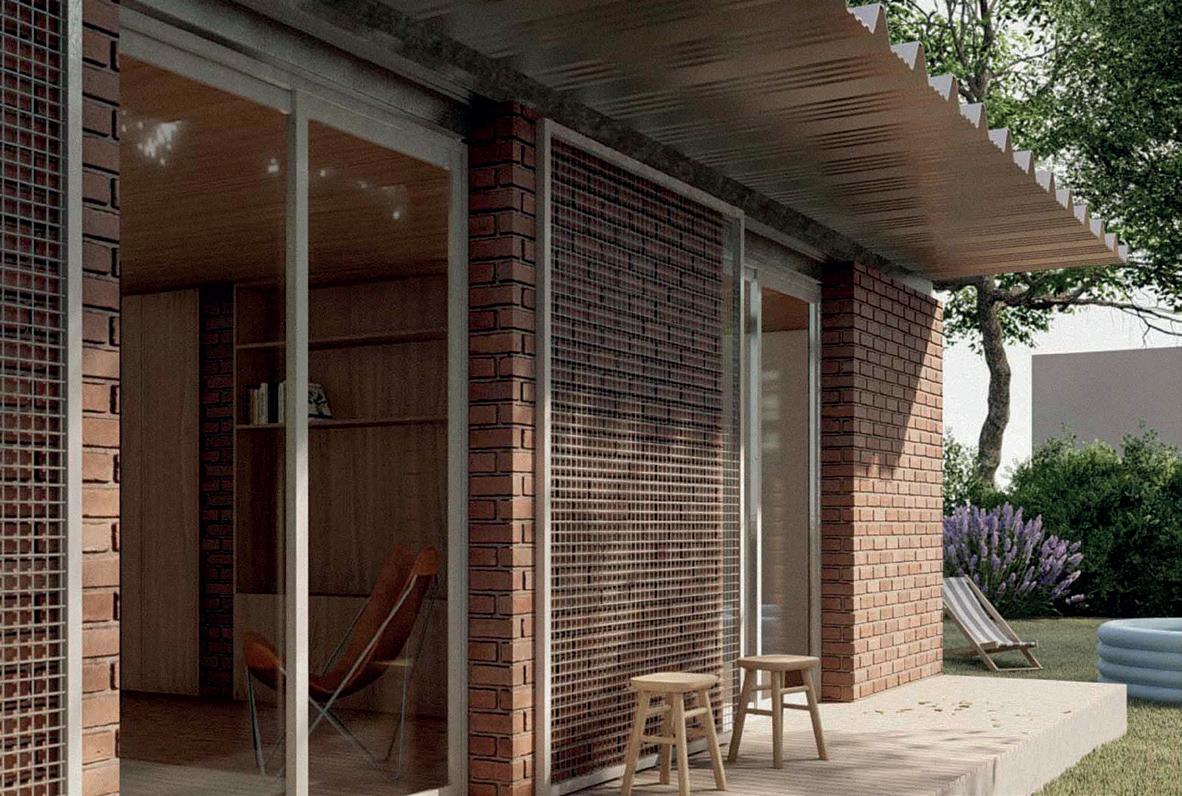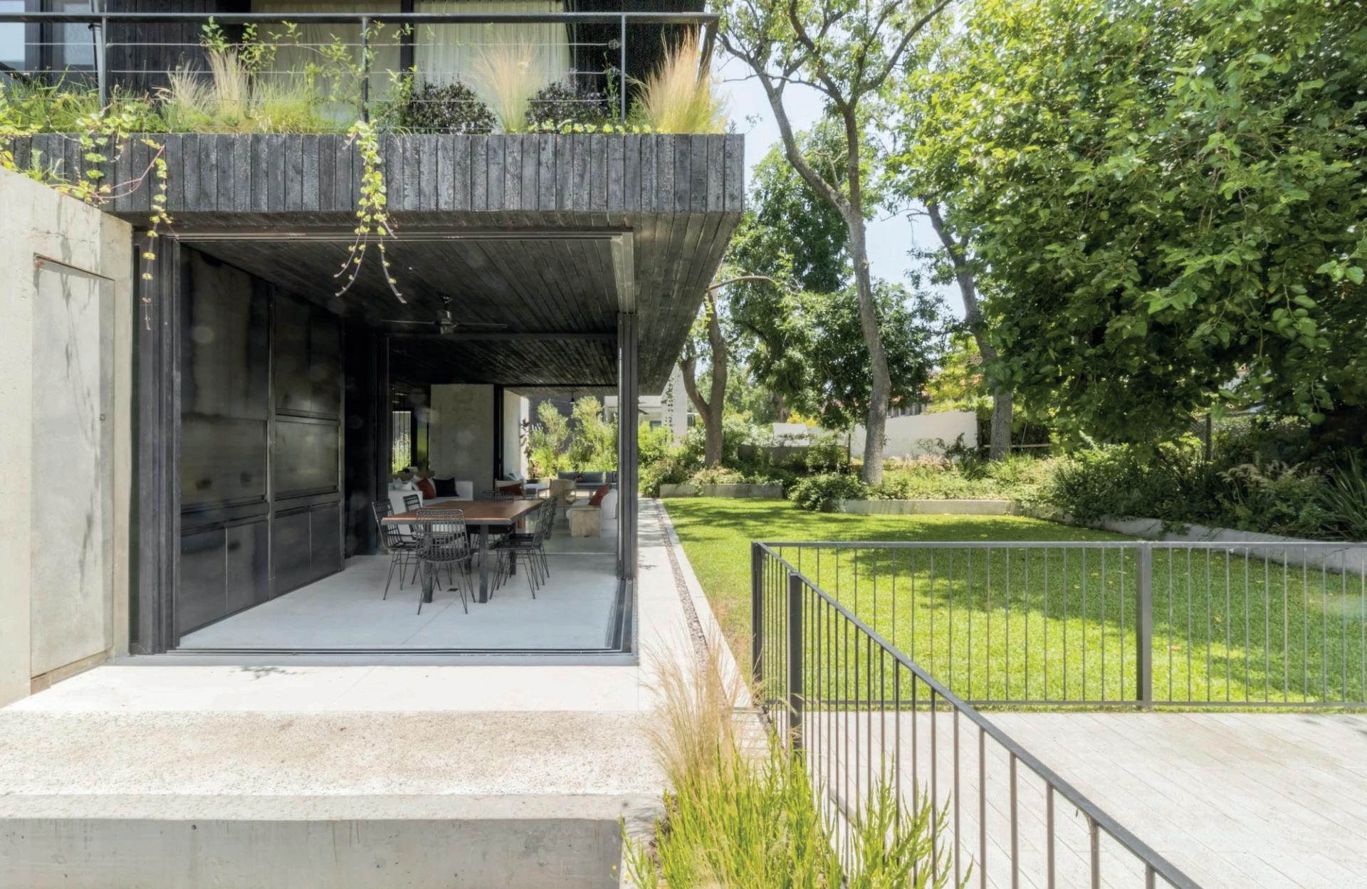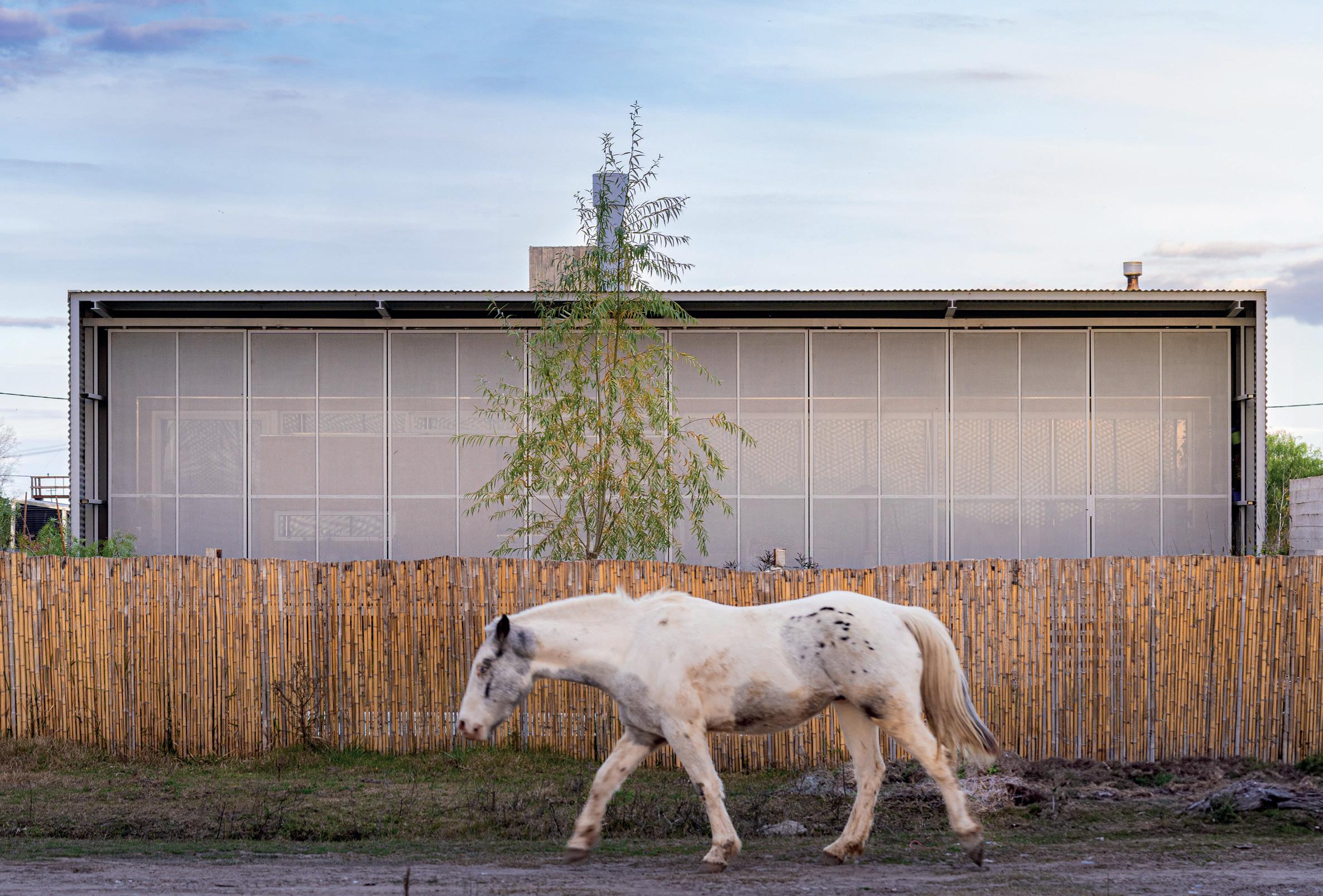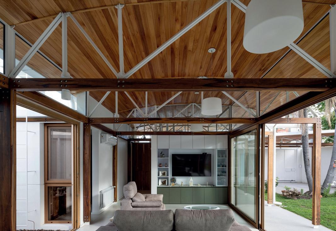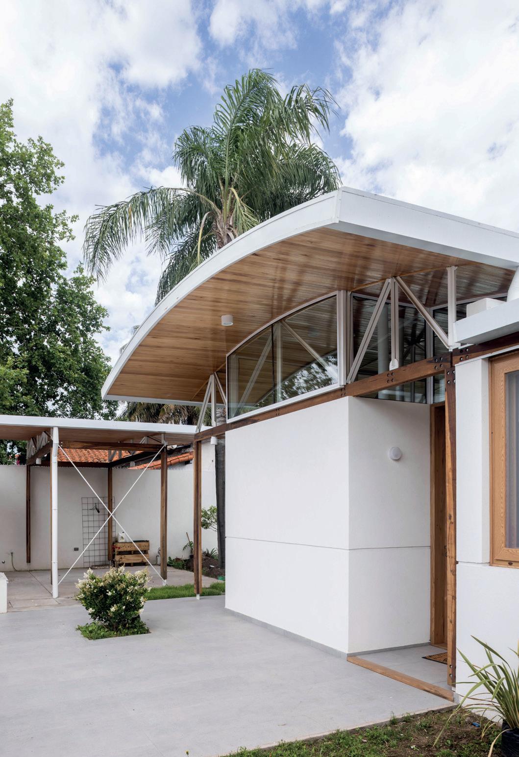 Los cerramientos corredizos de chapa acanalada controlan la radiación solar y las lluvias, y permiten cerrar la casa de manera completa en periodos de ausencia.
