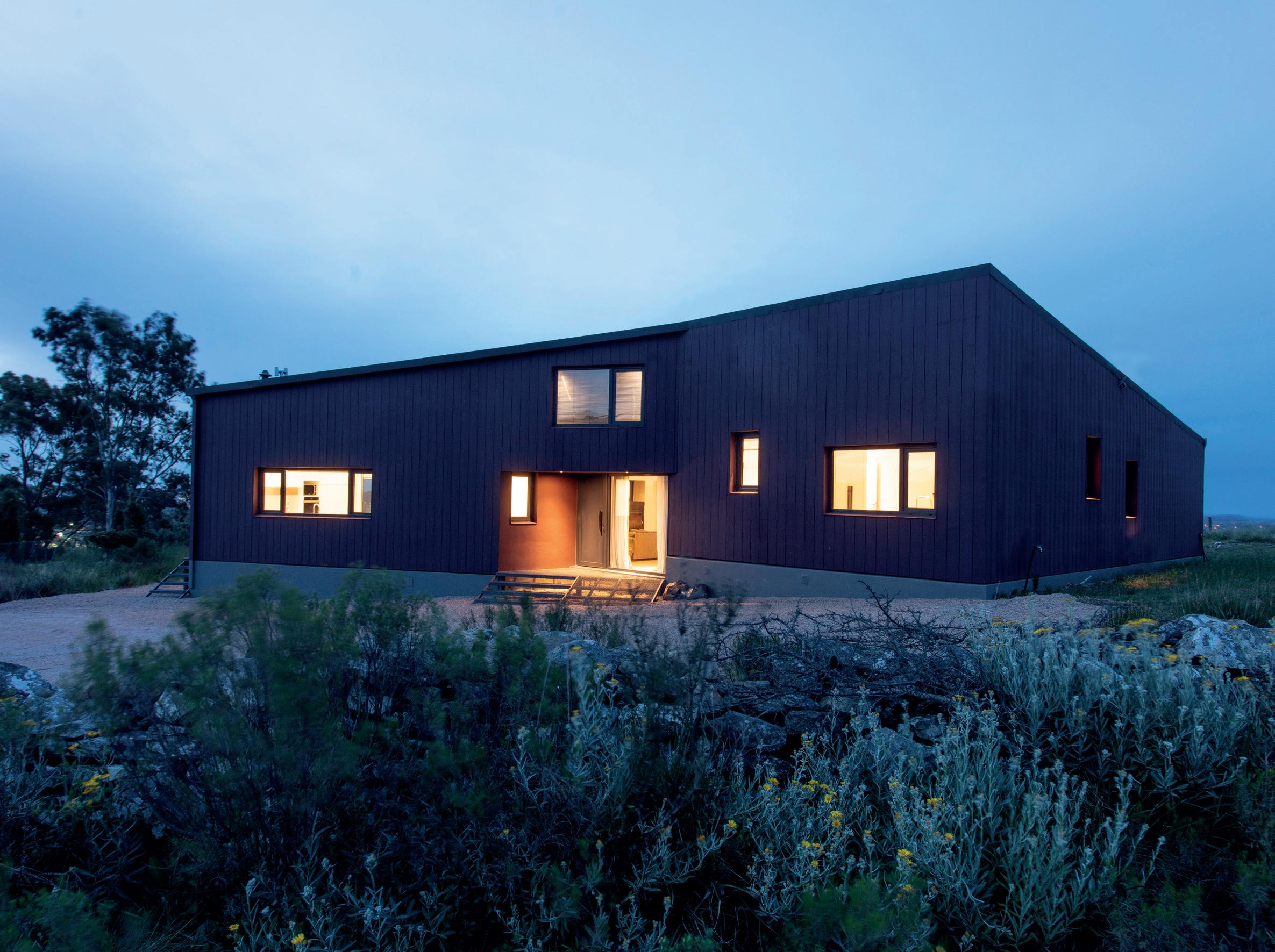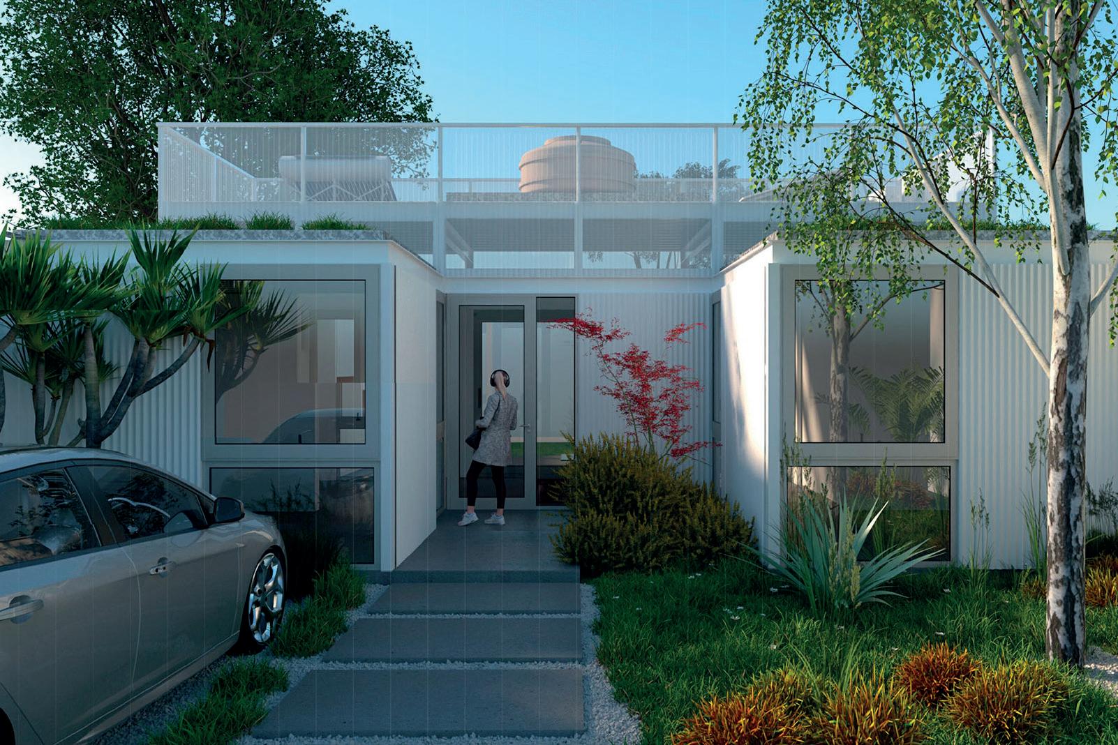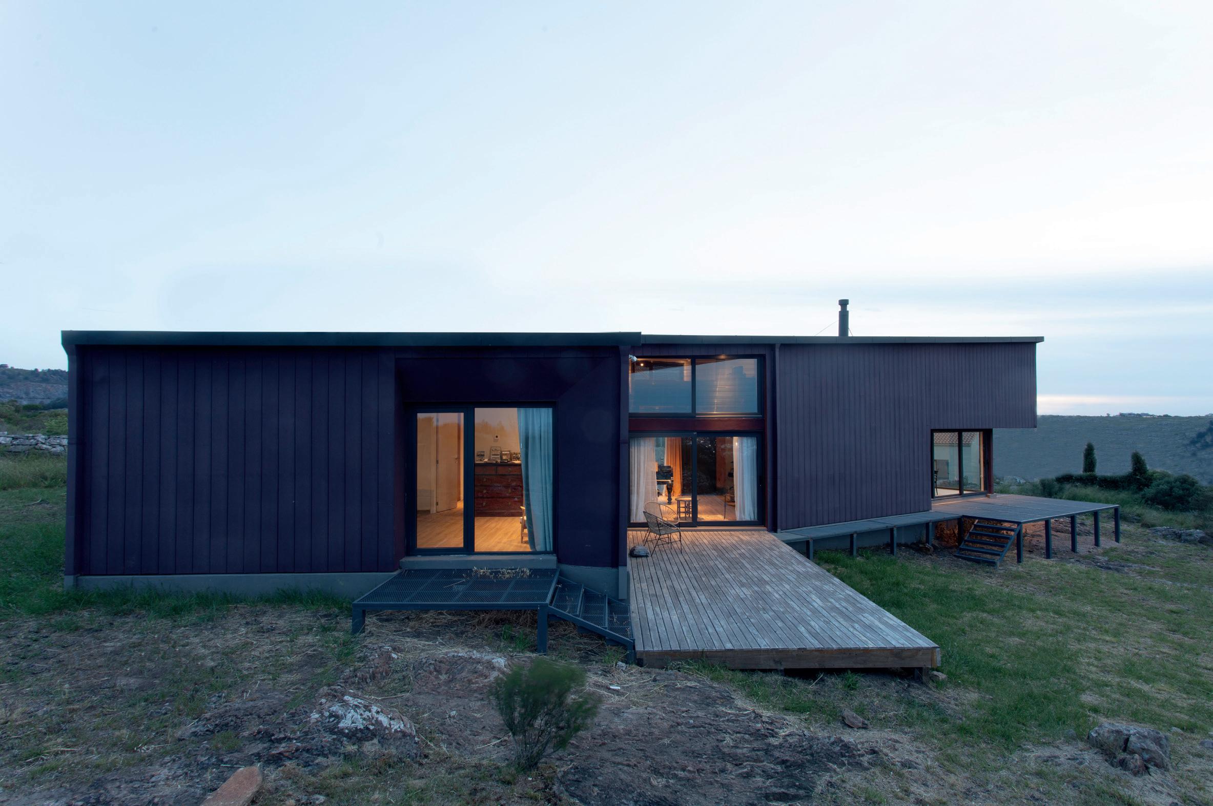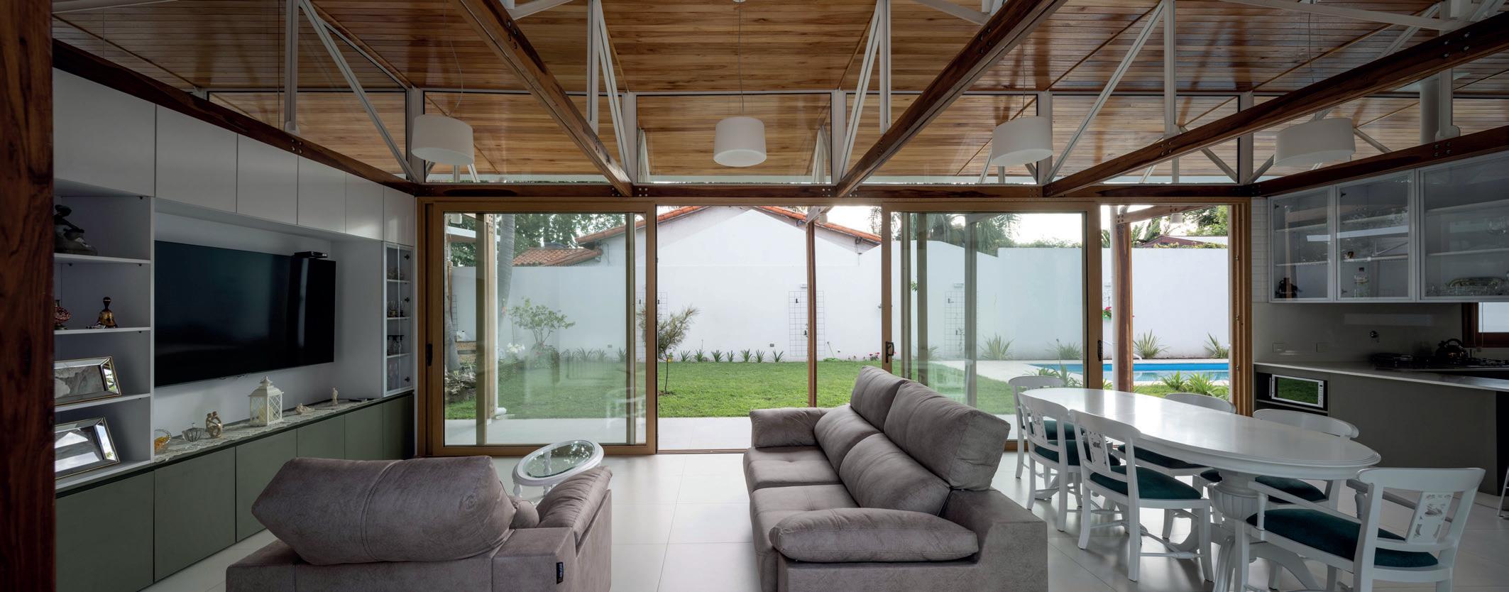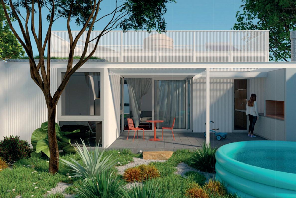 Los cerramientos corredizos de chapa acanalada controlan la radiación solar y las lluvias, y permiten cerrar la casa de manera completa en periodos de ausencia.
