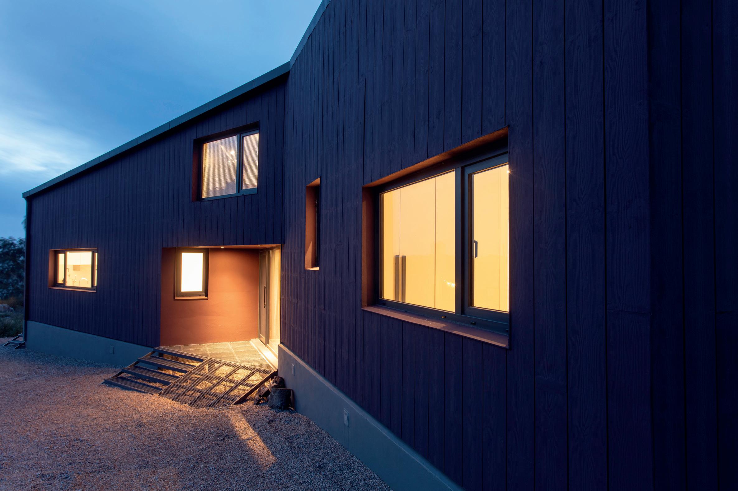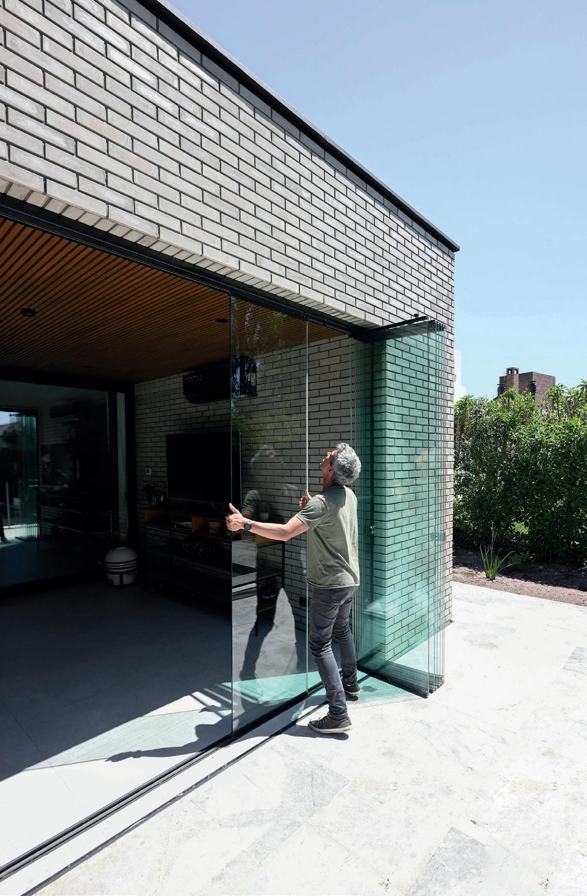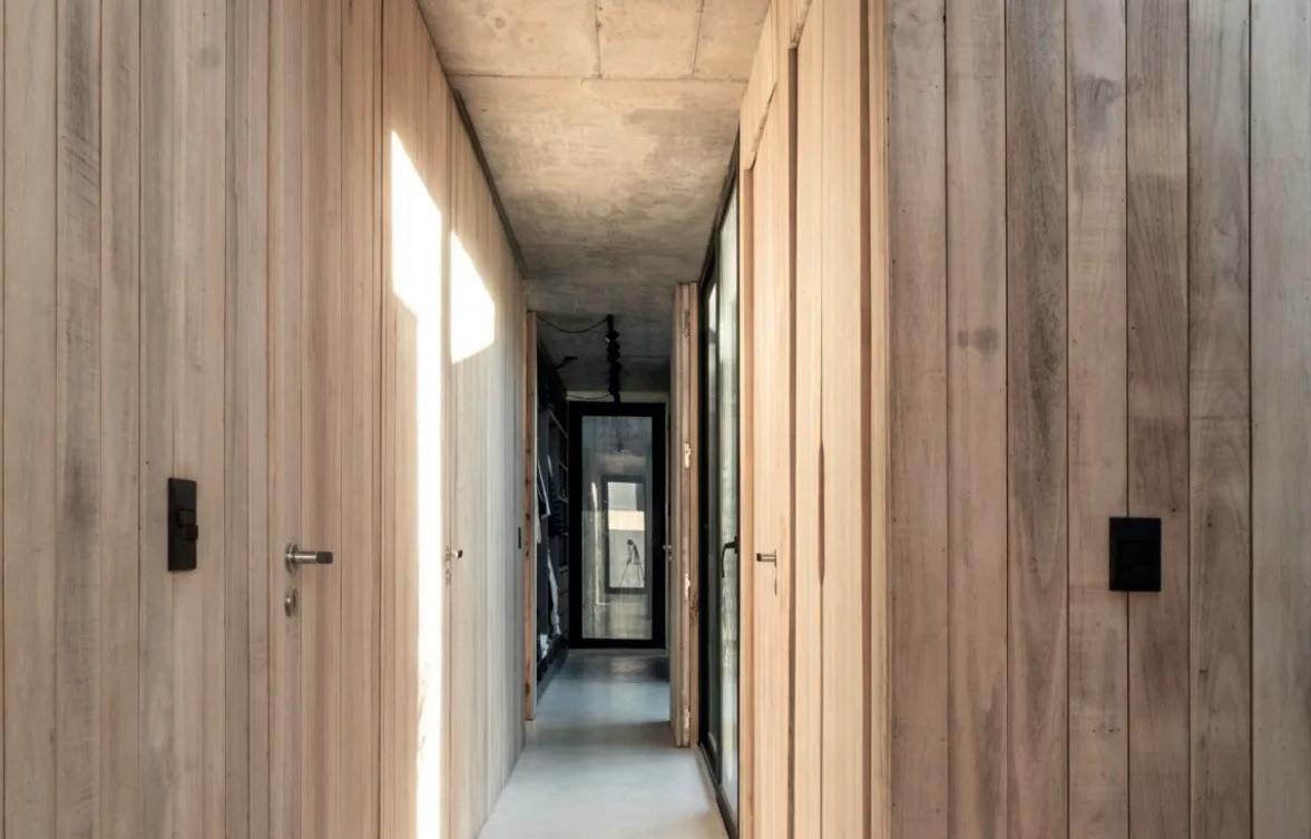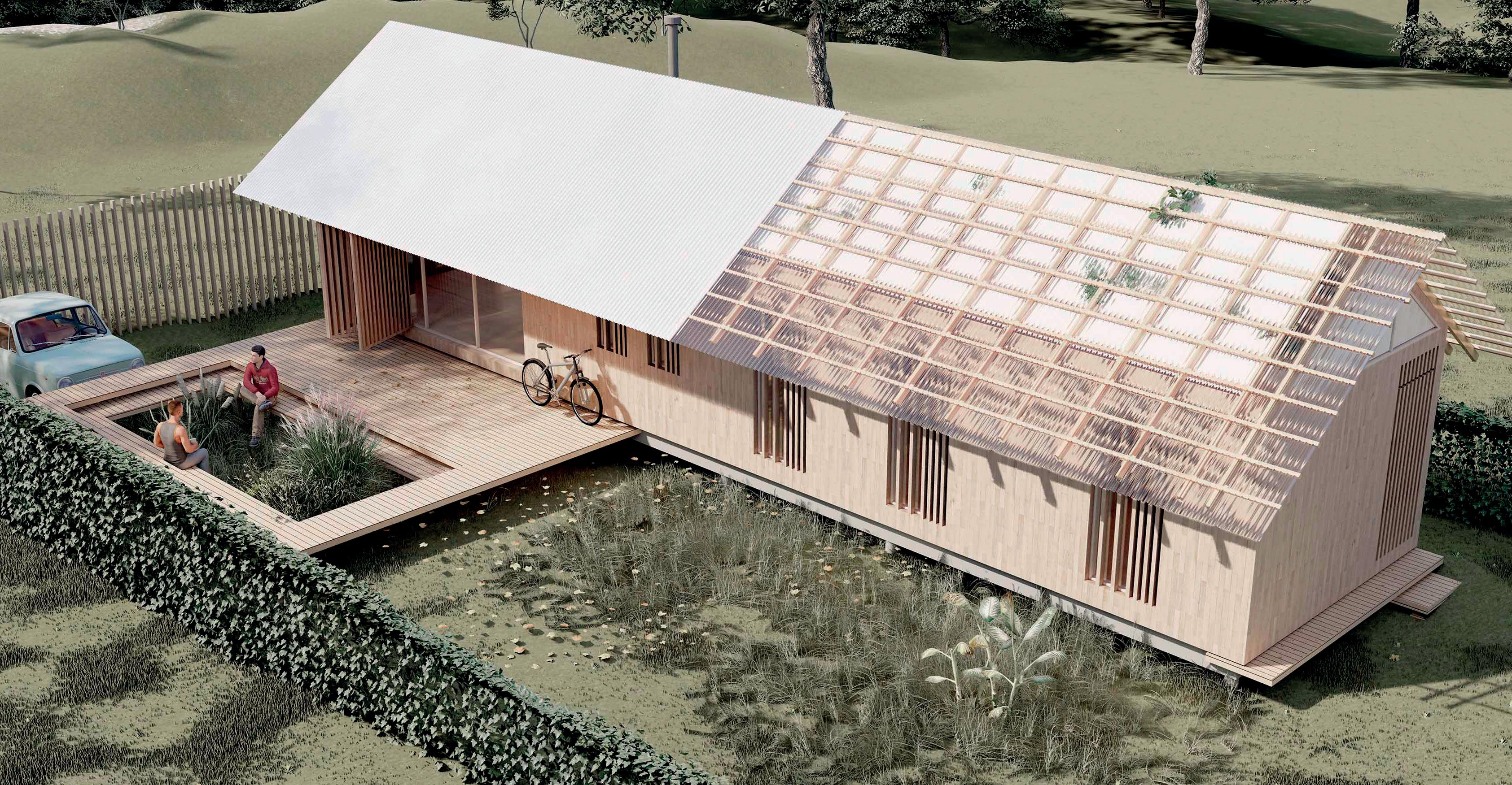 Los cerramientos corredizos de chapa acanalada controlan la radiación solar y las lluvias, y permiten cerrar la casa de manera completa en periodos de ausencia.