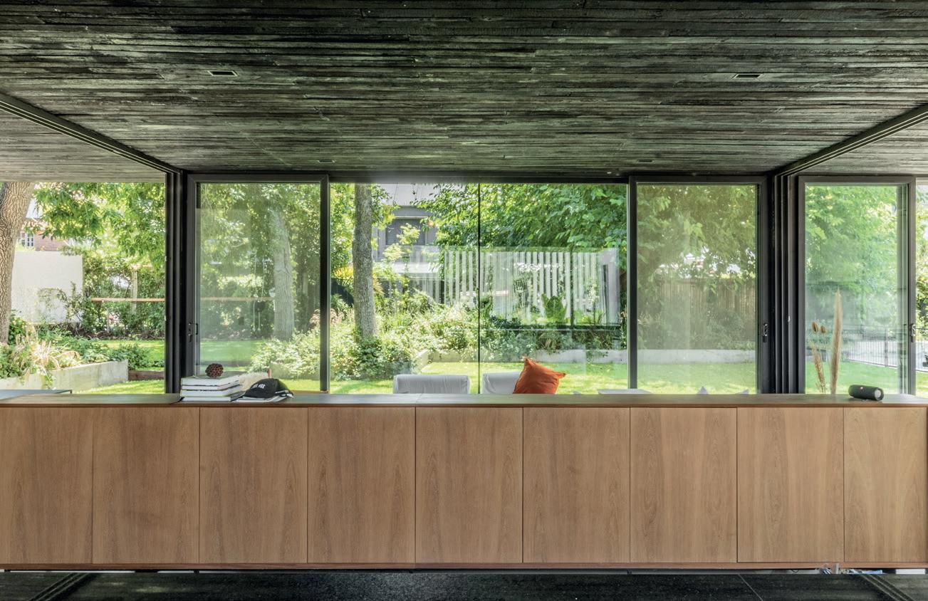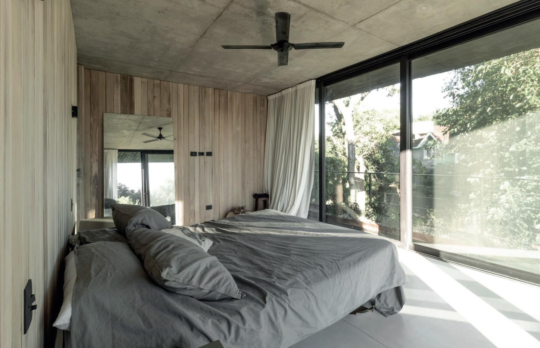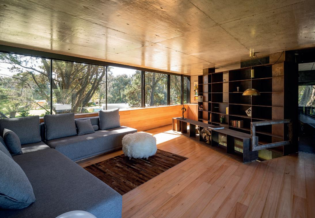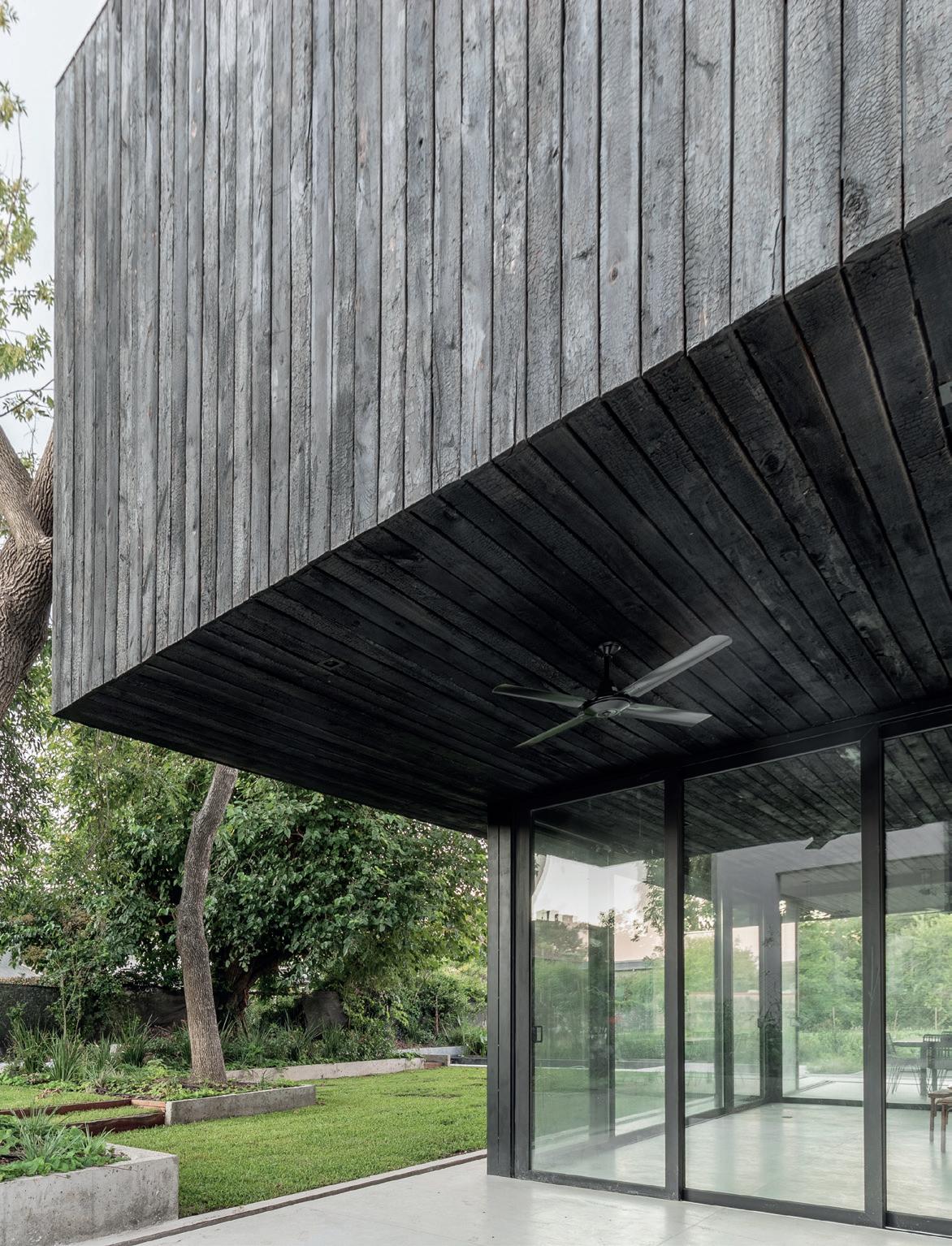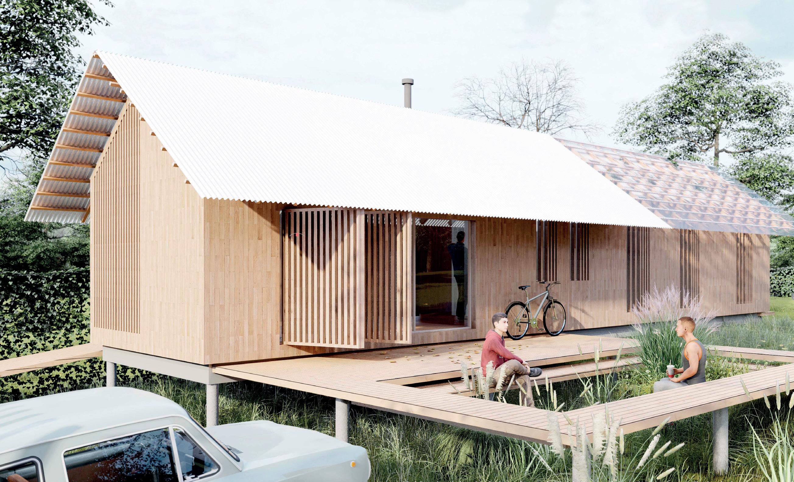Los cerramientos corredizos de chapa acanalada controlan la radiación solar y las lluvias, y permiten cerrar la casa de manera completa en periodos de ausencia.