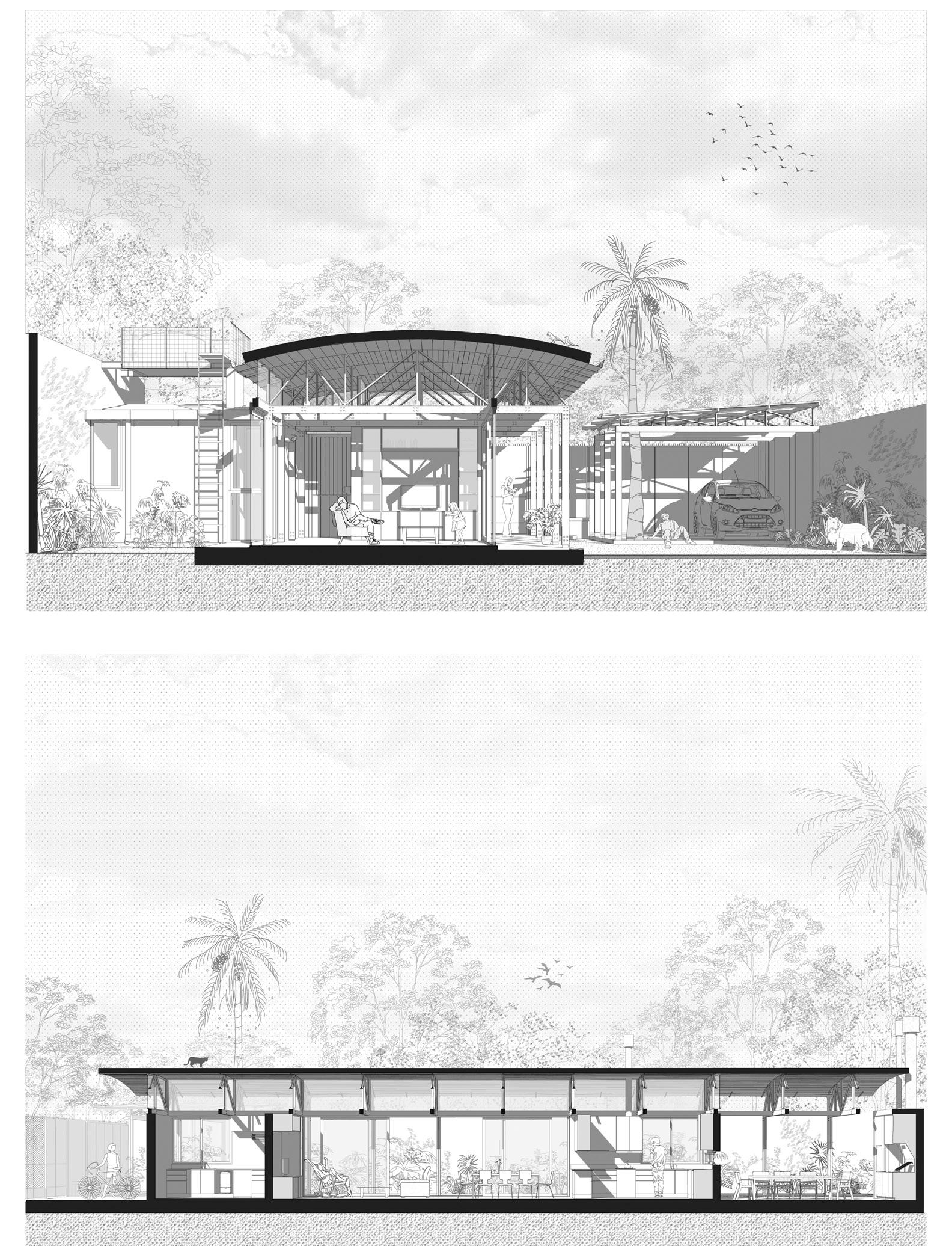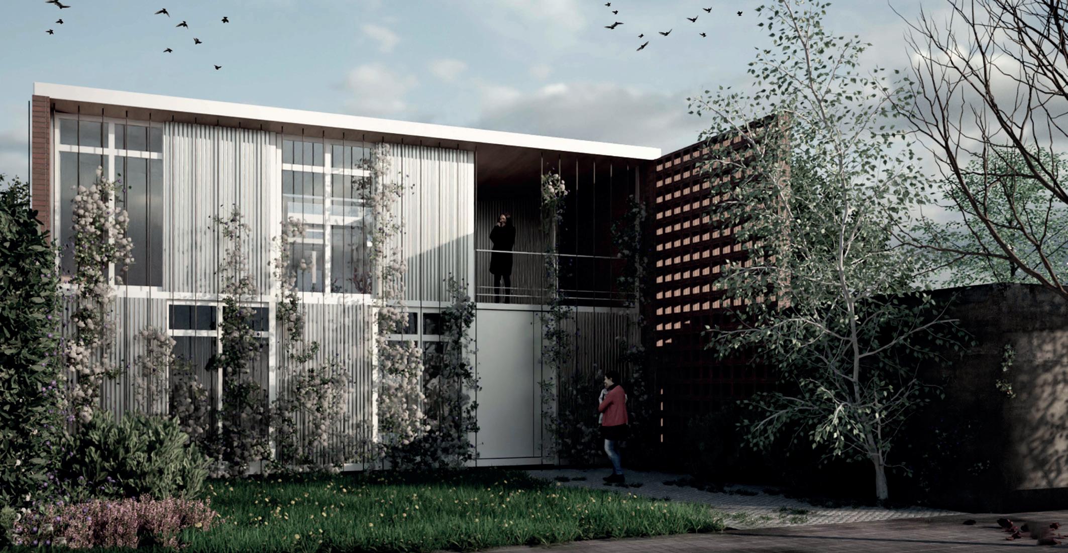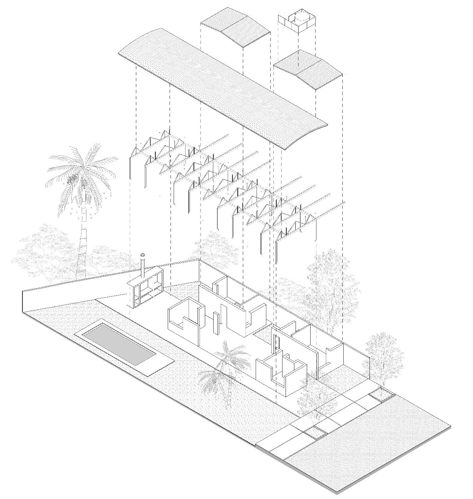 El proyecto parte de la premisa de crear un espacio protegido del sol y las lluvias que afectan a la región. Una gran cubierta independiente cuya sombra envuelve y protege a los habitantes. Este prototipo de vivienda metropolitana retoma antecedentes de larga trayectoria como la vivienda chorizo: un sistema técnico constructivo básico y eficiente que permite la adecuación a distintos lotes urbanos y posibles crecimientos a partir de su desarrollo lineal en relación a la profundidad de la parcela. El proyecto emplea esos aspectos a partir de una materialidad contemporánea.