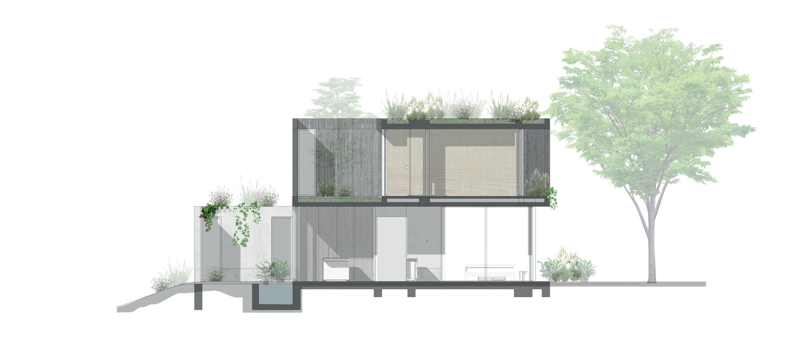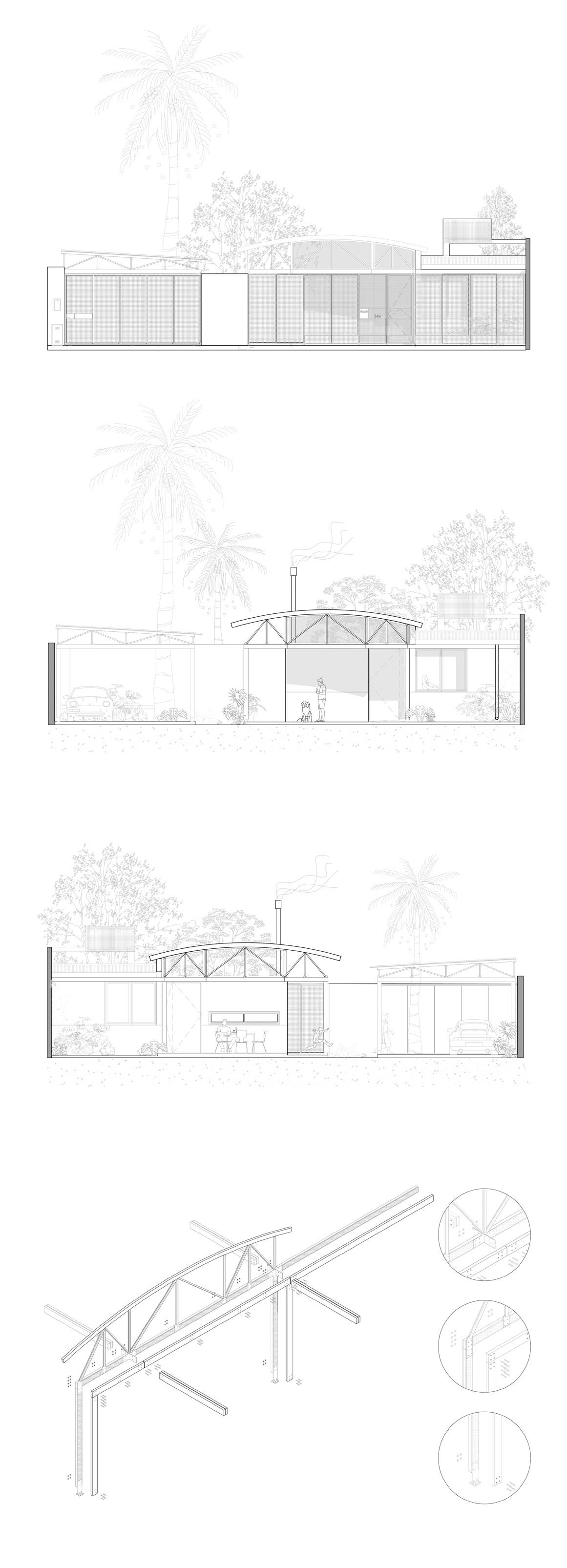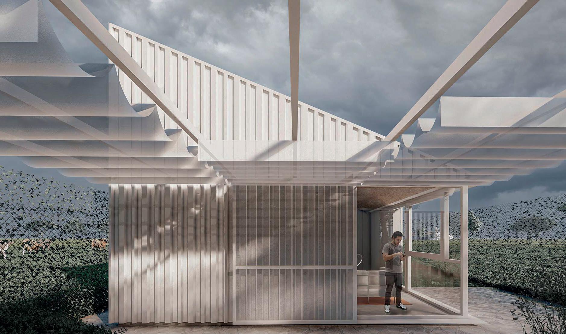 El proyecto parte de la premisa de crear un espacio protegido del sol y las lluvias que afectan a la región. Una gran cubierta independiente cuya sombra envuelve y protege a los habitantes. Este prototipo de vivienda metropolitana retoma antecedentes de larga trayectoria como la vivienda chorizo: un sistema técnico constructivo básico y eficiente que permite la adecuación a distintos lotes urbanos y posibles crecimientos a partir de su desarrollo lineal en relación a la profundidad de la parcela. El proyecto emplea esos aspectos a partir de una materialidad contemporánea.