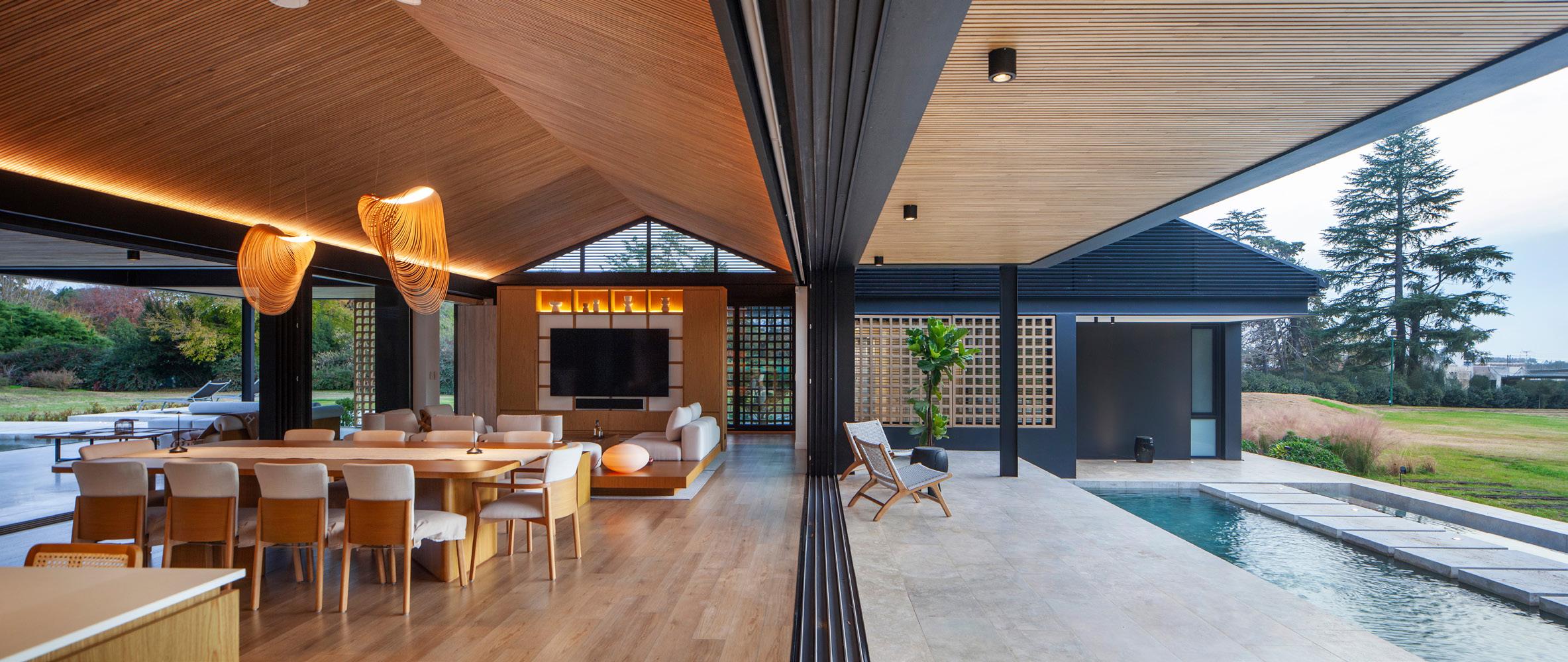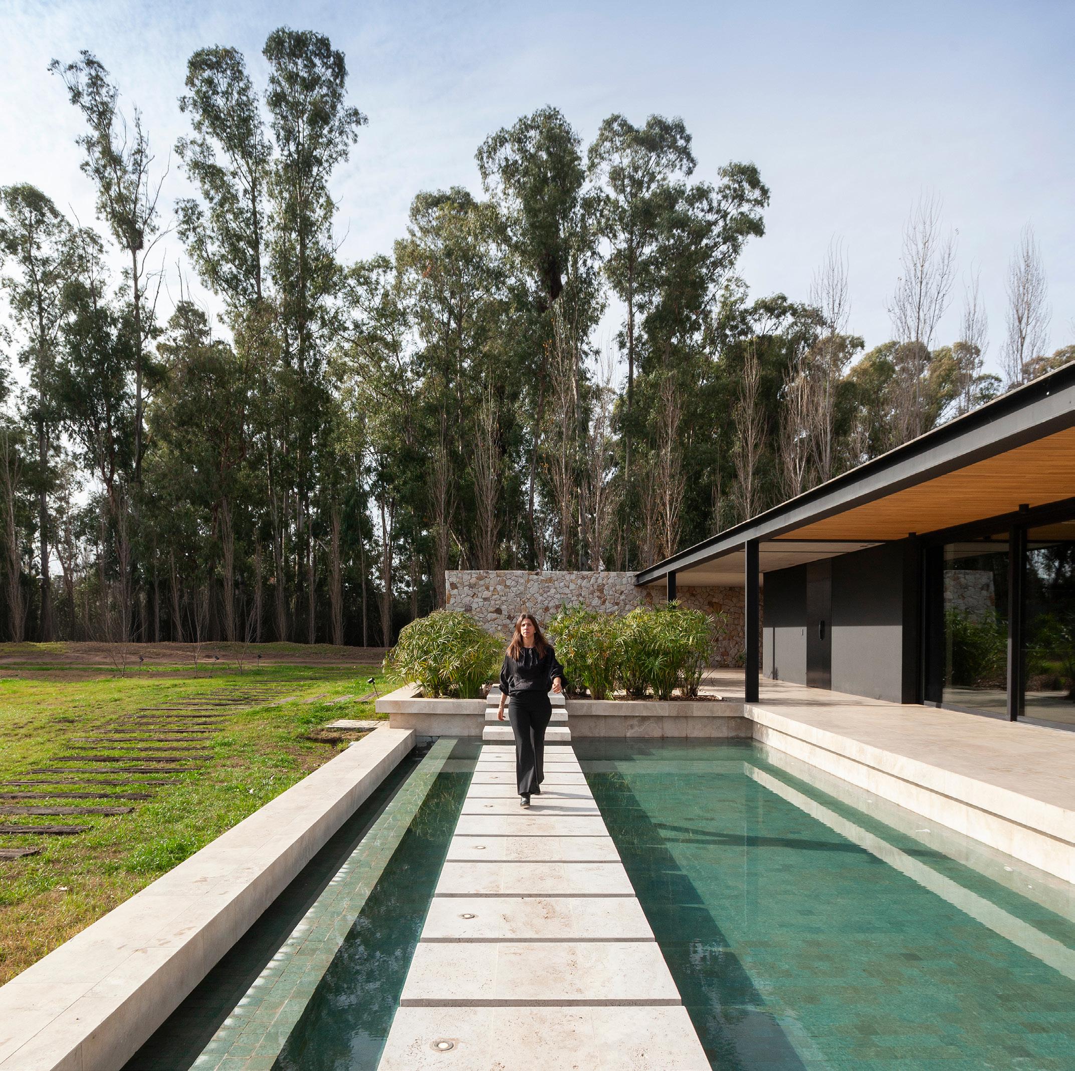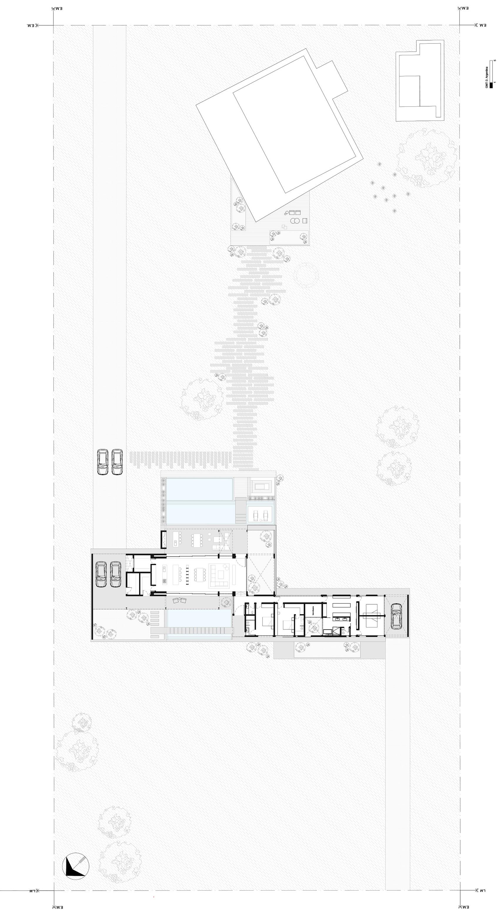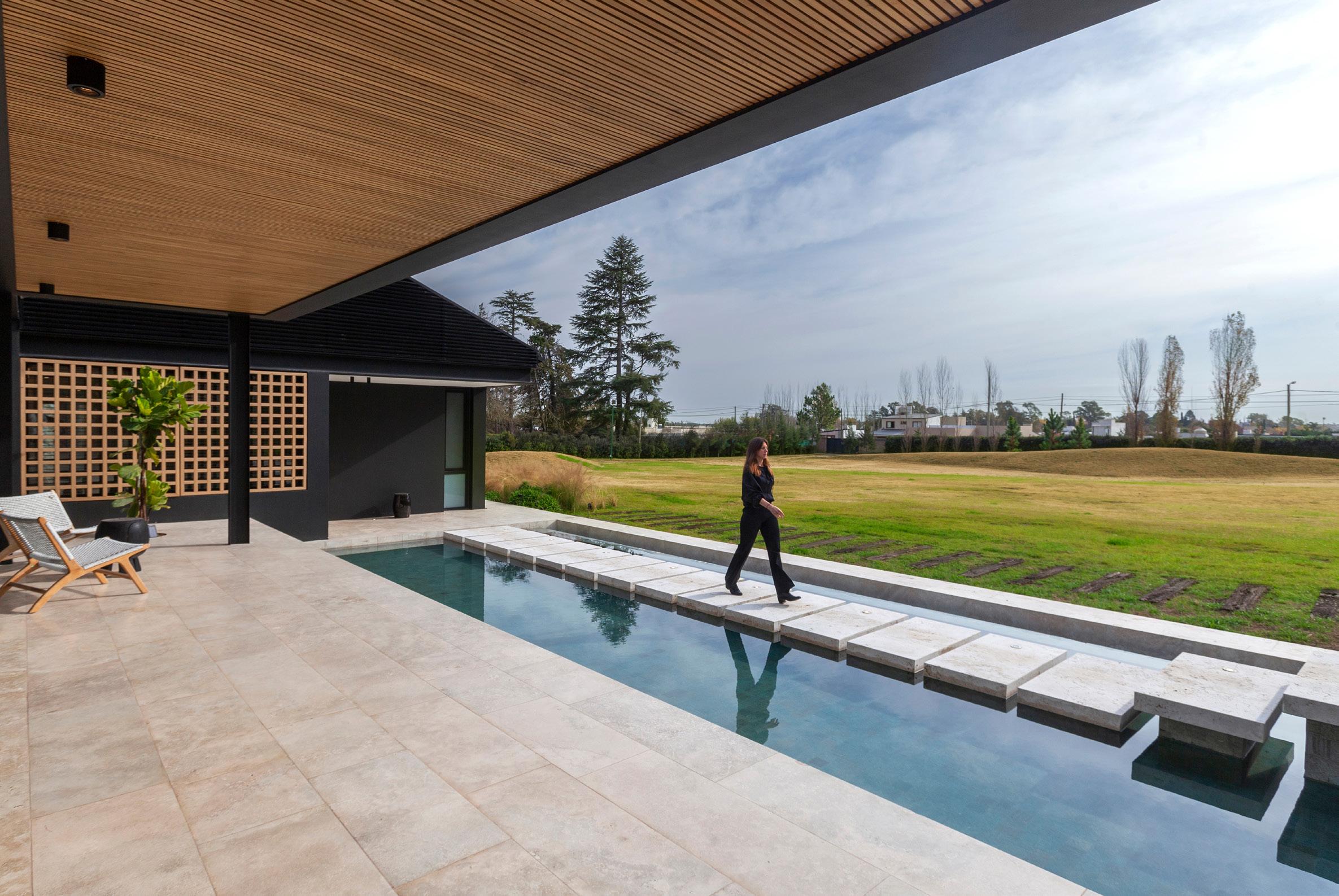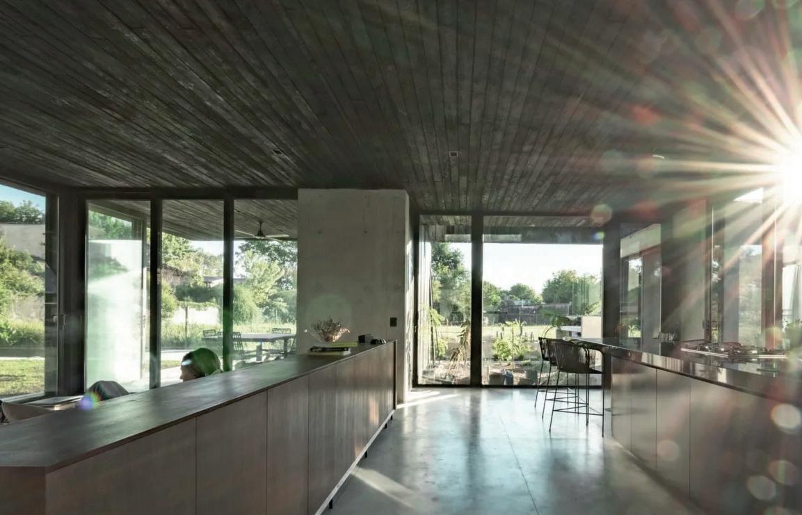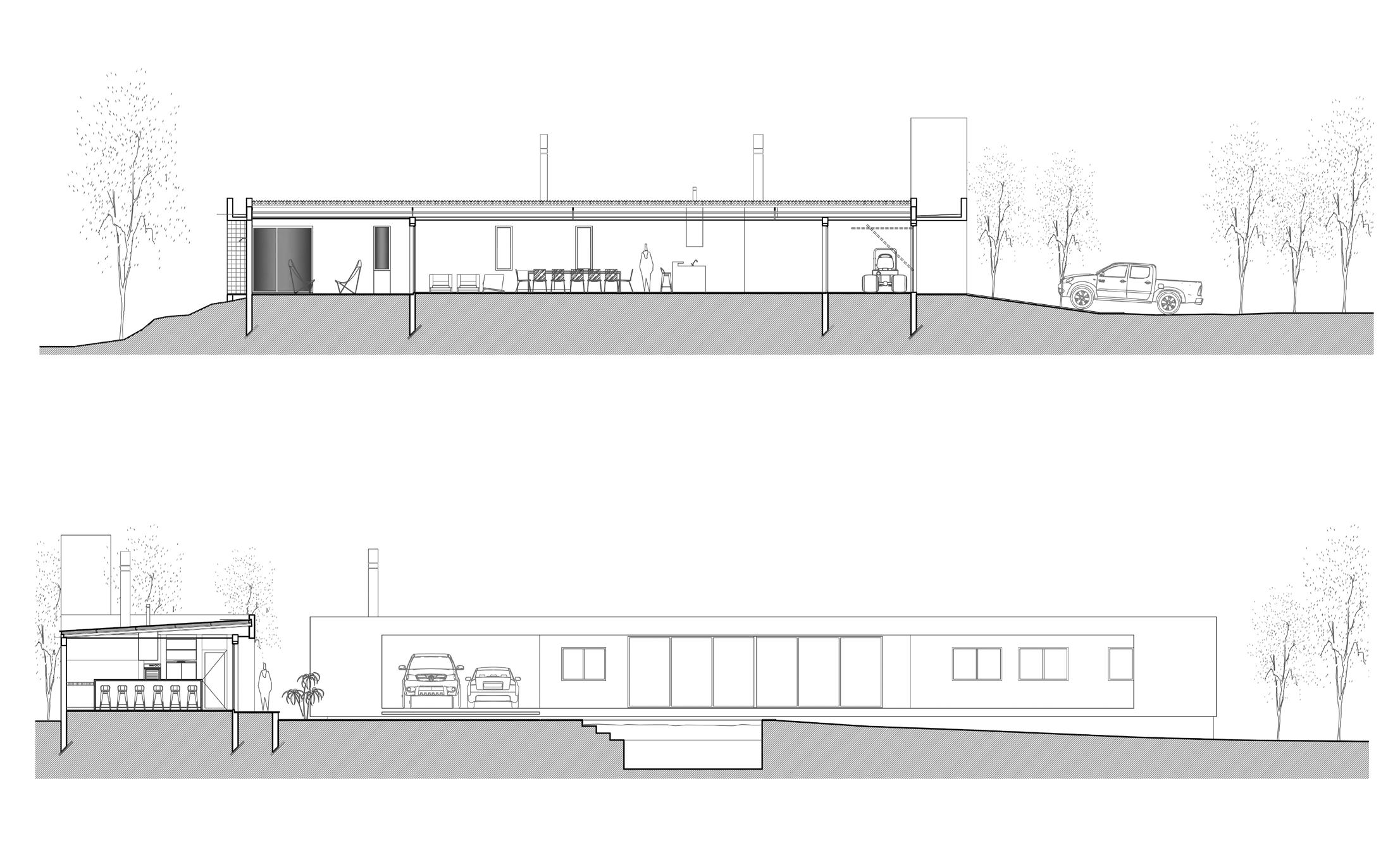 Una casa de campo donde los espacios de transición entre interior y exterior resuelven la cuestión climática y programática. Protegen el interior del sol en días calurosos de verano y permiten la captación solar directa en invierno, lo defienden de las lluvias abundantes típicas de la región pampeana norte, protegen de los vientos dominantes y estimulan la ventilación cruzada. En cuanto al programa, el espacio social central refuerza la autonomía de todos los espacios de la casa, que se comunican a través de los semicubiertos, consolidando la relación con el exterior.