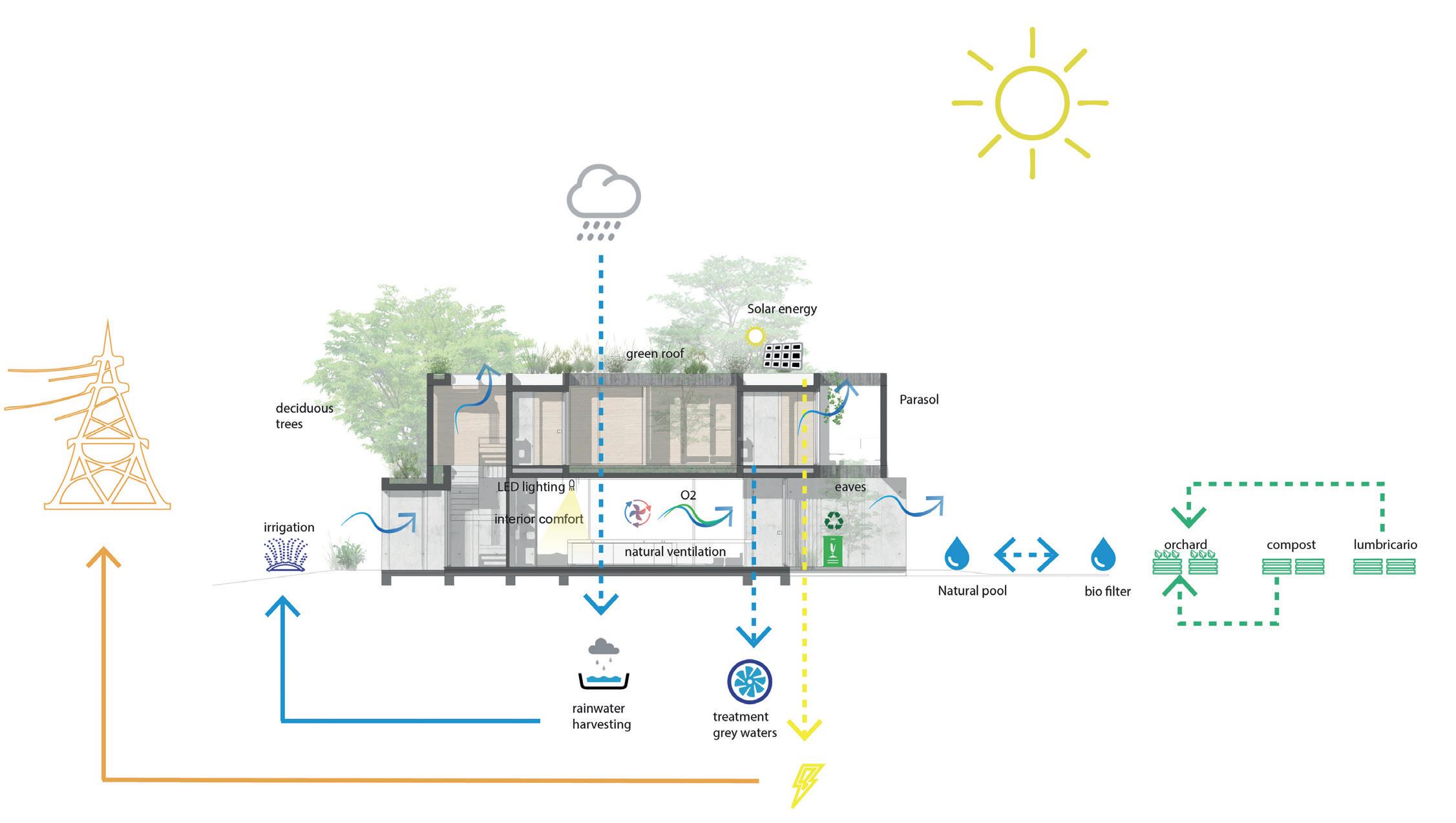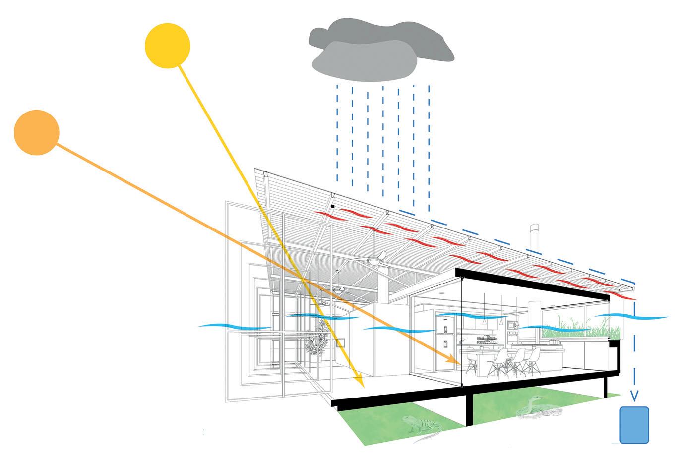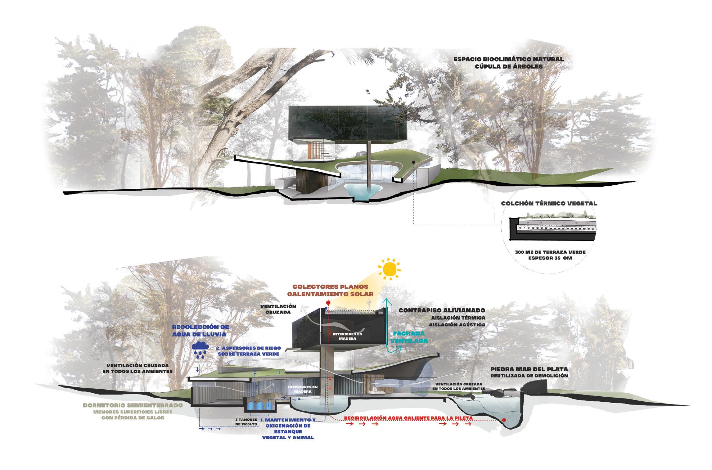 Por otro lado, el proyecto incorpora la utilización de termotanque solar con respecto a la energía, y un sistema sencillo de recuperación de agua de lluvia para riego, que funciona por acumulación y gravedad. También se prevé el espacio para un hogar/salamandra (calefacción con combustible renovable). Para completar la propuesta, se recomienda la plantación de un árbol caduco en el patio con orientación norte, de manera que en verano proteja las habitaciones de los rayos del sol y en invierno permita su aprovechamiento.