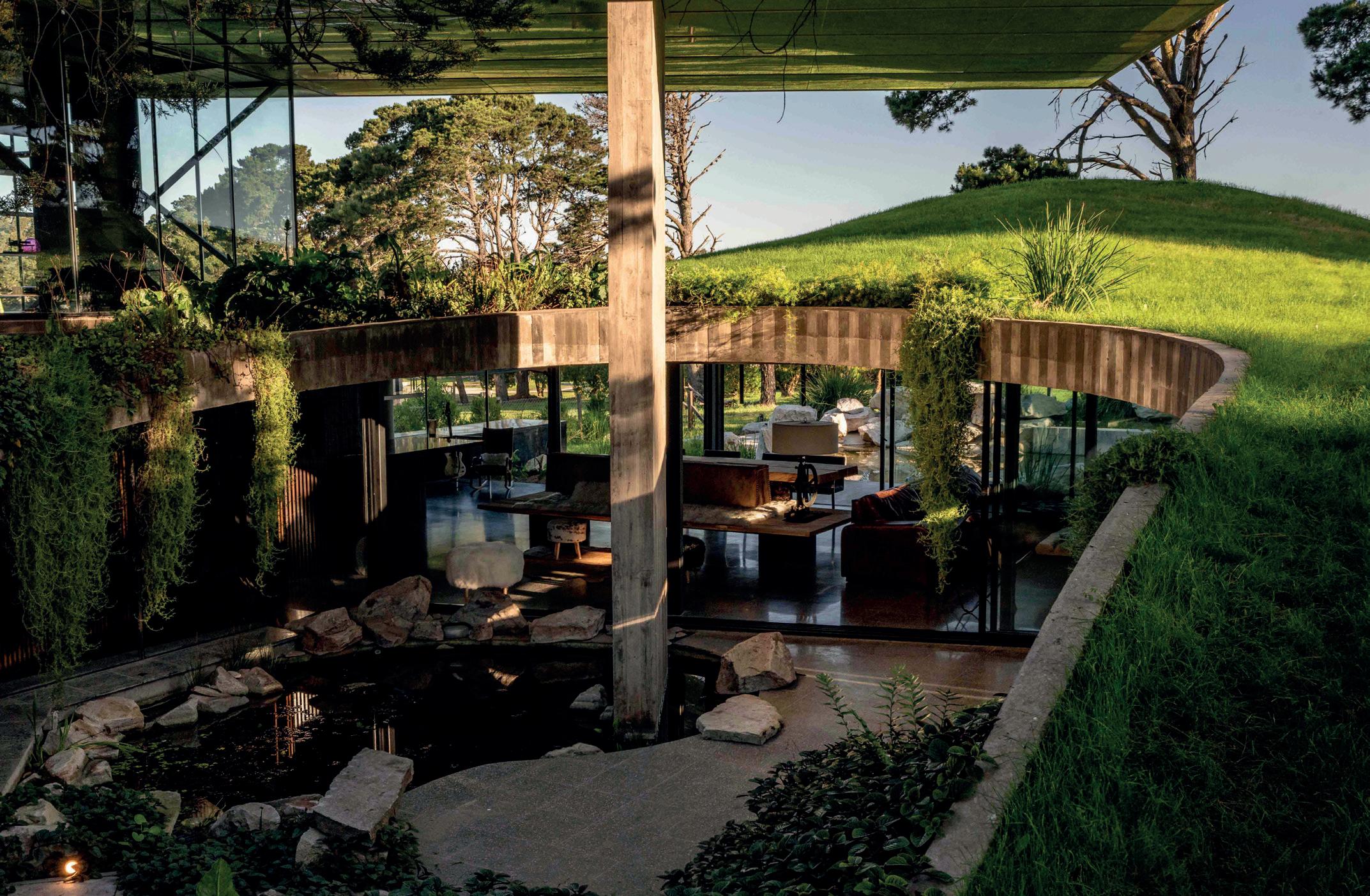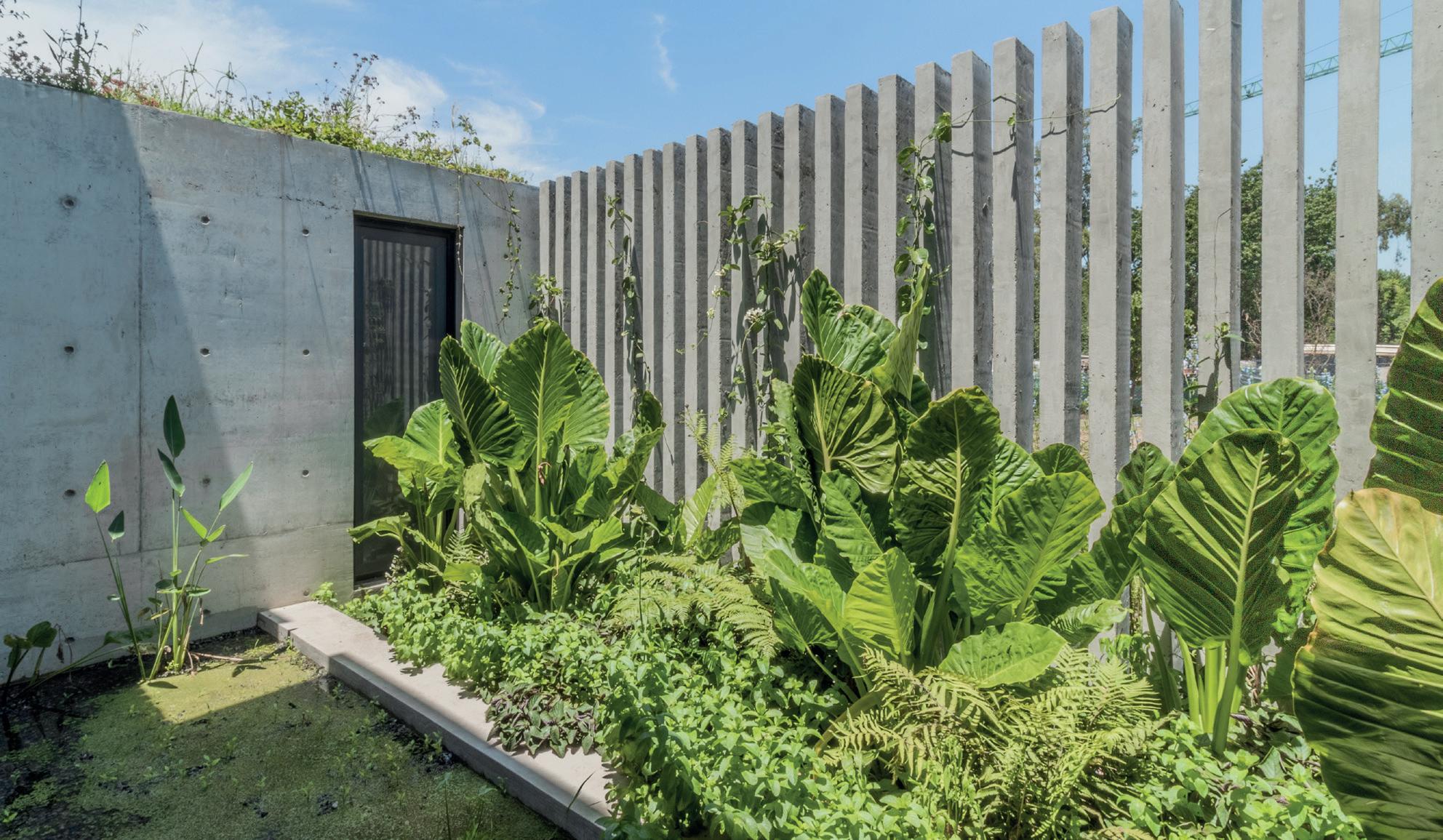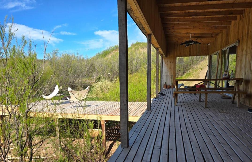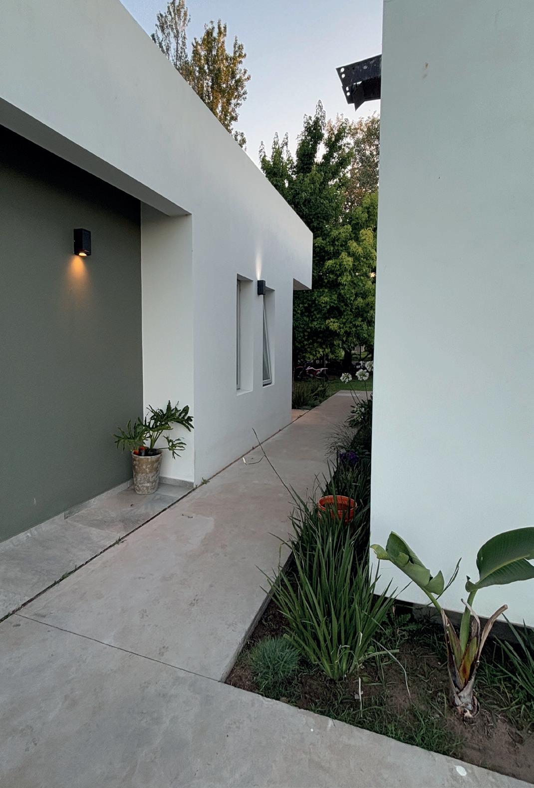 Patios perimetrales se integran en la vivienda, no solo colaborando con la organización espacial, sino también regulando y cualificando la relación entre el interior y exterior. Los patios son parte de este juego de fundir el interior de la vivienda con el exterior, al tiempo que garantizan el asoleamiento y la ventilación natural. El diseño del paisaje exterior busca minimizar la energía destinada a su mantenimiento, limitándose a mantener especies autóctonas. Estas especies colaboran con la protección del sol del oeste en verano y ayudan a disminuir la temperatura estival del viento del noroeste. Es un aporte a la concientización y preservación del ecosistema pampeano.
