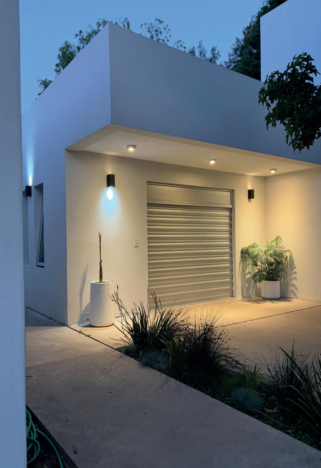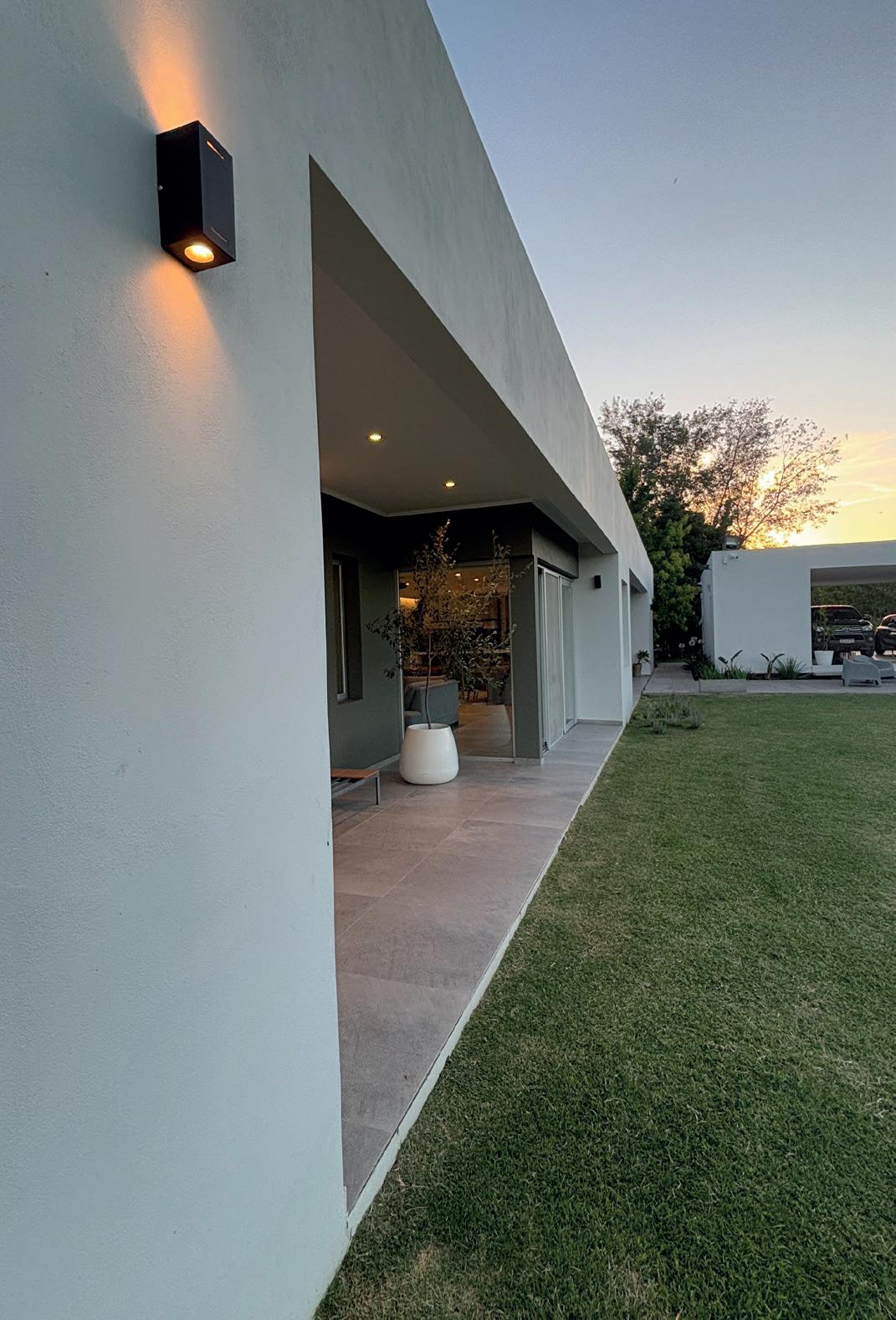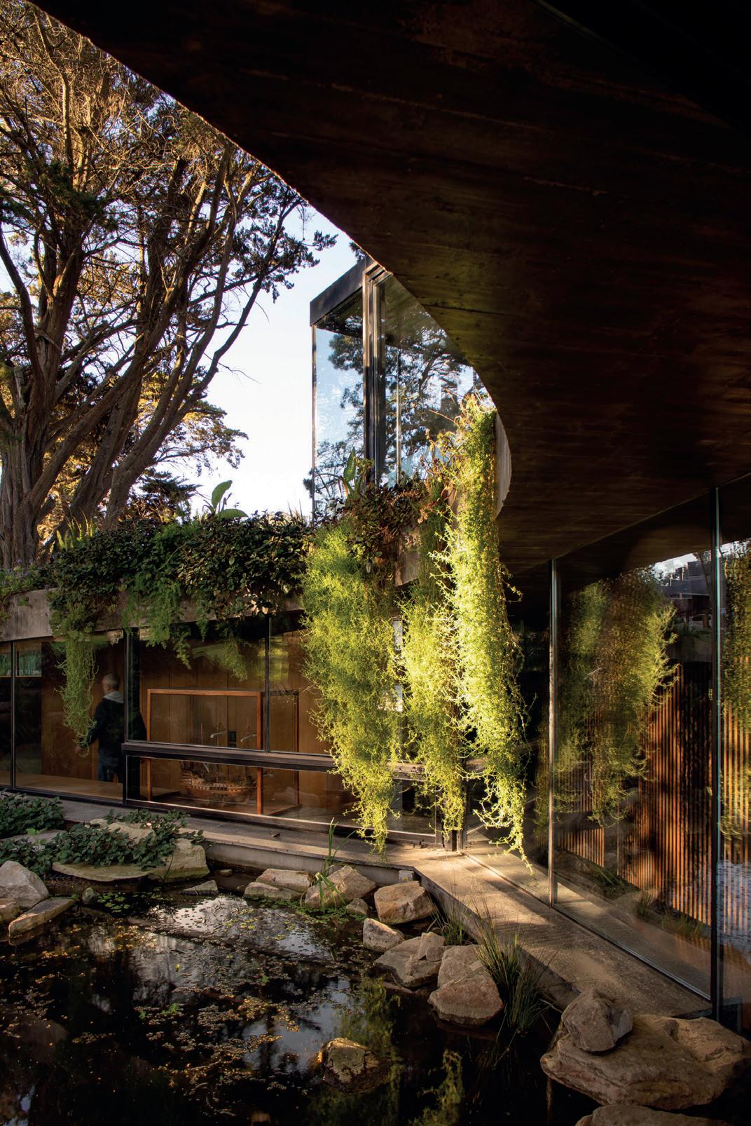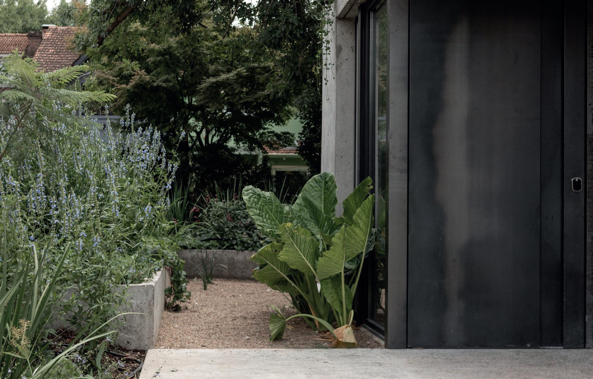 Patios perimetrales se integran en la vivienda, no solo colaborando con la organización espacial, sino también regulando y cualificando la relación entre el interior y exterior. Los patios son parte de este juego de fundir el interior de la vivienda con el exterior, al tiempo que garantizan el asoleamiento y la ventilación natural. El diseño del paisaje exterior busca minimizar la energía destinada a su mantenimiento, limitándose a mantener especies autóctonas. Estas especies colaboran con la protección del sol del oeste en verano y ayudan a disminuir la temperatura estival del viento del noroeste. Es un aporte a la concientización y preservación del ecosistema pampeano.