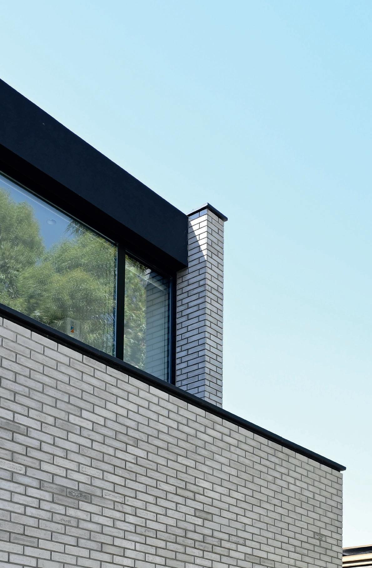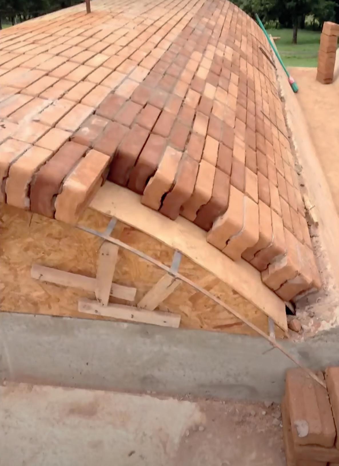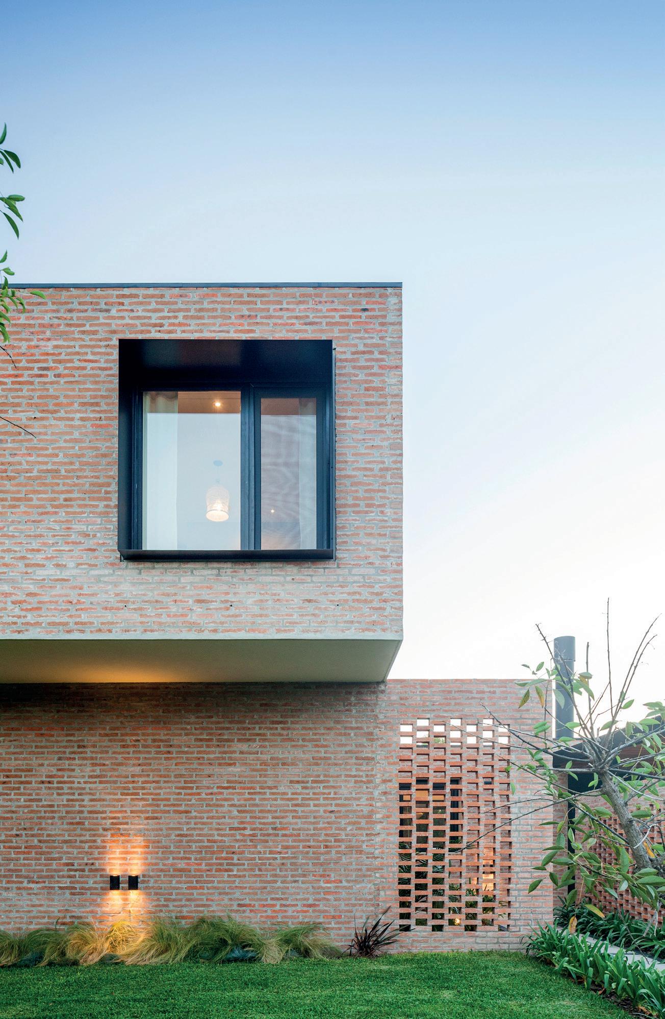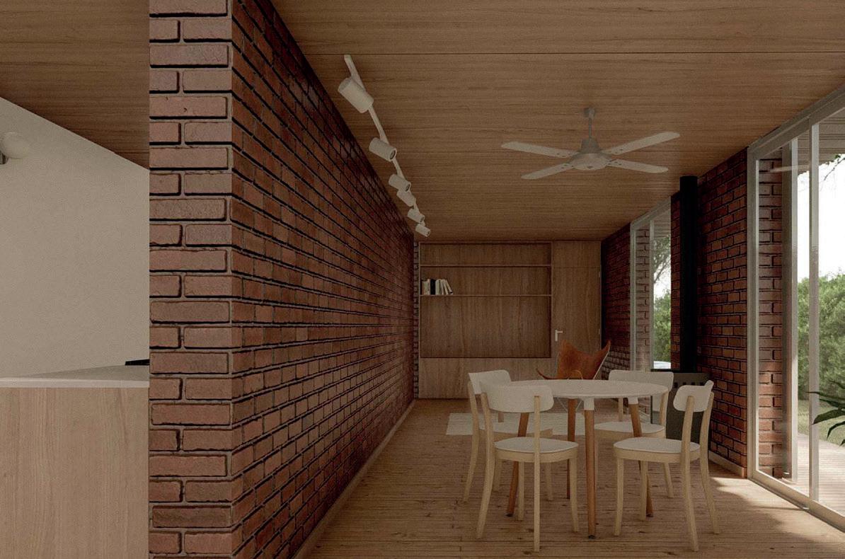 La cubierta está conformada por un entramado de rollizos de eucaliptos de 8” de diámetro y una estructura secundaria a modo de clavaduras de 2”x 3”. Sobre esta estructura se montan tejuelas de barro cocido, con características similares en color y texturas a los ladrillos de los muros portantes. La cubierta incluye una capa de compresión de hormigón reforzada con malla de hierro de 6mm, barrera de vapor y EPS como aislante térmico. Colaborando con este fin, el contrapiso alivianado con pendiente, un azotado hidrófugo, una carpeta de nivelación dan terminación a la cubierta, para luego poder aplicar una membrana líquida color blanco que aporta reflectividad y reduce la transmitancia térmica. Las carpinterías son de PVC simil madera con vidrios DVH, diseñadas como vanos de piso a techo, compuestas por paños fijos y de abrir. Esto posibilita la fusión con el espacio exterior. Los solados interiores y exteriores se materializan con ladrillo común recuperando la tradición de la vivienda pampeana, ofreciendo durabilidad y coherencia estética con el proyecto. El concepto medioambiental de la propuesta se completa con la incorporación de colectores solares para calentar el agua sanitaria y paneles fotovoltaicos para la generación de energía eléctrica. Además, se utilizan artefactos eléctricos Energy star, lámparas de bajo consumo, artefactos sanitarios de bajo consumo de agua, sistema de captación y reutilización de agua de lluvia y aplicación de pinturas de baja emisividad, elementos que completan el concepto medio ambiental de la propuesta.