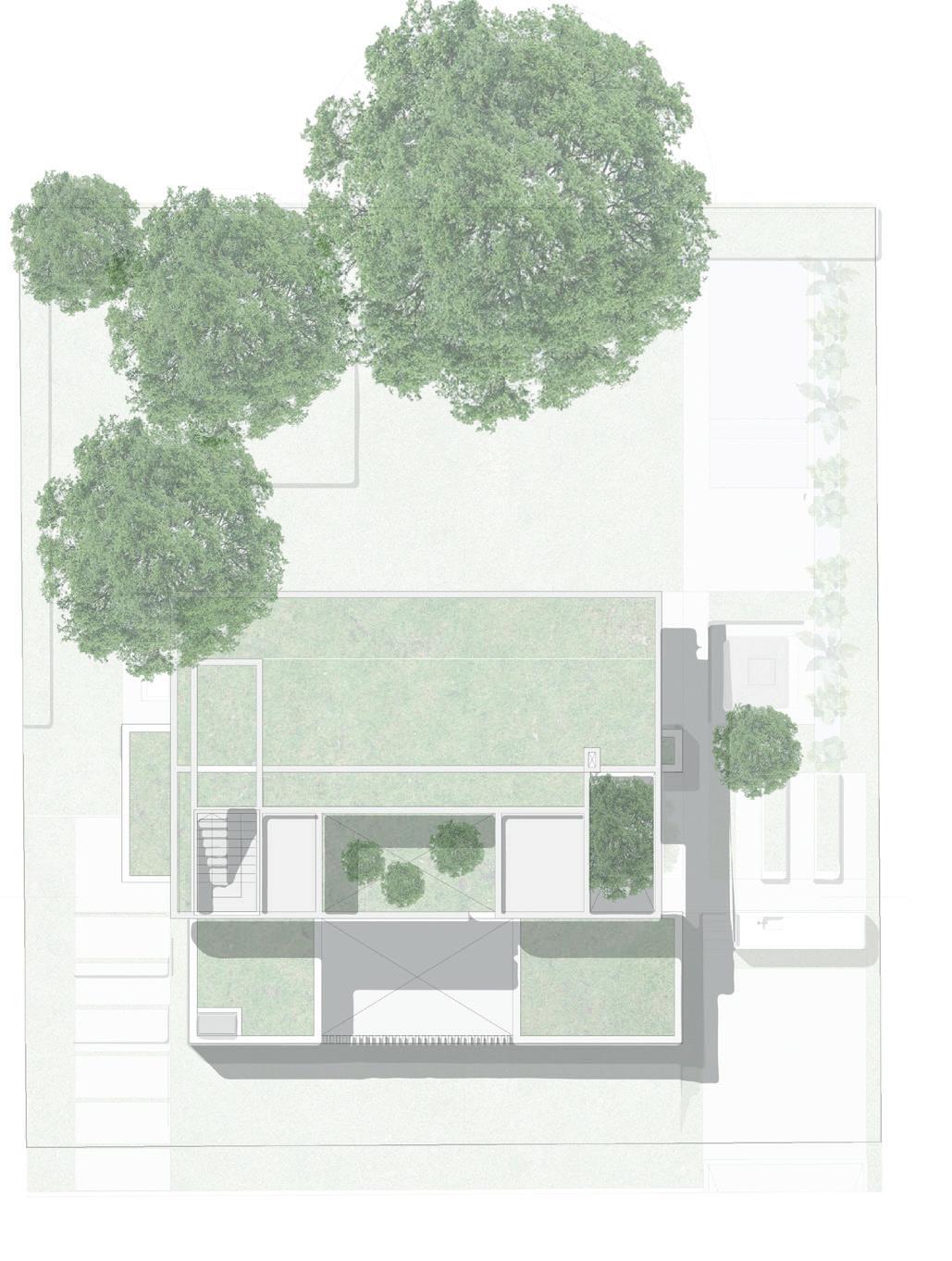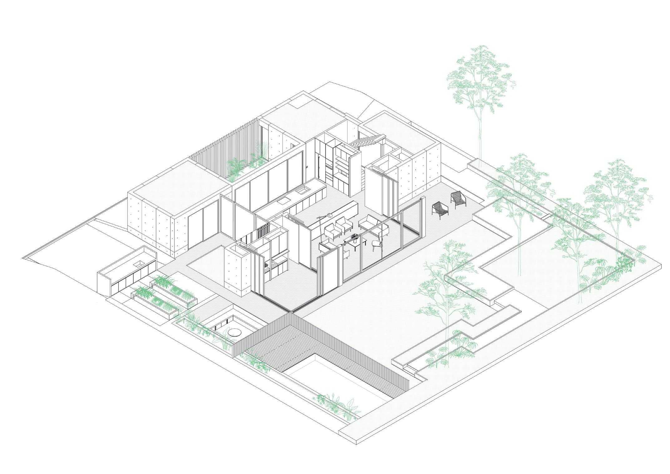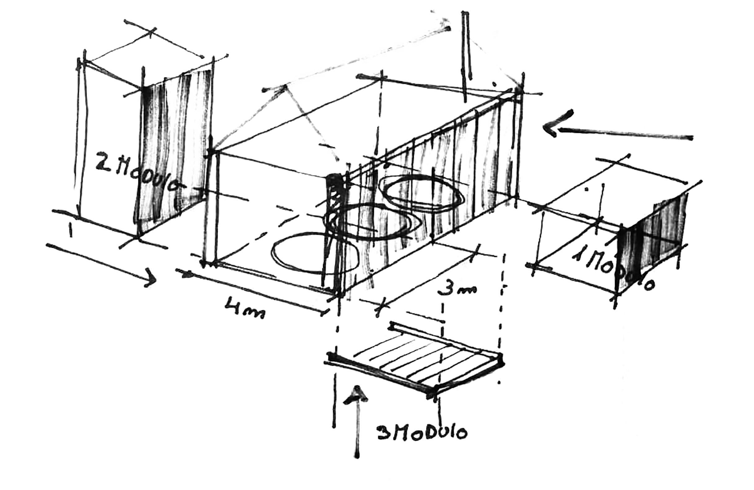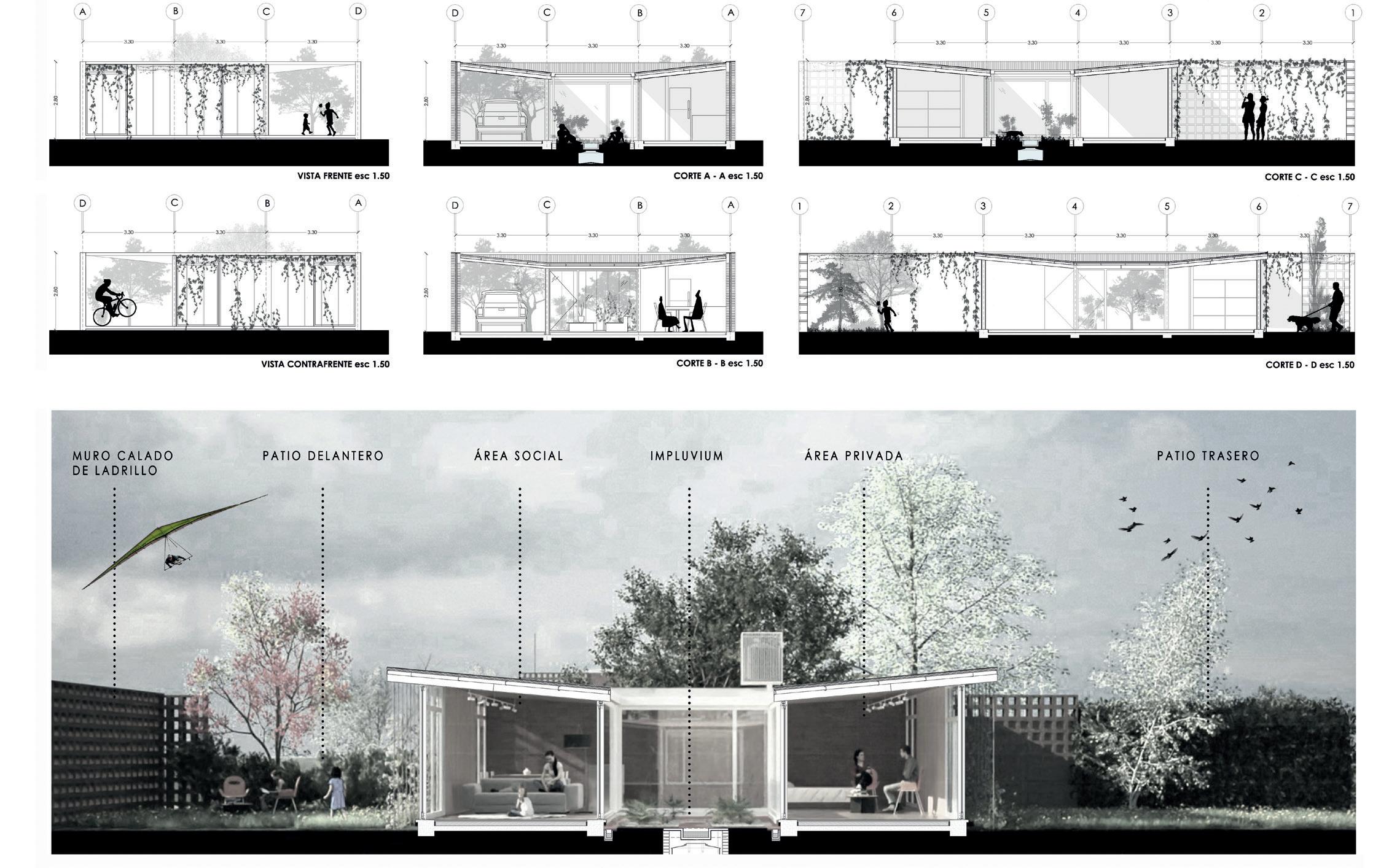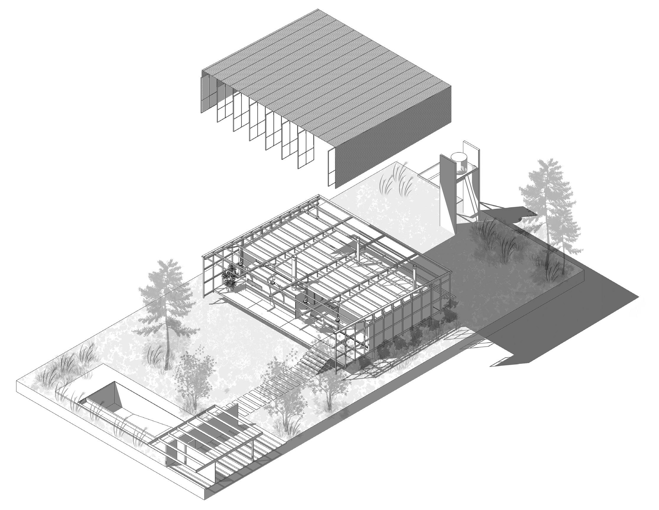 • El módulo central es el vacío: un impluvium. El patio opera en el proyecto como el corazón de la organización y genera la aparición del vacío en la trama modular. Se configura como el colector de las aguas de lluvia y abastece el estanque central que almacena el insumo para usos complementarios.