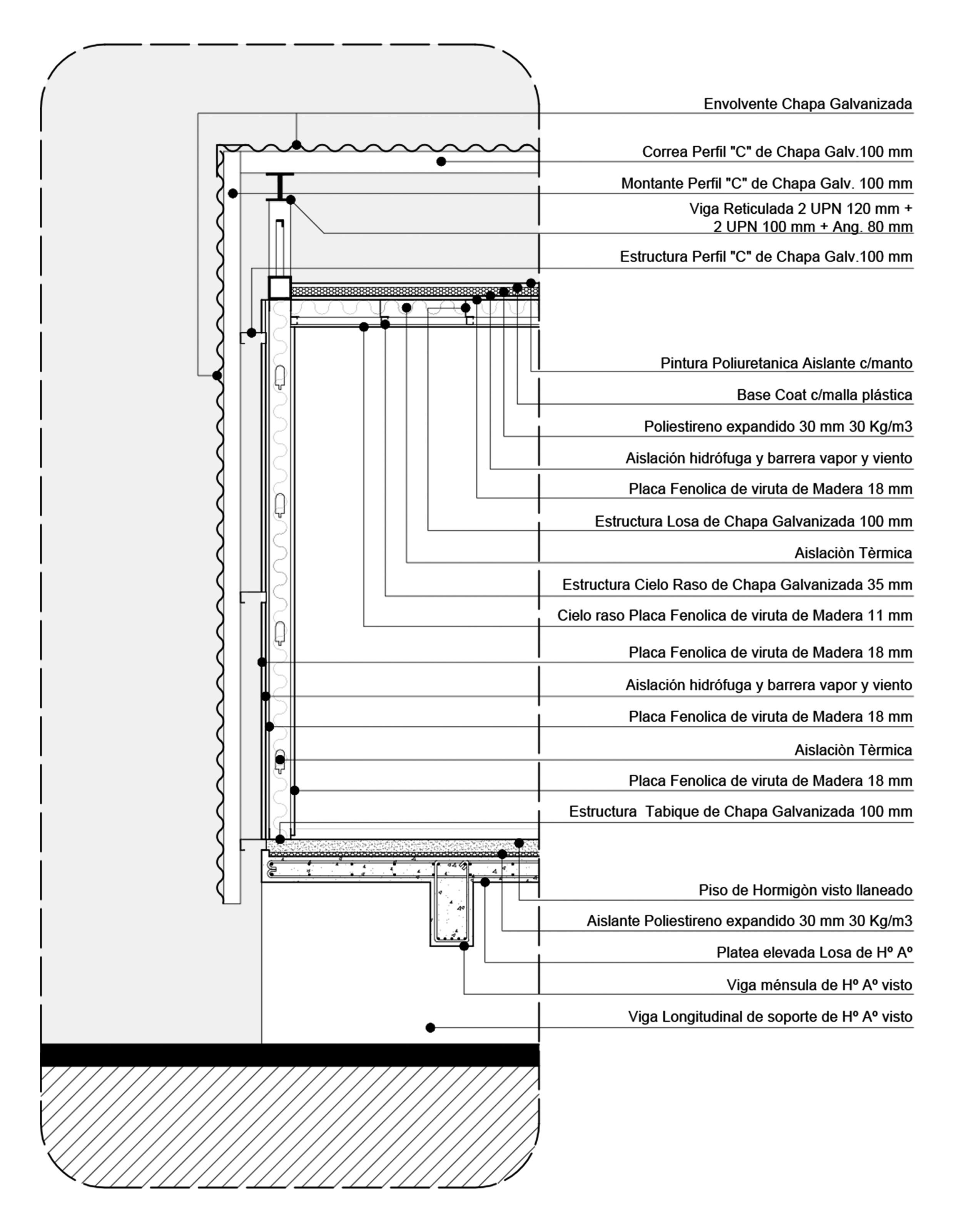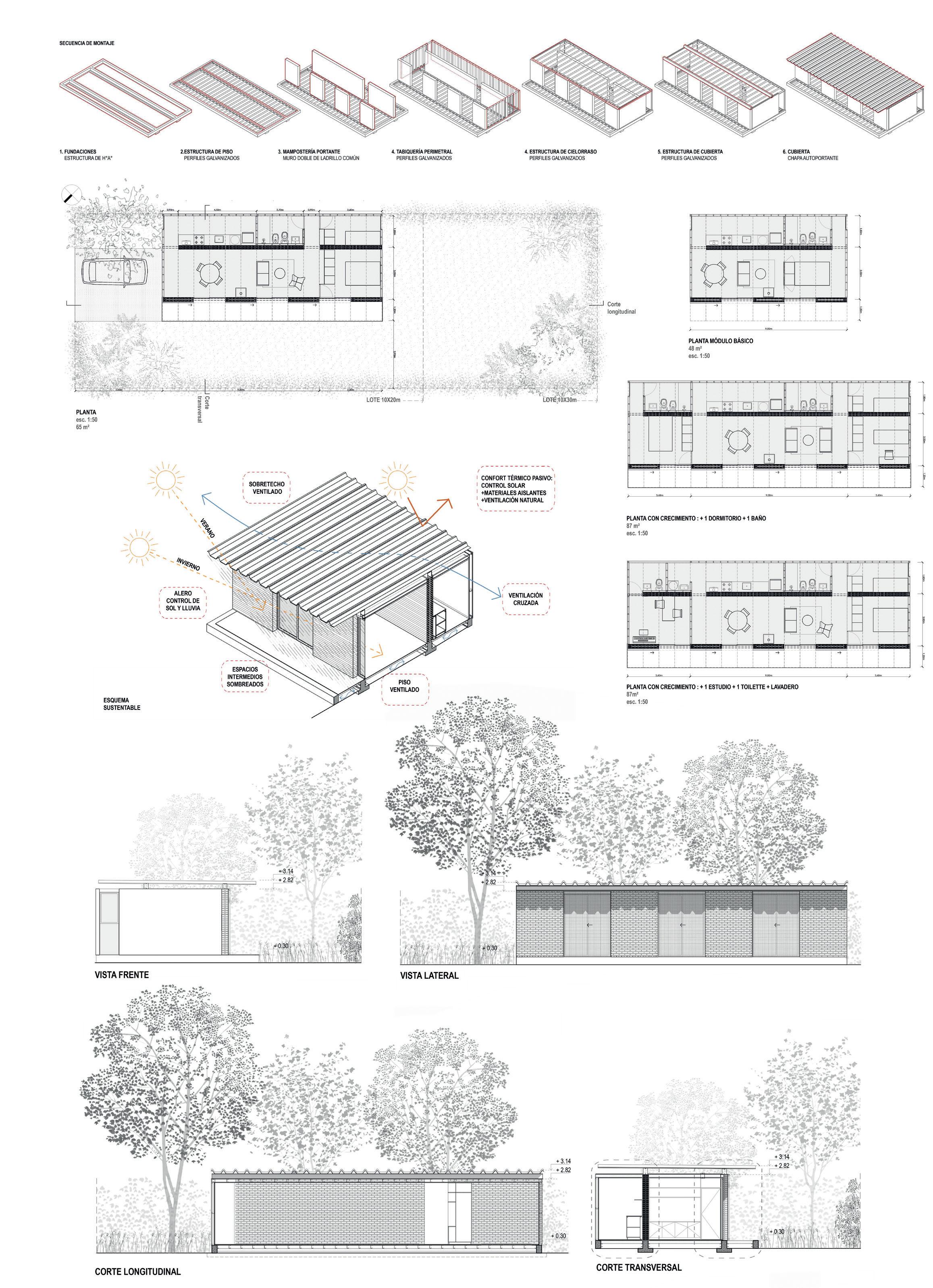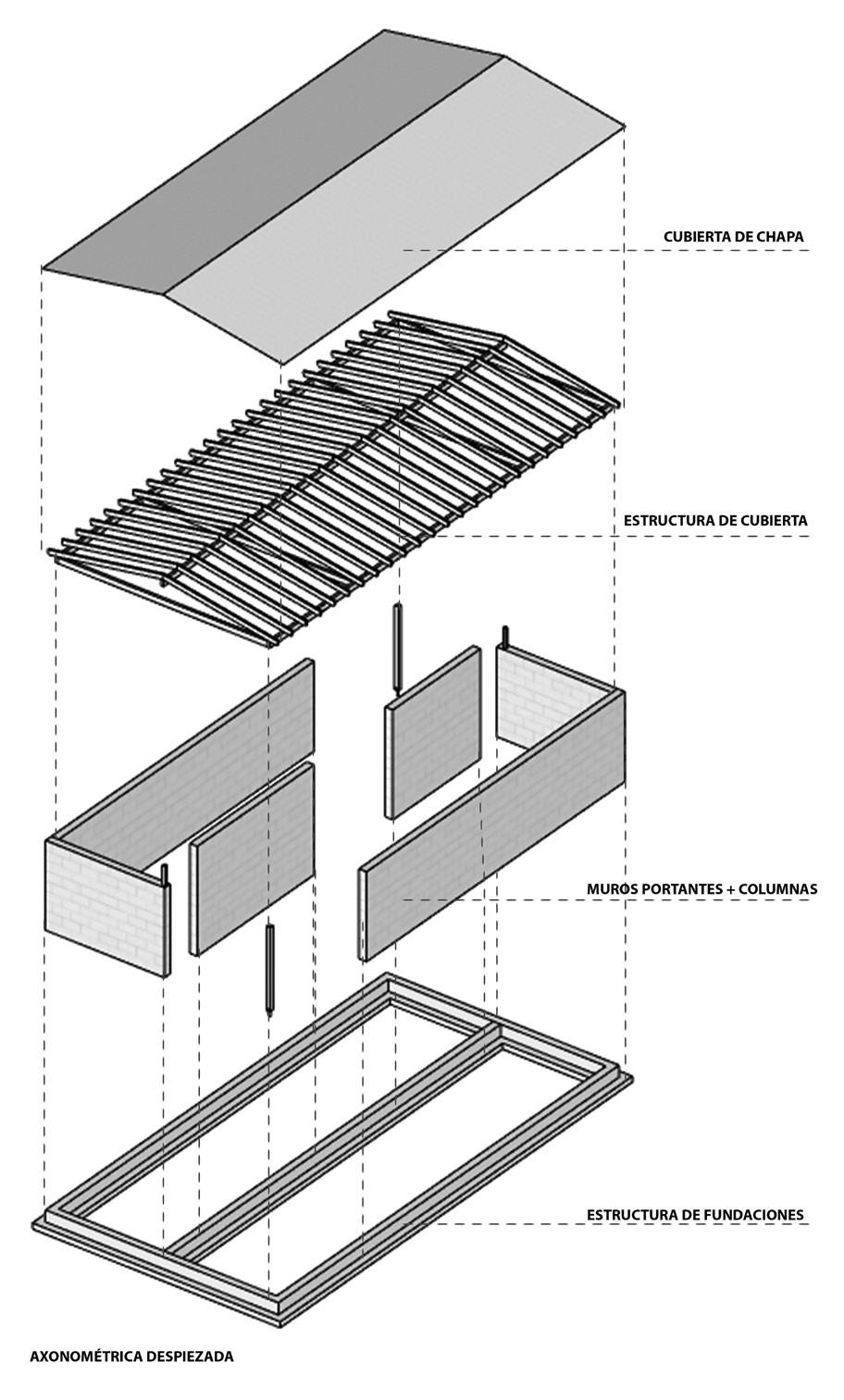 La secuencia constructiva propuesta consiste en la ejecución consecutiva de fundaciones (hormigón armado), estructura de piso (perfiles galvanizados), mampostería portante (ladrillo común visto), tabiquería perimetral (perfiles galvanizados), estructuras de cielorraso y cubierta (perfiles galvanizados) y cubierta (chapa autoportante).