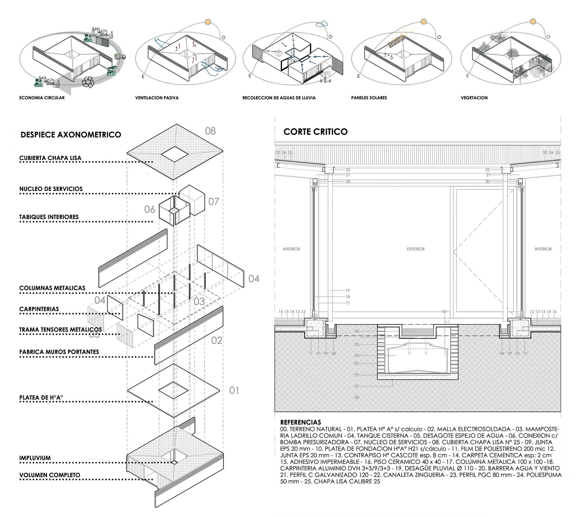 Tecnología/fundaciones/materialización. Para esta propuesta se elige la construcción en seco -steel frame-, basada en estructura metálica y cerramiento exterior de chapa, pero incorporando todas las aislaciones y terminaciones que requieren la habitabilidad de una vivienda. Esto permitirá la estandarización de la producción y la fácil incorporación de mano de obra.
