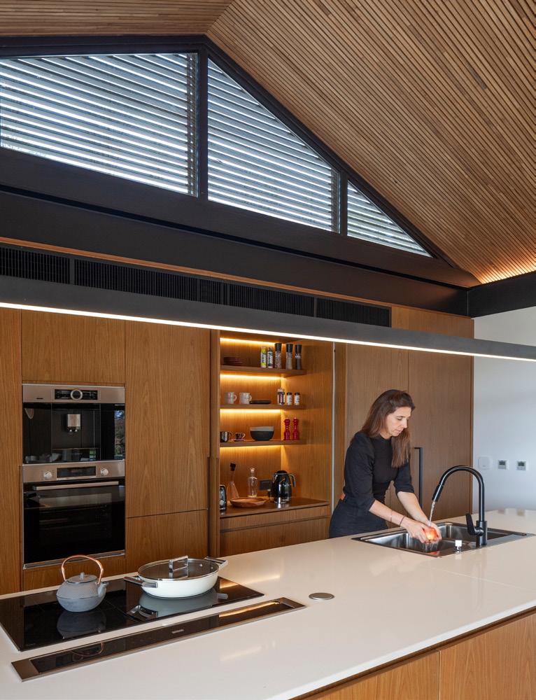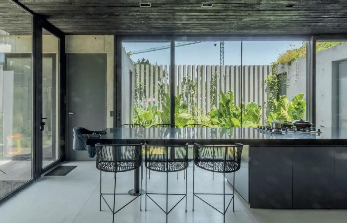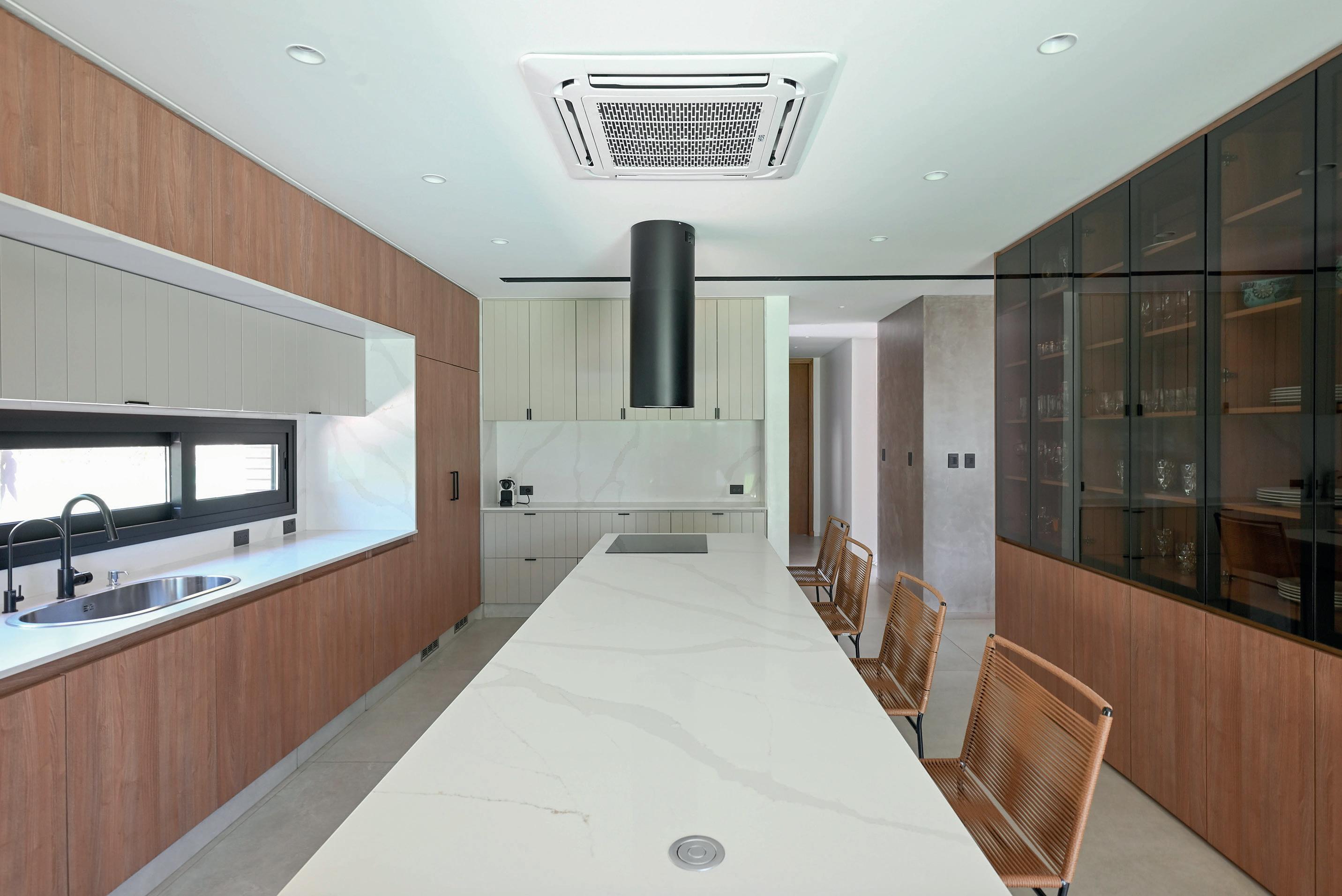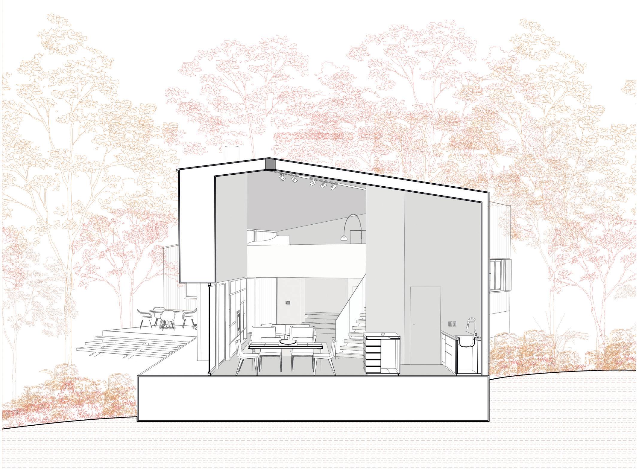 Un espacio lateral alberga los servicios cocina y baño, concentrando la totalidad de las instalaciones para racionalizar el recorrido de desagües y provisión de agua.