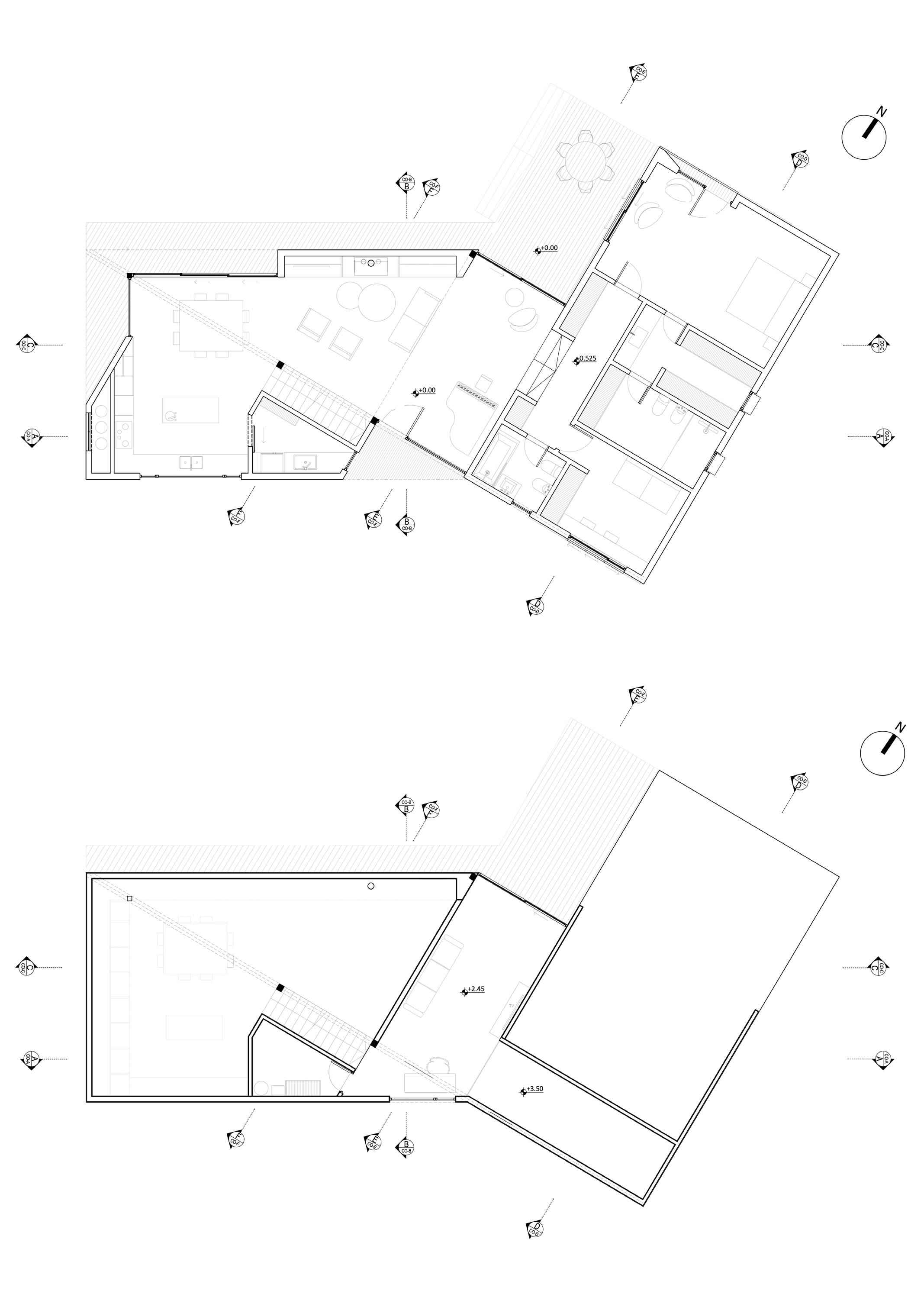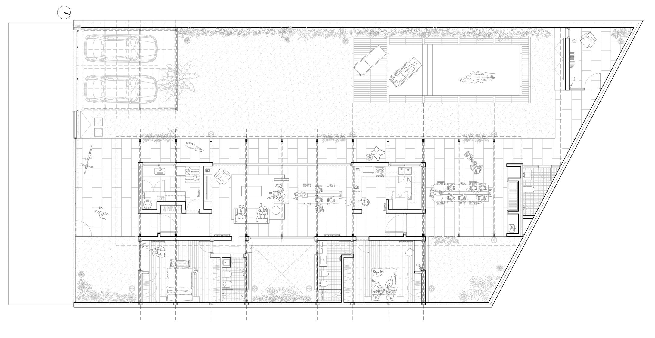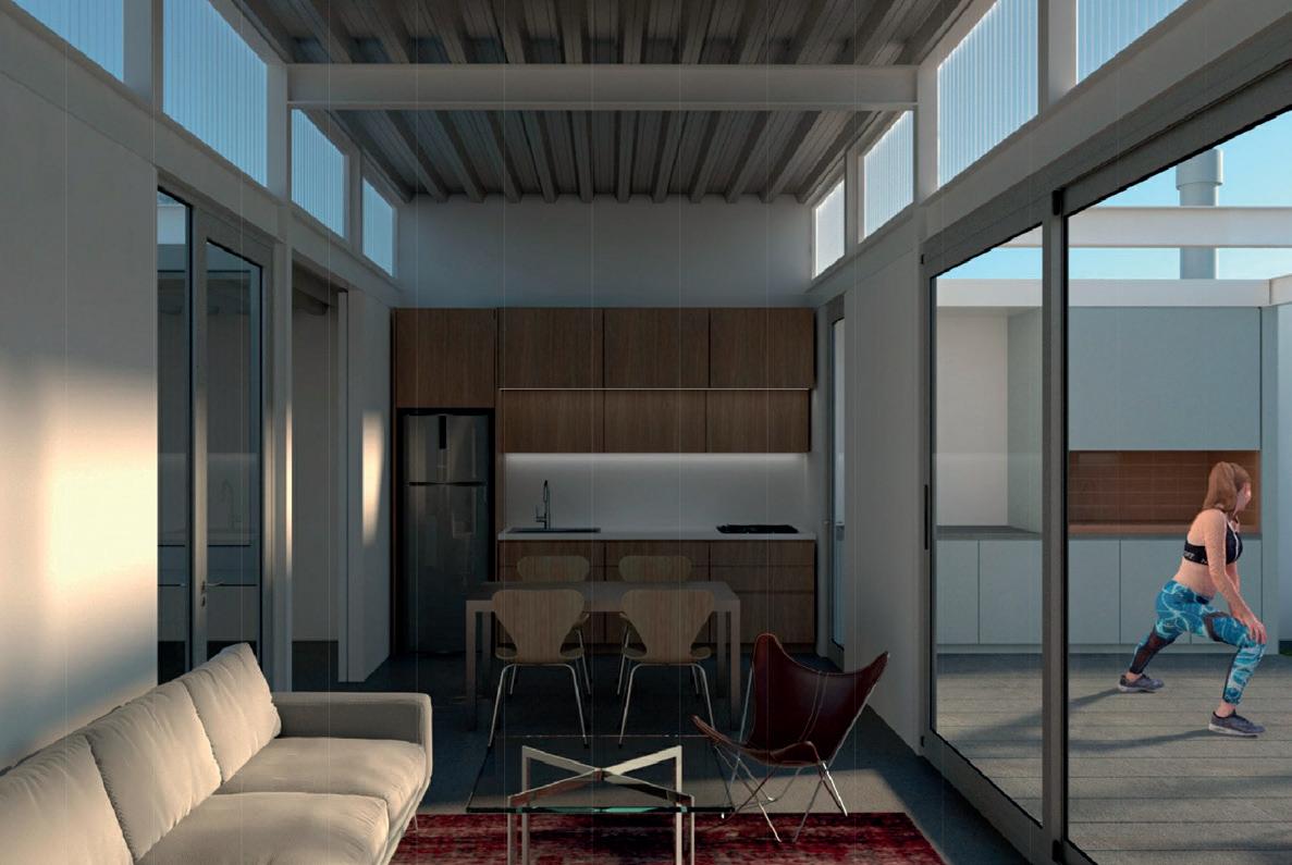 • Las áreas sociales (comedor-estar) siempre buscan las mejores orientaciones. De esta manera, de acuerdo a la ubicación relativa del Norte, se define que aparezcan en el frente o contrafrente del predio según lo indique la variable del asoleamiento.