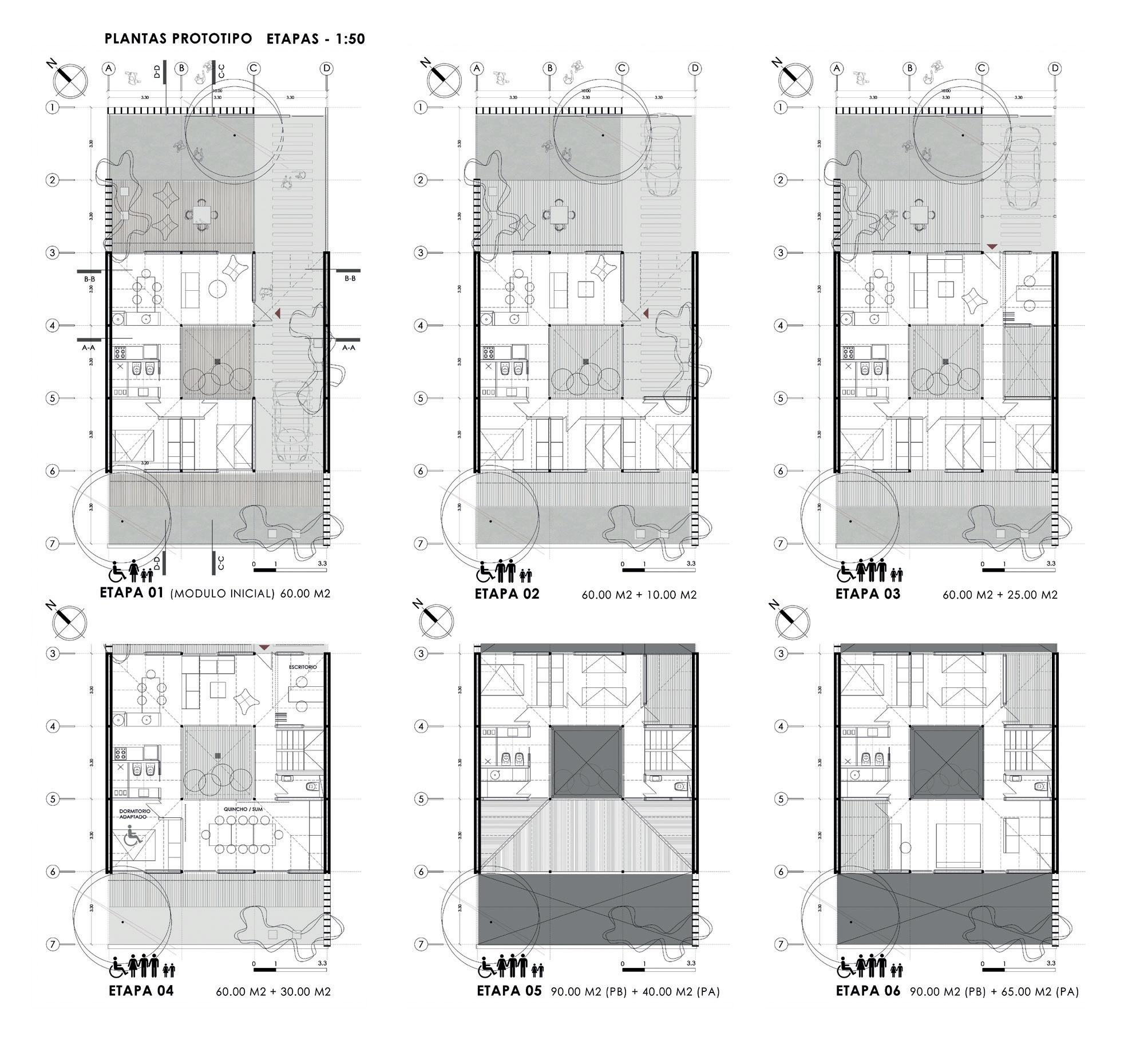 Las posibilidades de crecimiento de la vivienda parten de un módulo básico de 48 metros cuadrados, pudiendo ampliarse a un dormitorio más un baño y con la alternativa de añadir otros dos dormitorios. Se propone otra manera de crecimiento: dos dormitorios más estudio, toilette y lavadero.