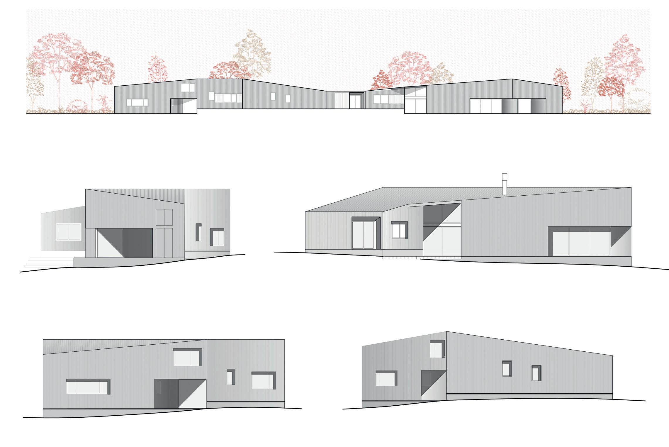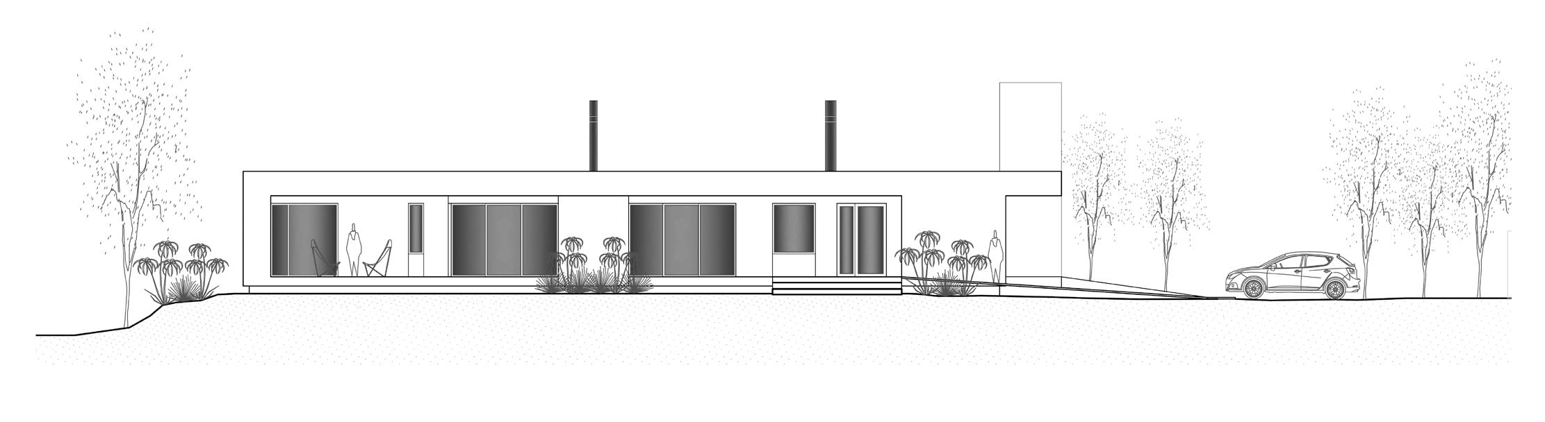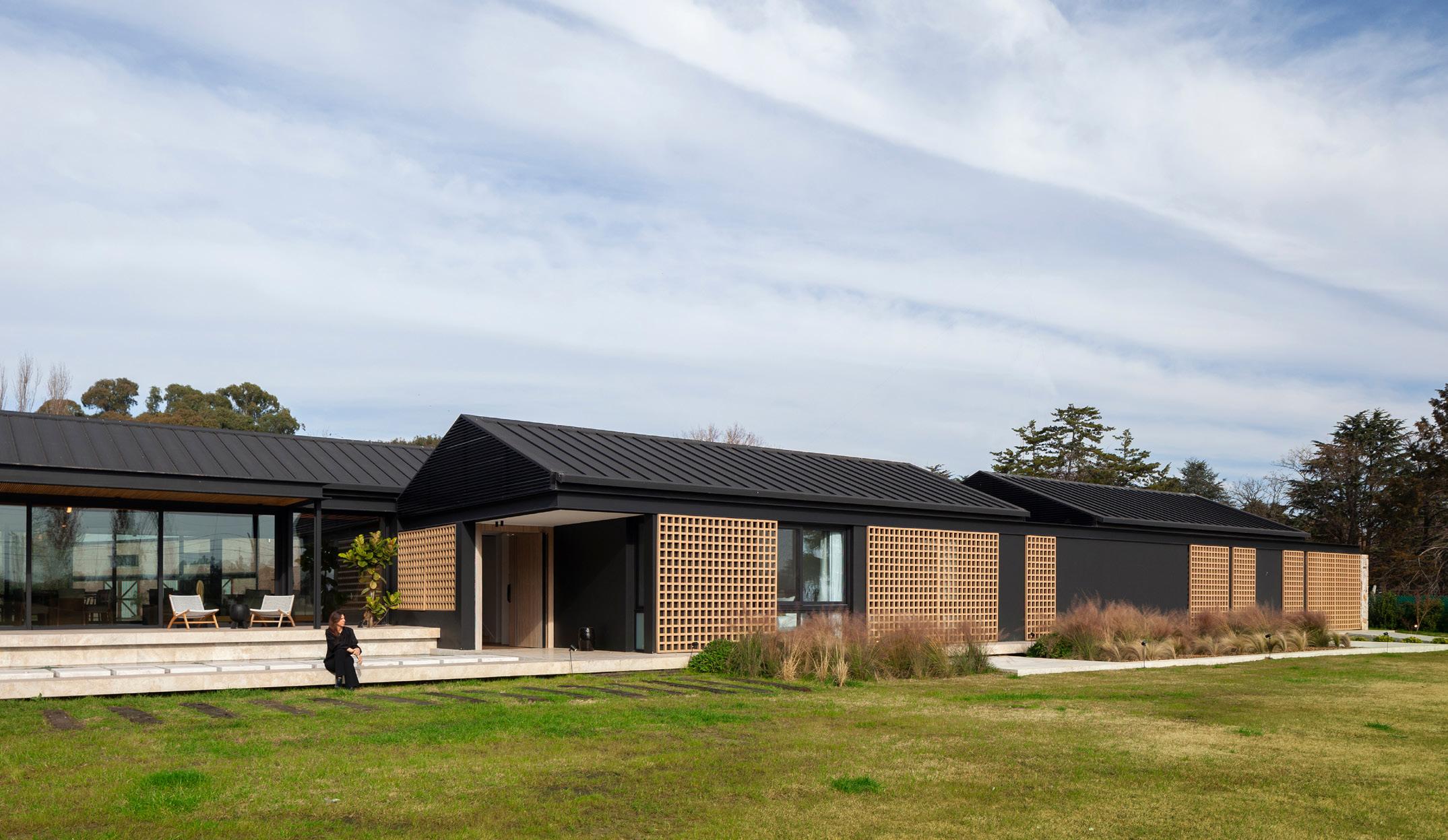 En una zona de baja densidad y construcciones dispersas, la presencia paisajística de la llanura pampeana tiene un rol preponderante. Se propone una casa austera y despojada acorde al entorno, con una disposición lineal que potencia la horizontalidad del paisaje.