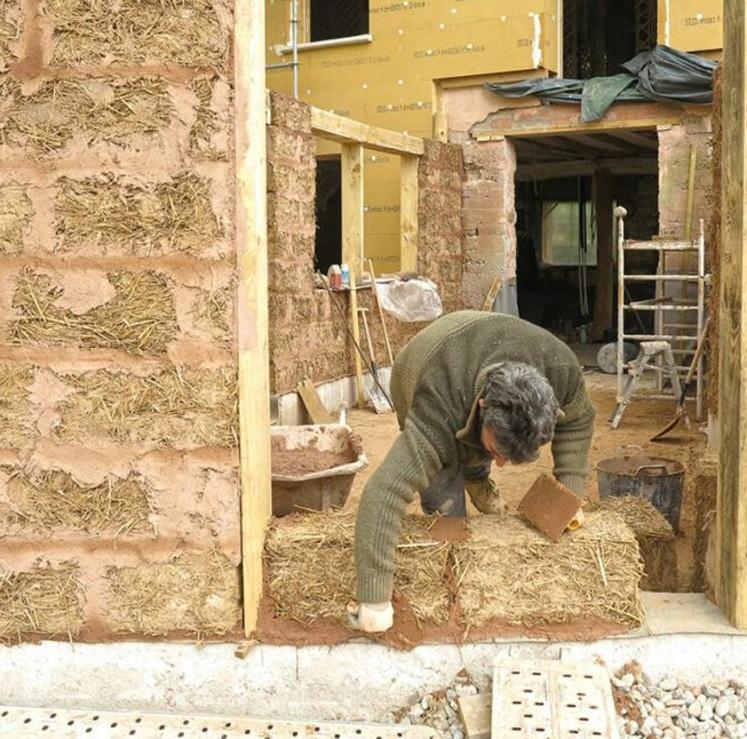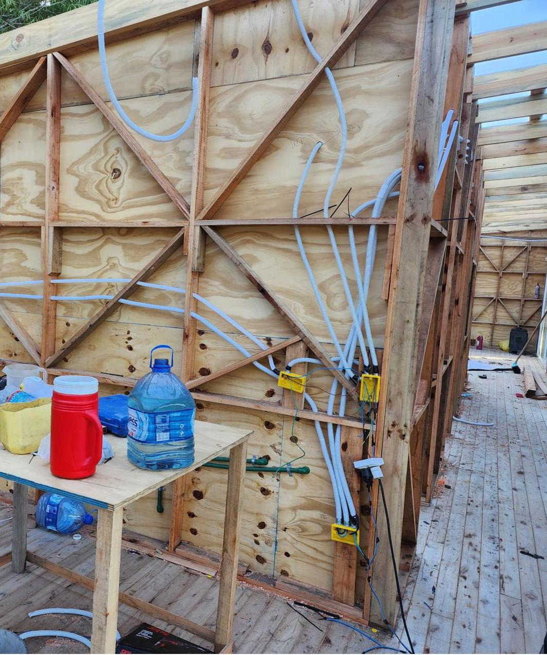 El sistema de fundación de la vivienda está pensado a partir de una platea de hormigón armado, de donde emergen muros de doble traba de ladrillo común, revestidos en su interior con un sistema tipo balloon frame con aislación y la terminación superficial está dado por tableros OSB (Oriented Strand Board) de pino, lo que garantiza su aptitud térmica. Los muros de ladrillo común están arriostrados con vigas de hormigón armado a modo de dintel.