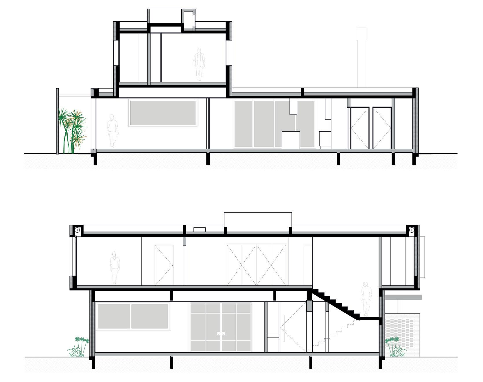 La estrategia material-estructural se traduce en muros gruesos portantes de ladrillo común, en contraposición a la cubierta liviana. Se combina un sistema estructural de construcción tradicional con un sistema liviano de construcción en seco para la envolvente. El sistema constructivo configura espacios flexibles que pueden ampliarse, reducirse y desplazarse fácilmente, teniendo en cuenta los requerimientos del usuario. La gran cubierta libera dos voladizos que configuran el espacio, determinando un sector de servicios hacia la medianera, un espacio flexible de uso y un gran alero como dispositivo de encuentro entre interior y exterior. Los espacios se organizan a partir del módulo de ancho útil de la