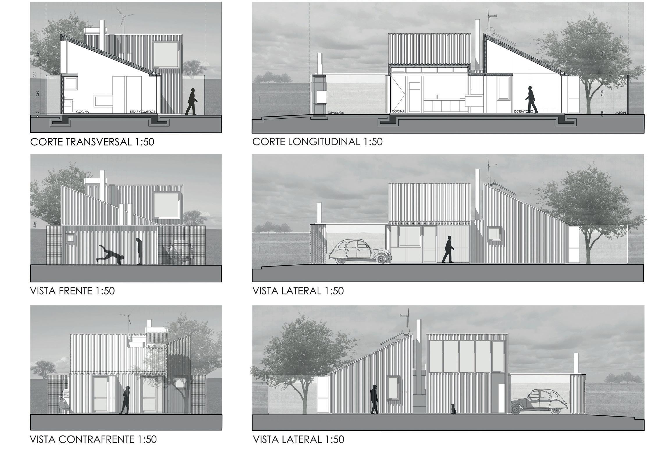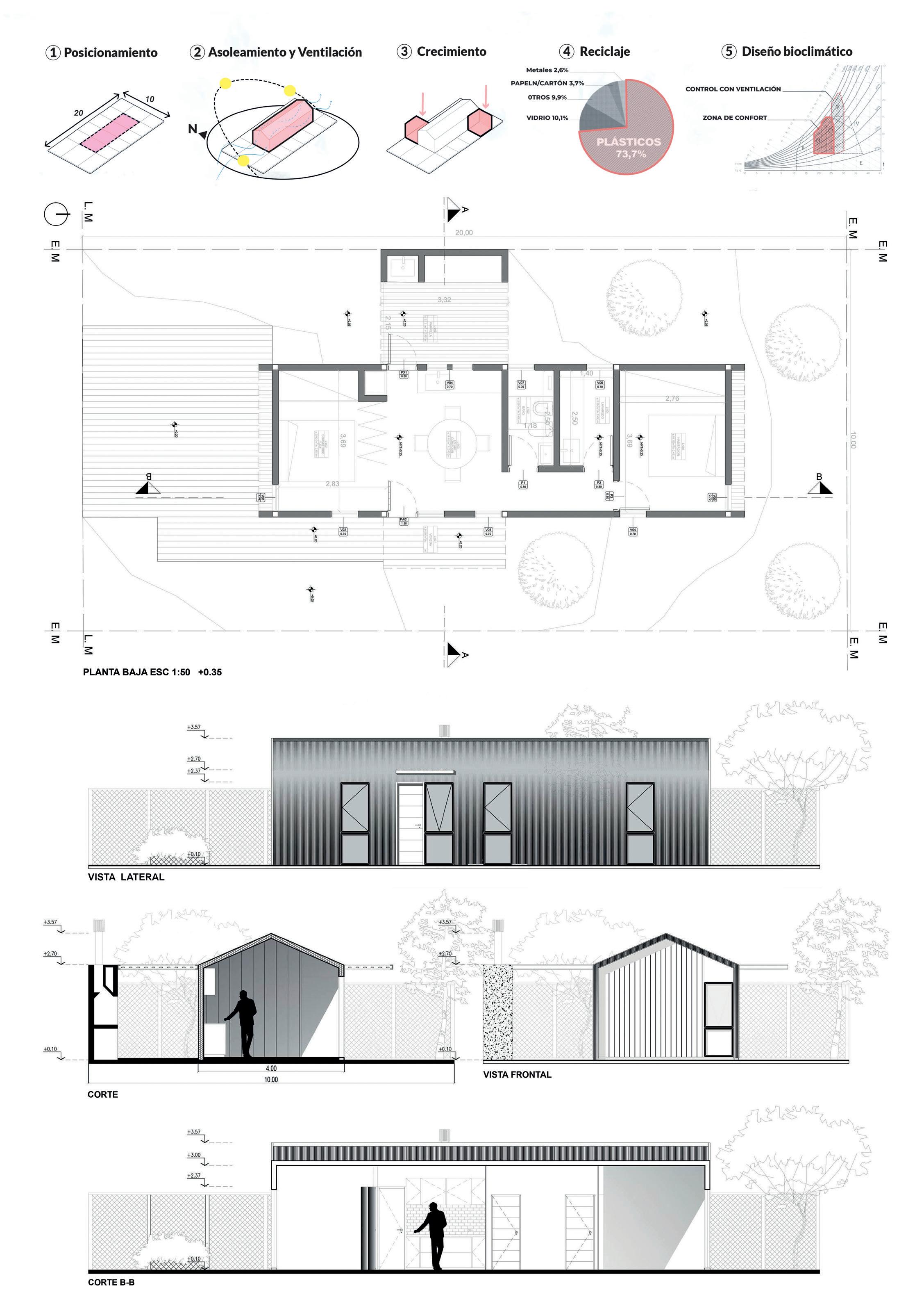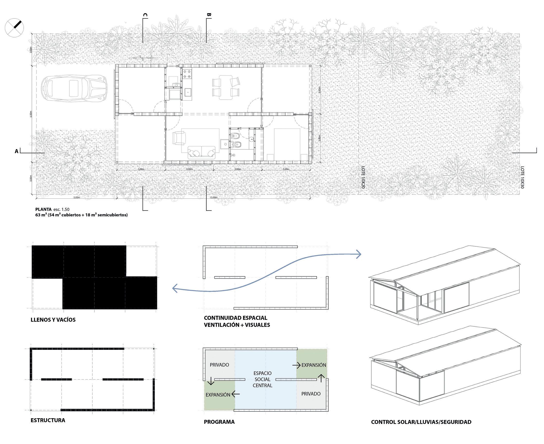 La parte y el todo / lo cerrado y lo abierto Se propone un sistema, una caja modular adaptable. Un cuerpo inicial con las necesidades básicas que se organiza en 60 metros cuadrados, se transforma en el tiempo y muta hacia la condición de una vivienda en dos niveles que abastece a cualquiera de los diferentes tipos de la diversidad familiar actual. El módulo inicial propone una primera obra húmeda de platea de fundación (con refuerzos) y dos muros de fábrica de ladrillos desfasados entre sí en los bordes laterales del predio. El resto de la vivienda puede ser ar-