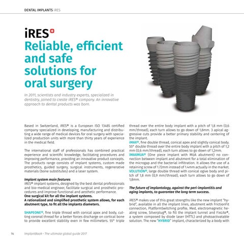 Based in Switzerland, iRES® is a European ISO 13485 certified company specialized in developing, manufacturing and distributing a wide range of medical devices for oral surgery with specialized production units with more than thirty years of experience in the medical field. The international staff of professionals has combined practical experience and scientific knowledge, facilitating procedures and improving performance, providing an innovative product concepts. The products range consists of implant systems, custom made prosthetics, guided surgery, surgical instruments, regenerative materials (bone substitutes) and a laser system. Implant system main features iRES® implant systems, designed by the best dental professionals and bio-medical engineer, facilitate surgical and prosthetic procedures and improve functional and aesthetic performance. One surgical kit for all the implant systems. A rationalized and simplified prosthetic system allows, for each abutment type, to fit all the implants diameters. SHAPEONE®, fine triple thread with conical apex and body, cutting coronal thread for a better forces discharge on cortical bone to provide excellent stability even in few millimeters. 55° triple 14